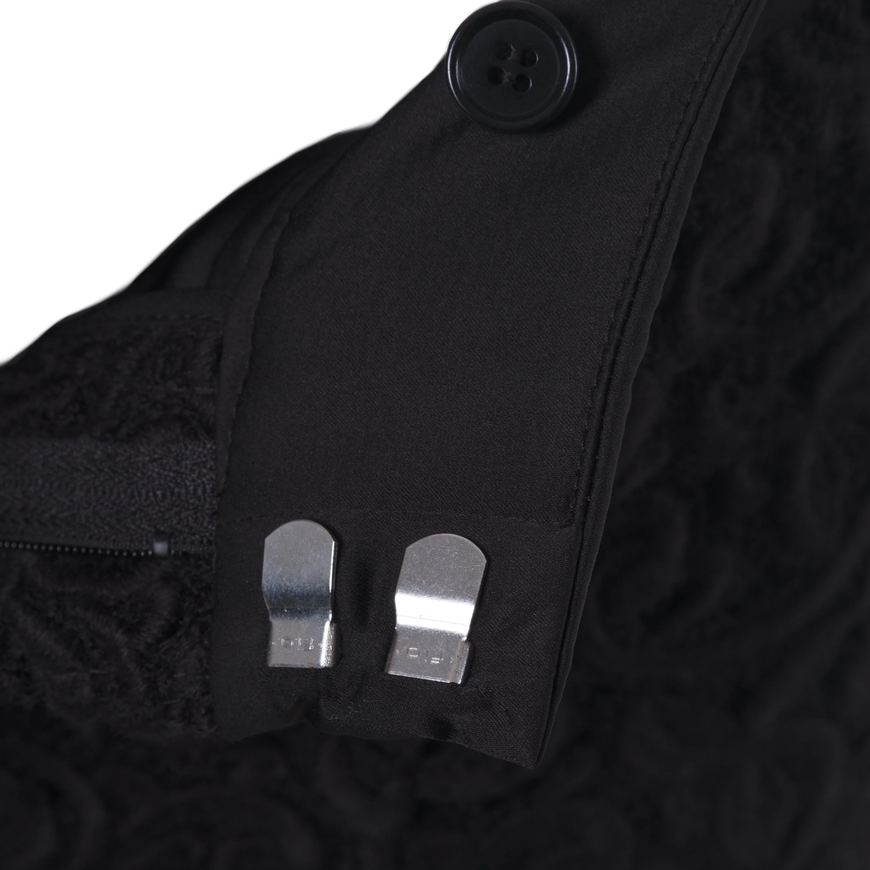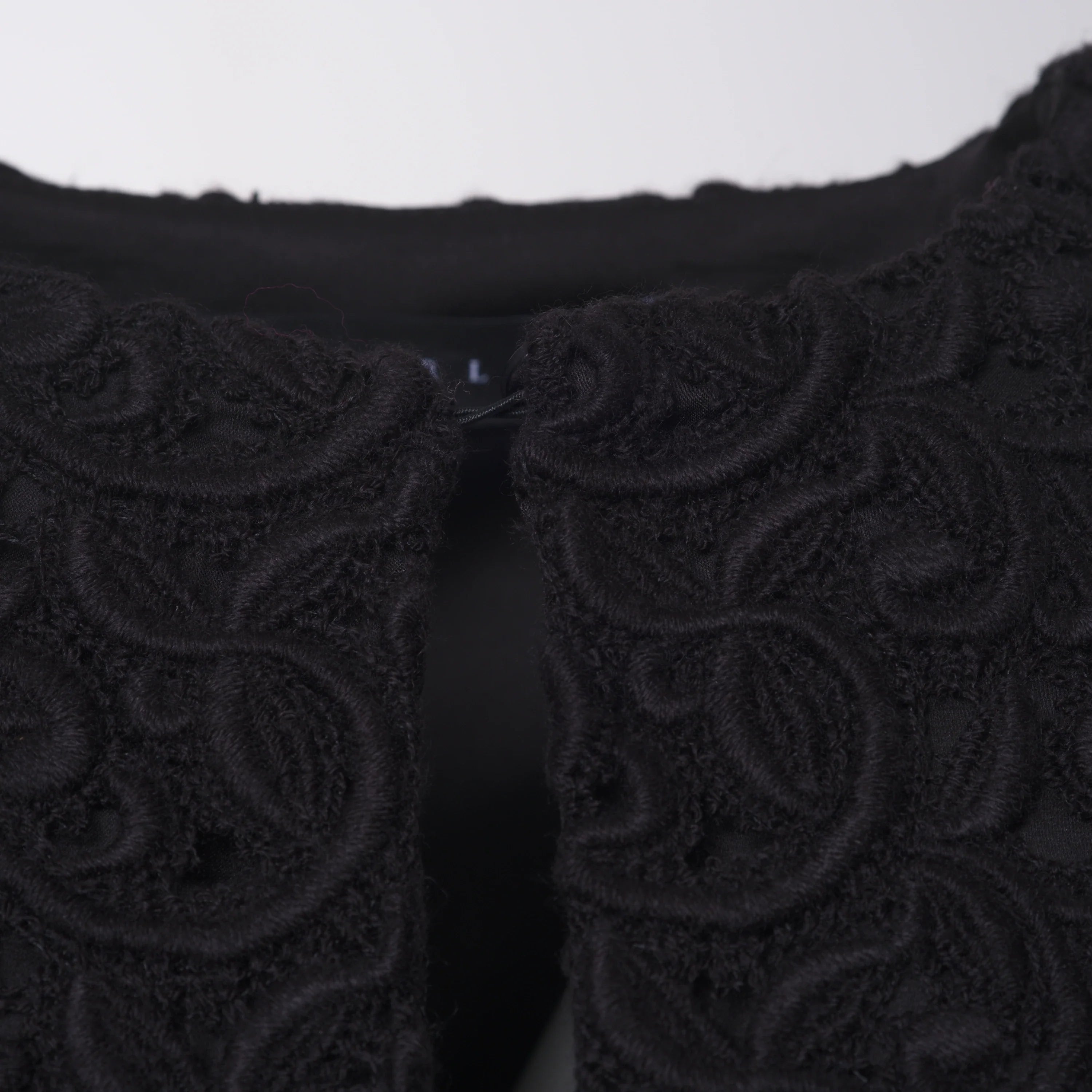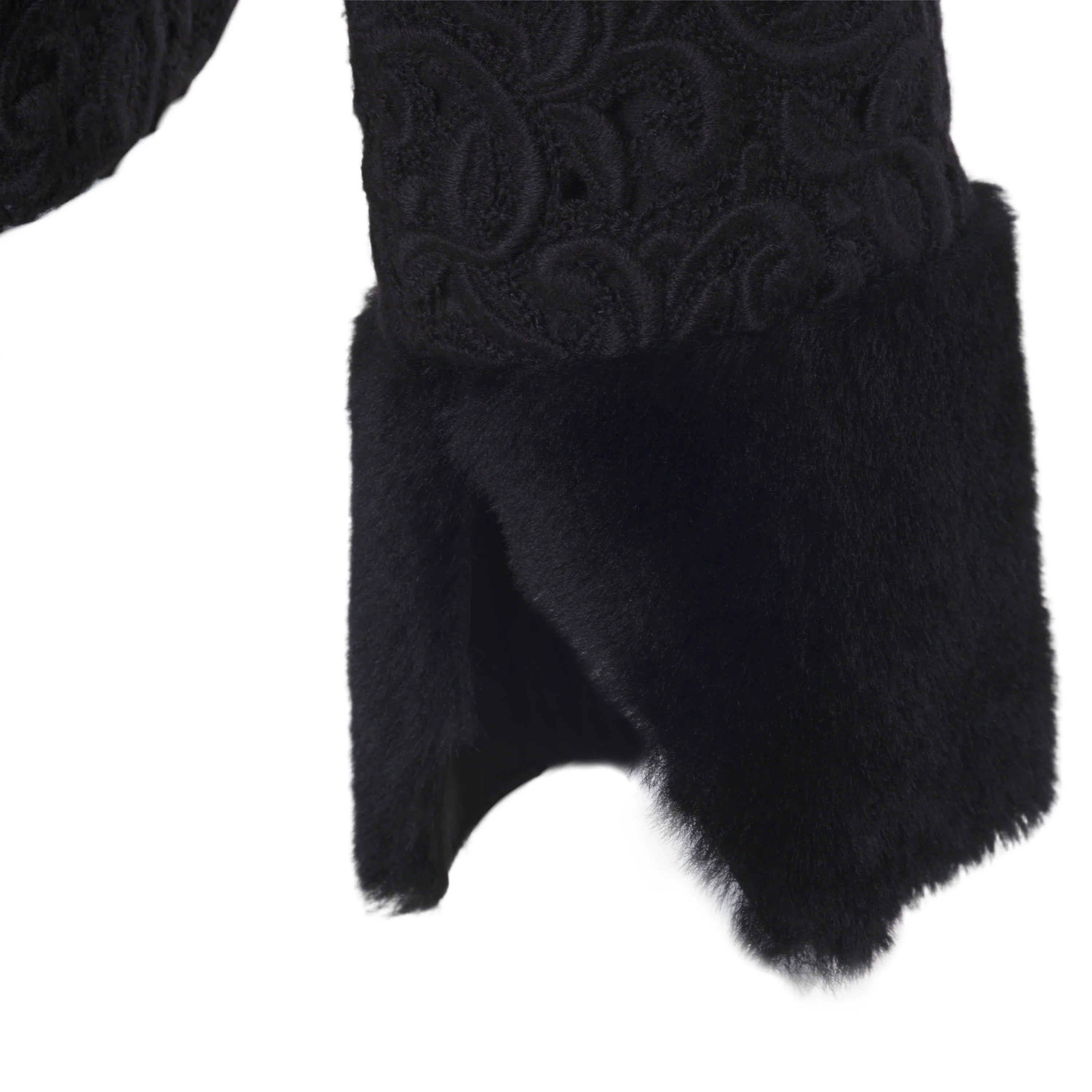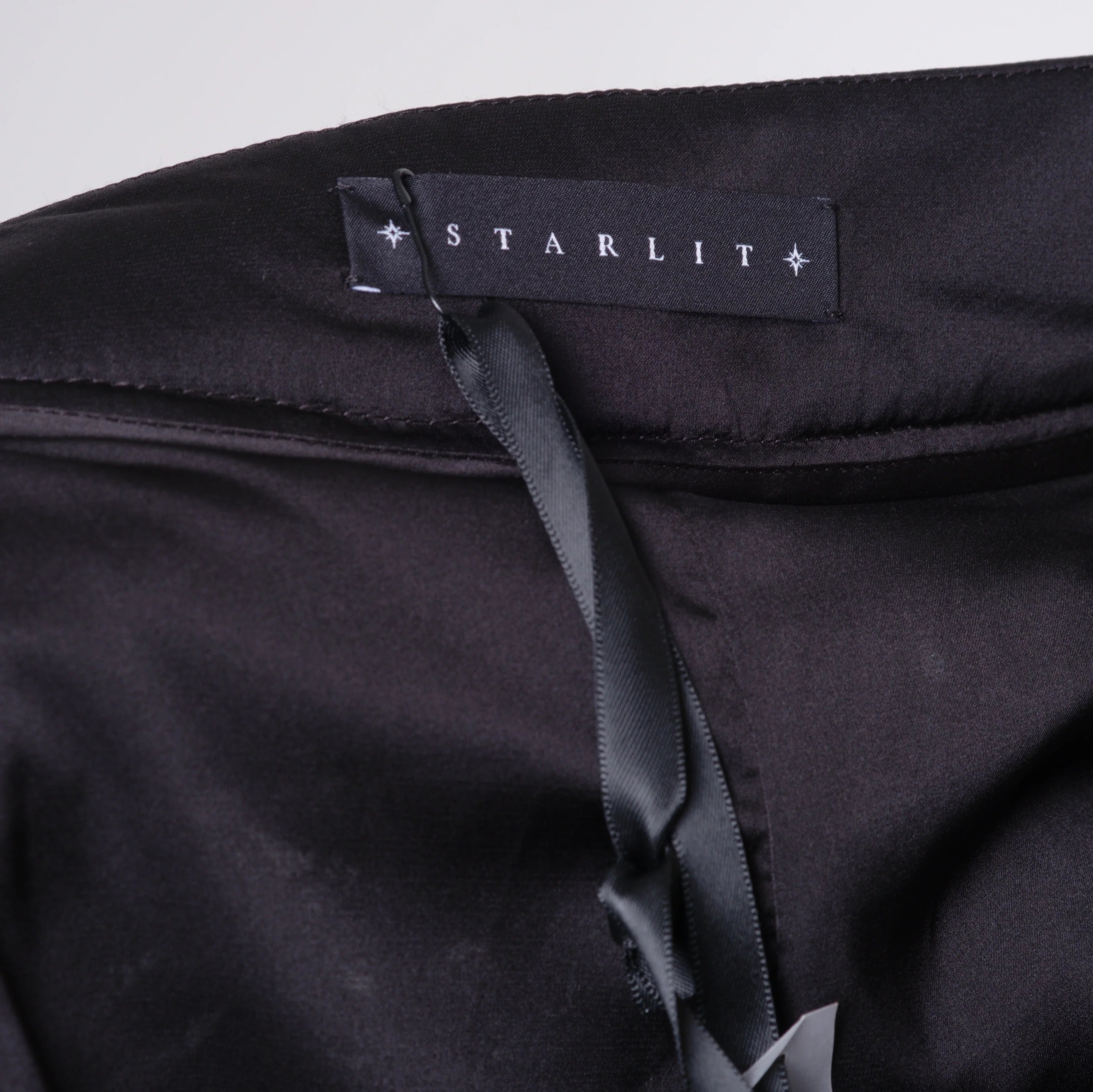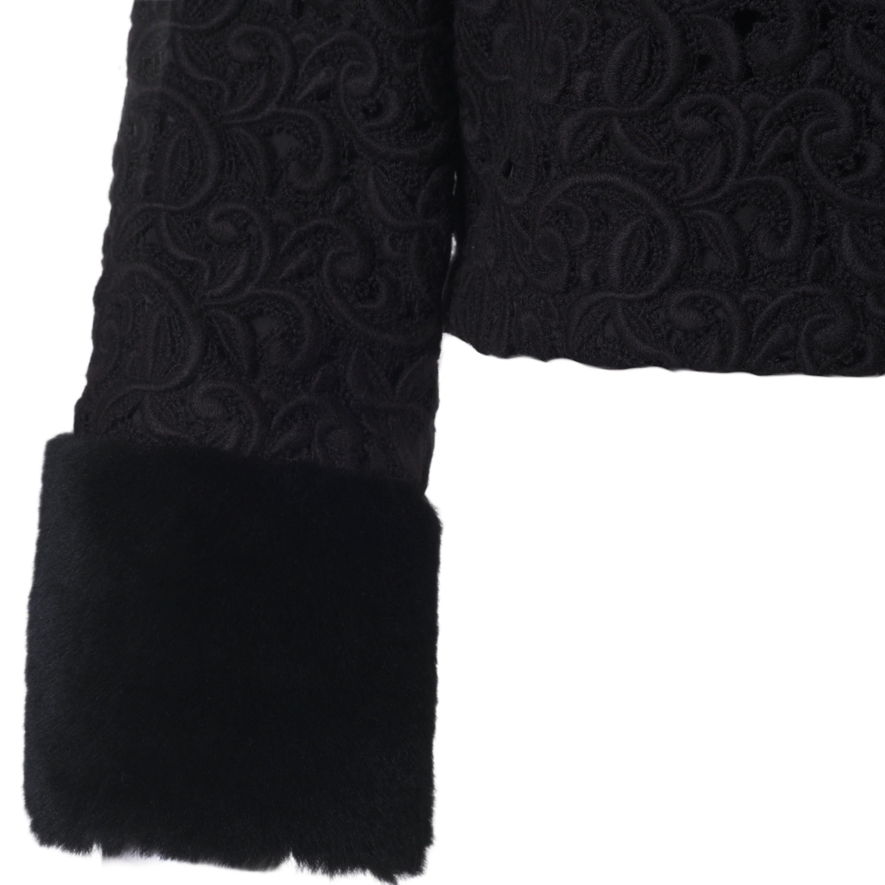 This Starlit set brings together a jacket and trousers in a balance of clean lines and refined textures. The jacquard fabric, worked in relief, adds depth to the black tone and defines a sober yet distinctive aesthetic. The jacket features a clean neckline and long sleeves finished with contrasting cuffs, subtle details that add character without disrupting the harmony of the design.