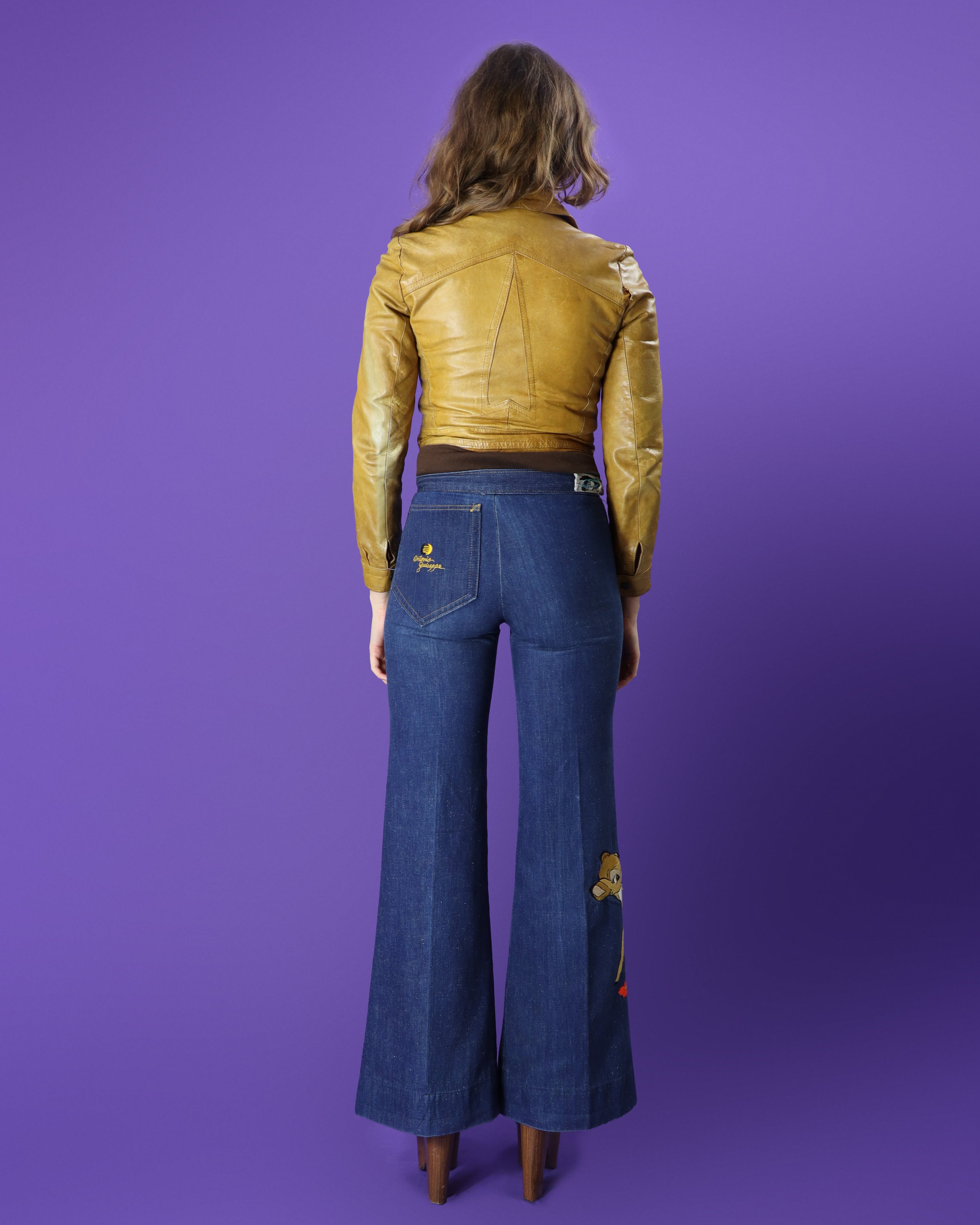 Fantastic vintage 1970s denim flares by iconic LA based brand Antonio Guiseppe, designer Philip Havice. Part of an official collaboration with Disney. Featuring a beautiful embroidery of Bambi on the side of the flare. High quality dark indigo denim cut high waisted with a bell bottom flare, featuring AG branding on the back pocket. Super cool & rare piece of fashion history!