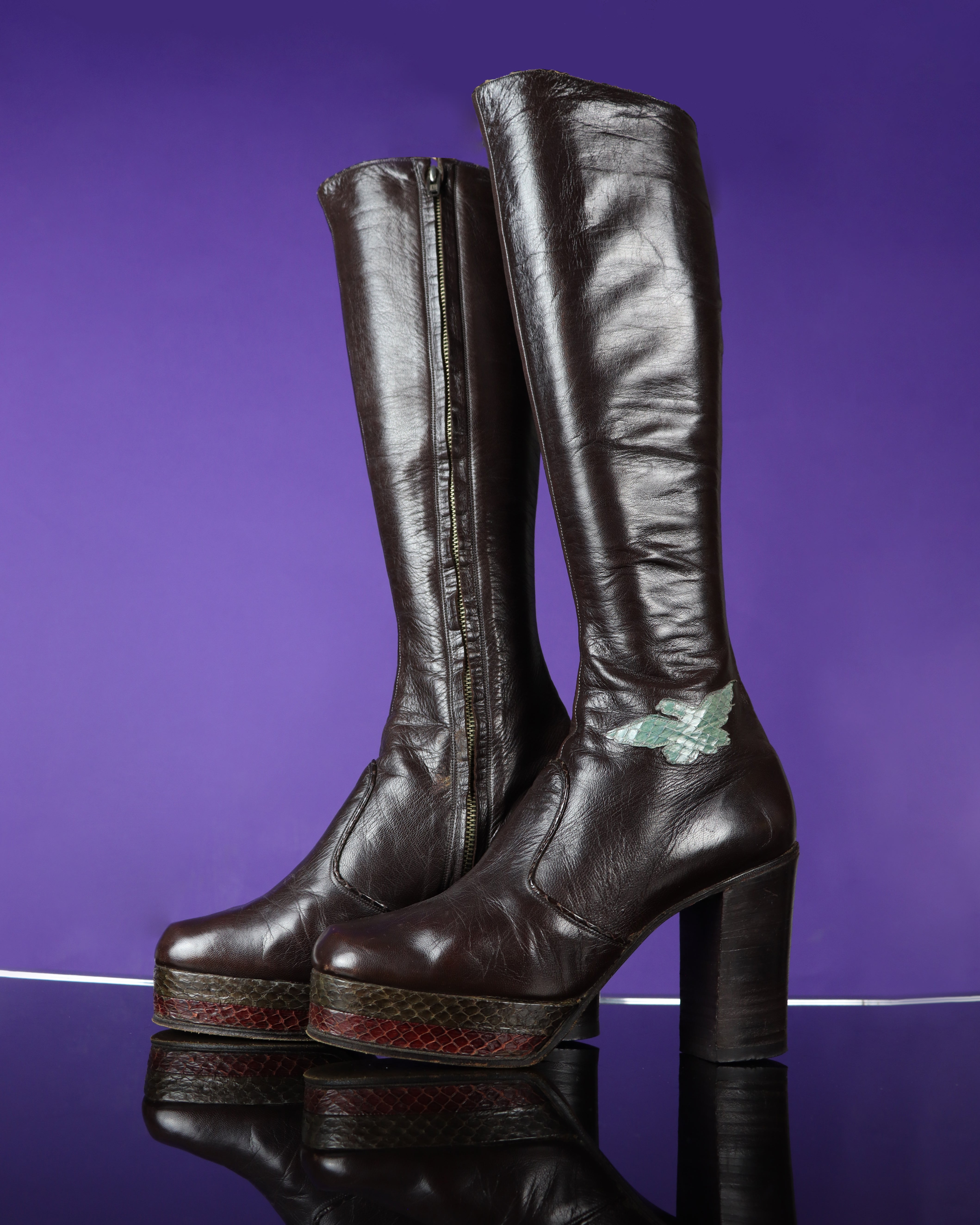 Incredibly rare and even more beautiful- these vintage 1970s platform boots by iconic and collectible label 'Chelsea Cobbler'. Made c.1967-68. A rock and roll relic and a true piece of fashion history. The boots feature a fabulous whimsical bird flying across each ankle in mint green snakeskin, and a front stacked platform with pink and khakin snakeskin panels. These boots are SO beautifully crafted with highest quality dark brown shiny leather, stacked block heel, sleek squared toe, knee high length, heavyweight zipper and tan leather lining. In treasured condition.