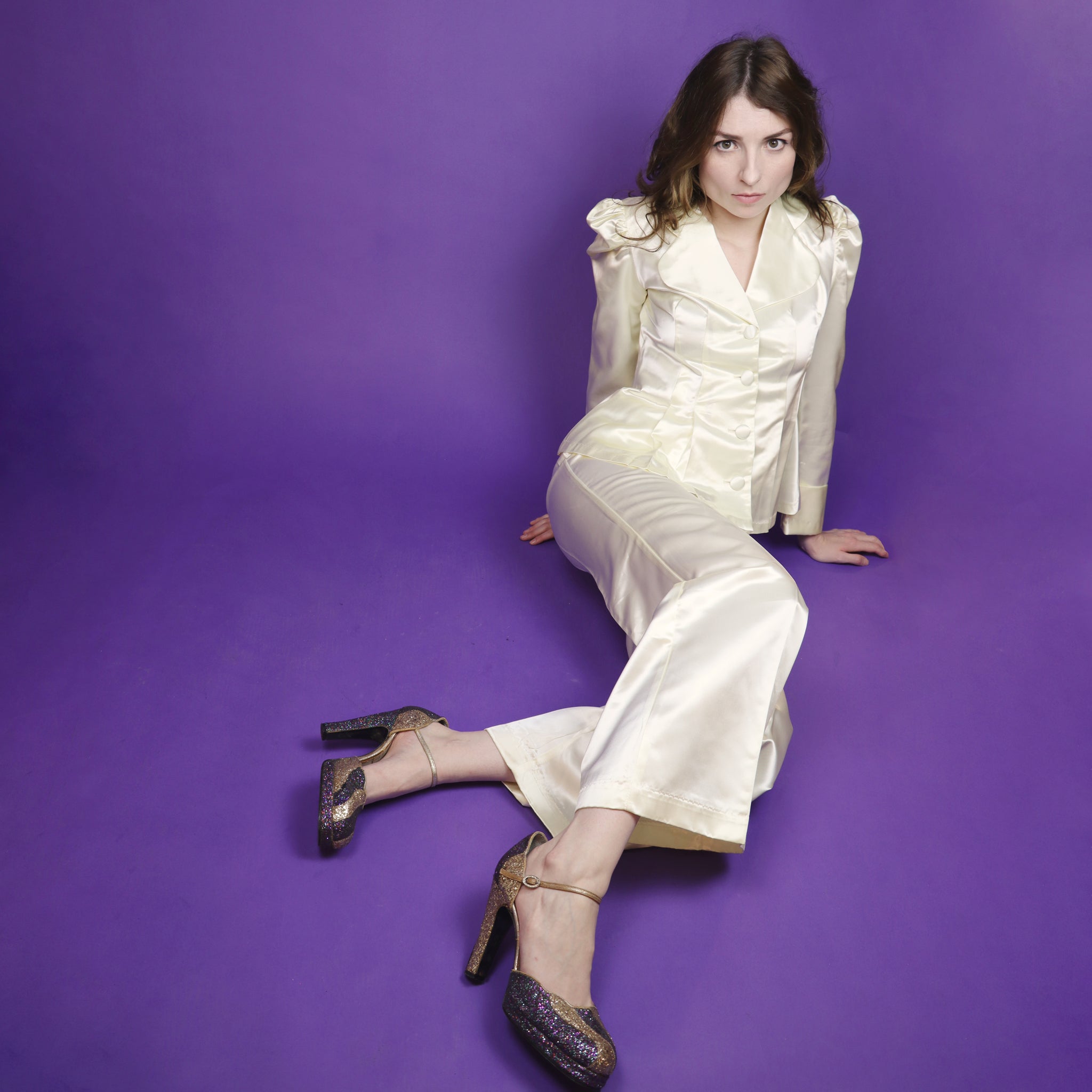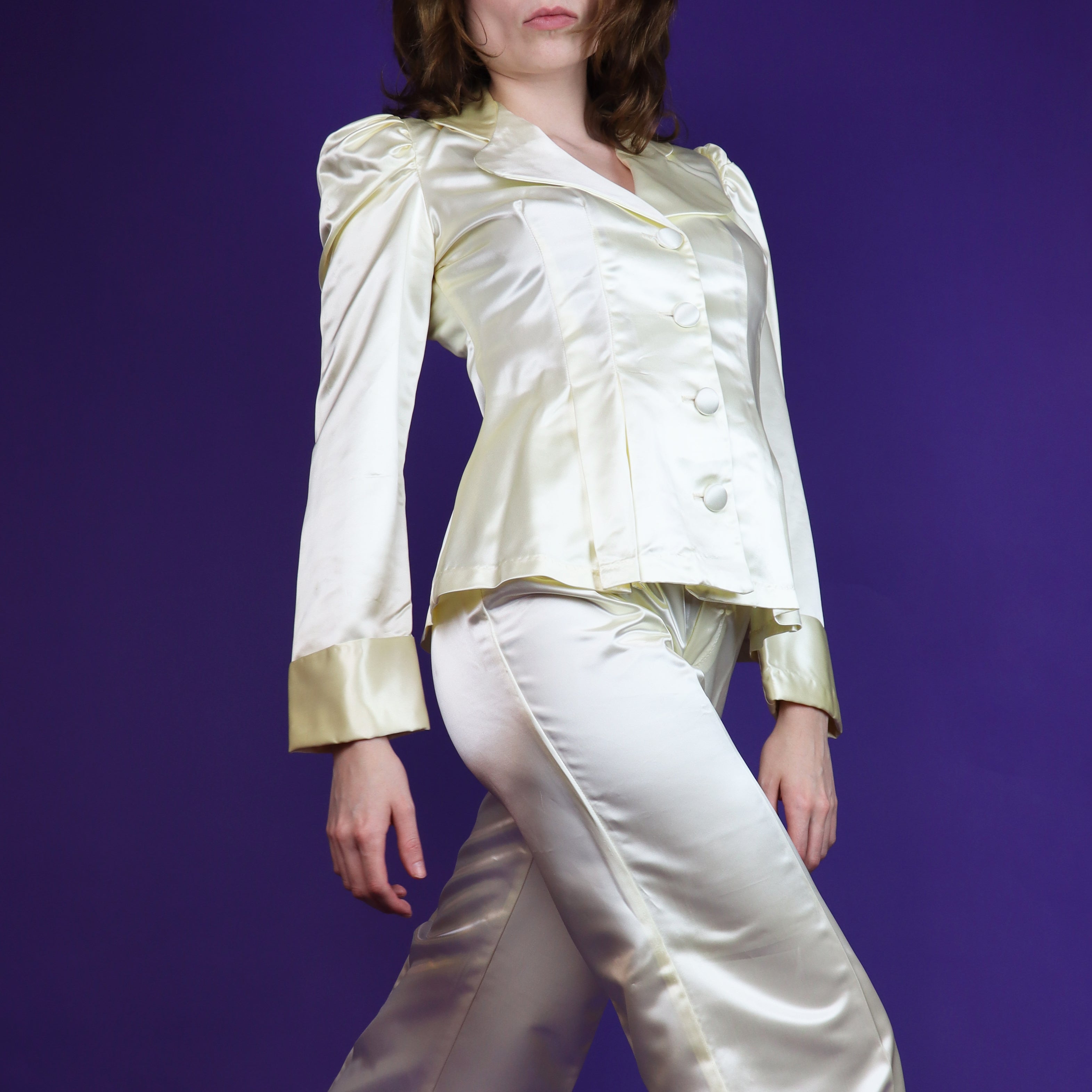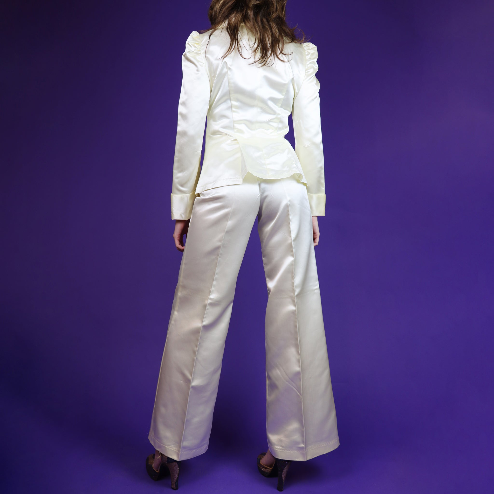 Luxurious vintage 1970s ivory sateen trouser suit. Made from a slinky satin-feel material with a lustrous shine. This suit was beautifully made with clever, form flattering pattern cutting; accordion pleating, puff sleeve shoulders, a cinched in waist with bustle style pleating at the back and high waisted palazzo style flares. Features self covered buttons, cuffed sleeves, narrow belt loops and a wide rounded lapel. Super rare & ultra chic party piece! Appears to be in unworn, deadstock condition.