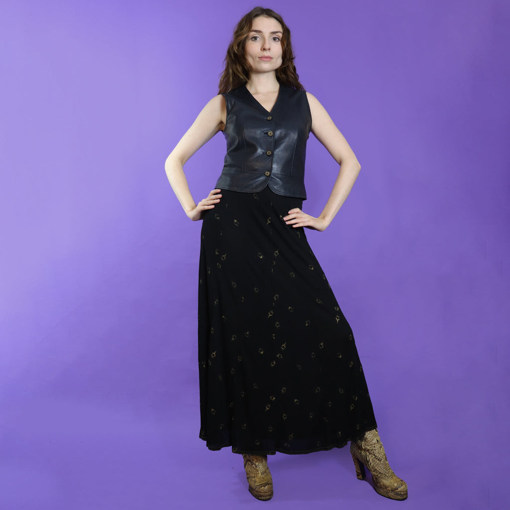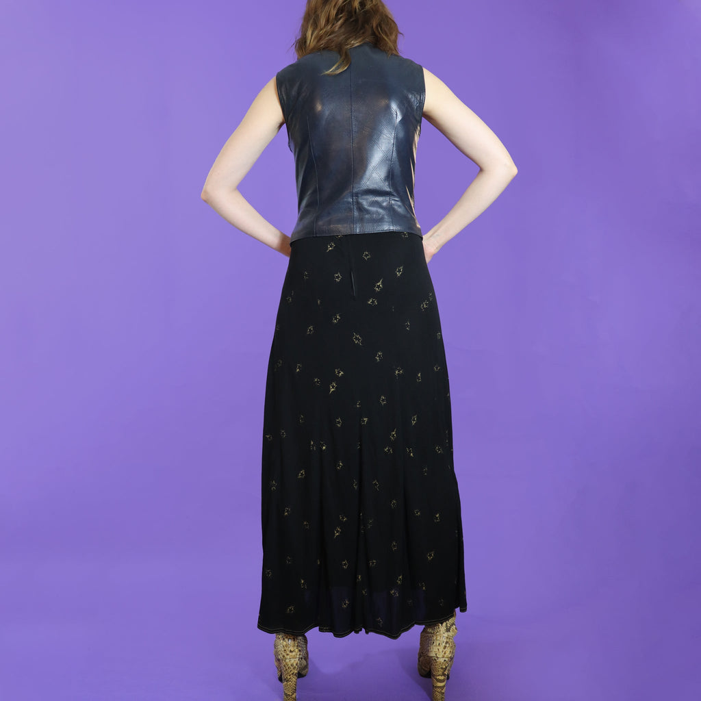 Vintage 1970s butter soft leather vest by Loewe. Inky blue beautiful velvet with punched hole pattern all over. Gorgeous gold emblem buttons and clever flattering cut. Incredible condition, super rare collectors item.