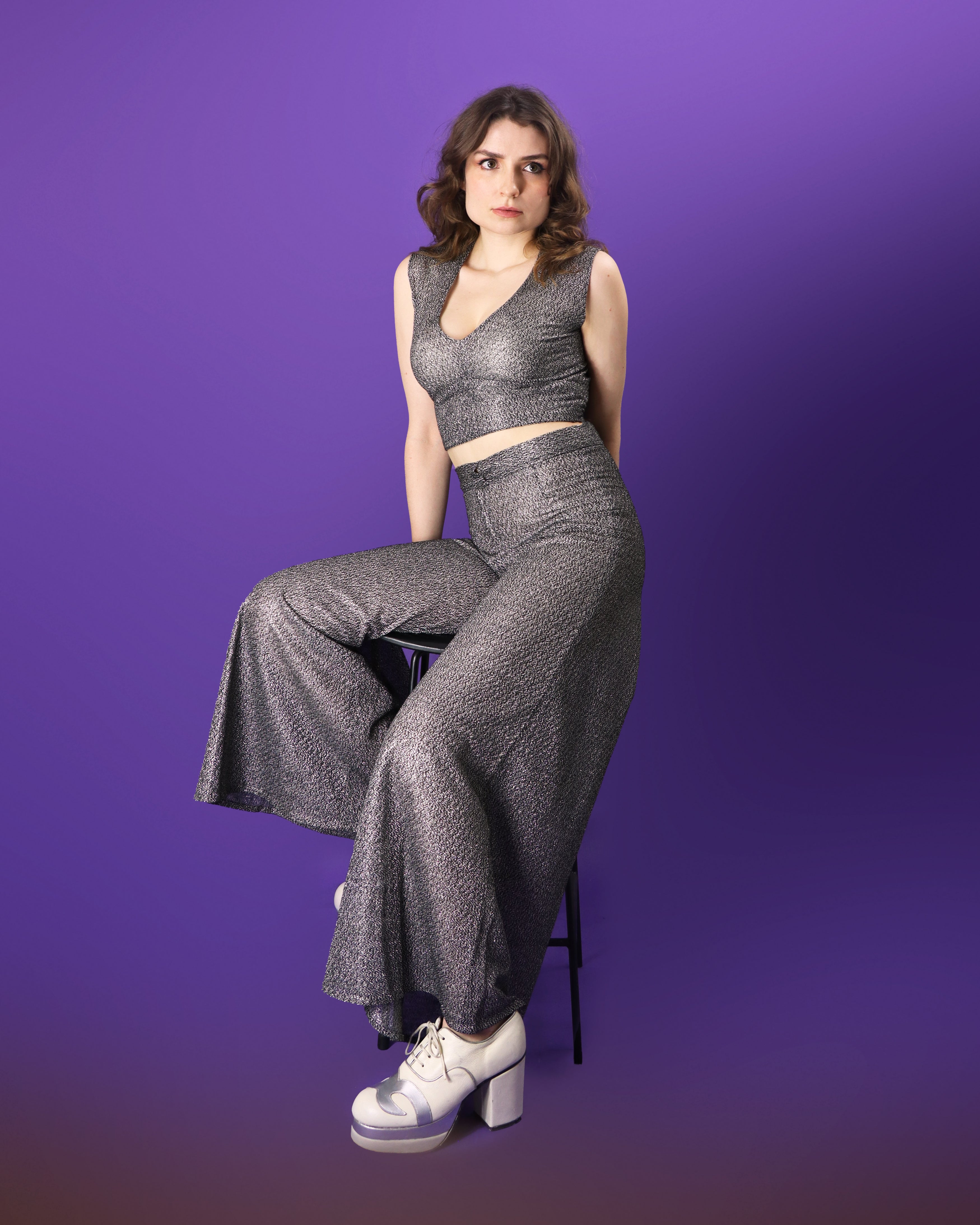 Vintage 1970s handmade disco two piece set. Made from a lightweight silver lurex material which is totally mesmerising under the light! This set consists of a sleeveless crop top with deep v neck which closes with a zipper on the back, and a pair of high and tight waisted mega flares with insane a-line cut.