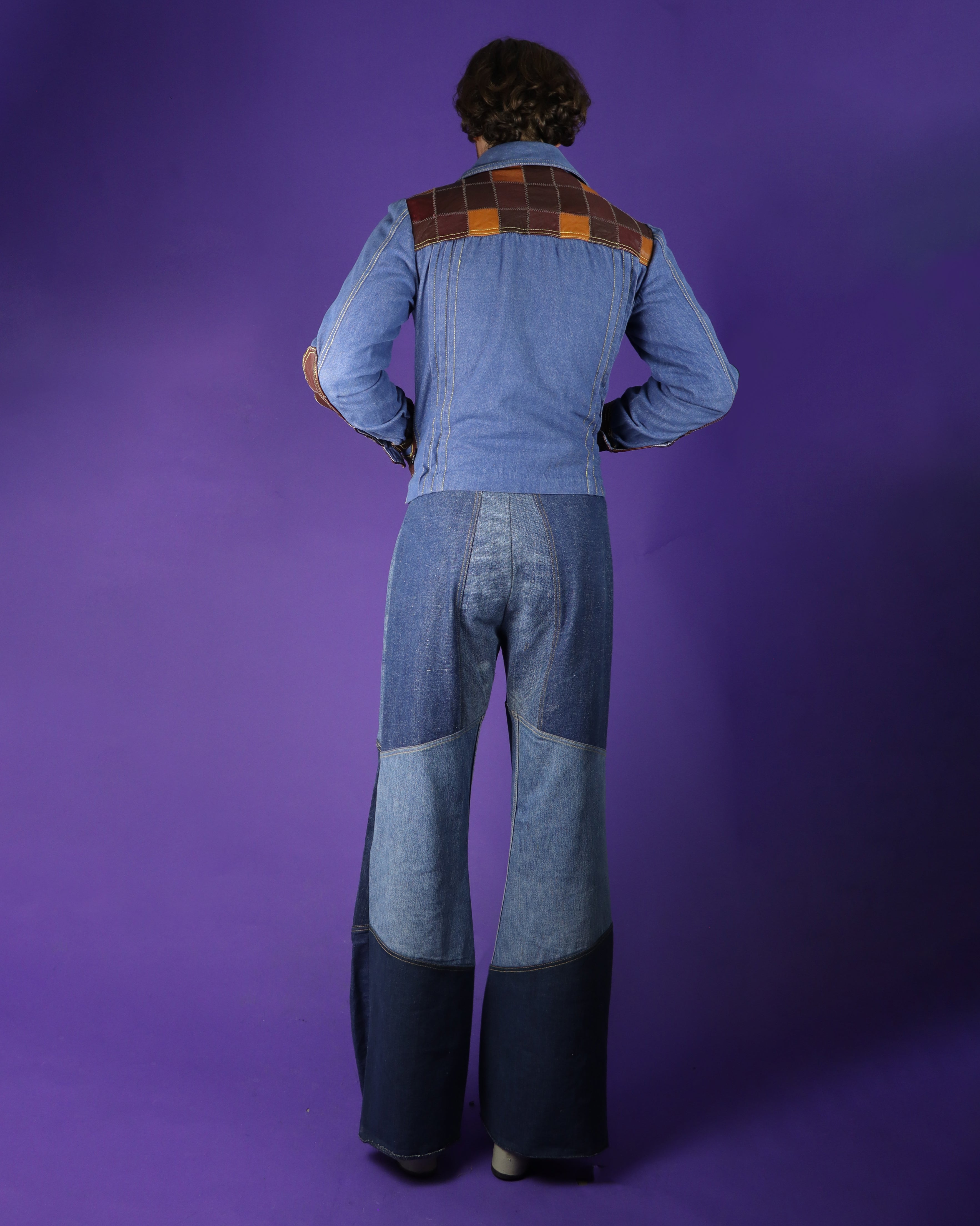 Fantastic vintage 1970s denim trucker jacket by 'Dr Denim & Mr Hide'. Features fabulous cubic patchwork on the yoke, patch pockets and sleeve seams. I love the brown and orange tones against the indigo denim. Beautifully finished with pleated seams at the sides and a dagger collar. Super special jacket!