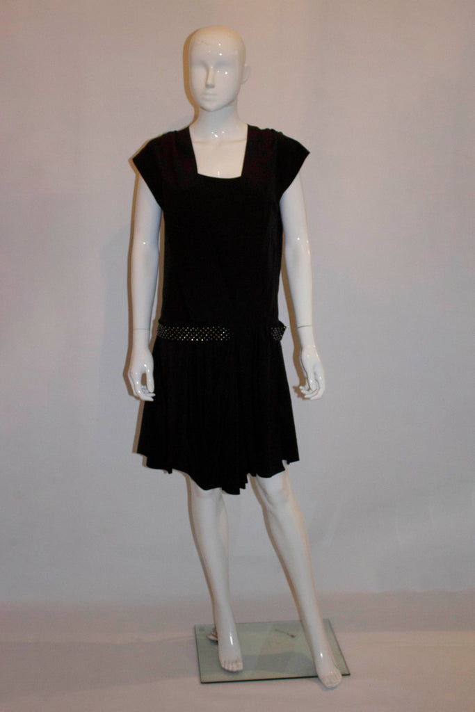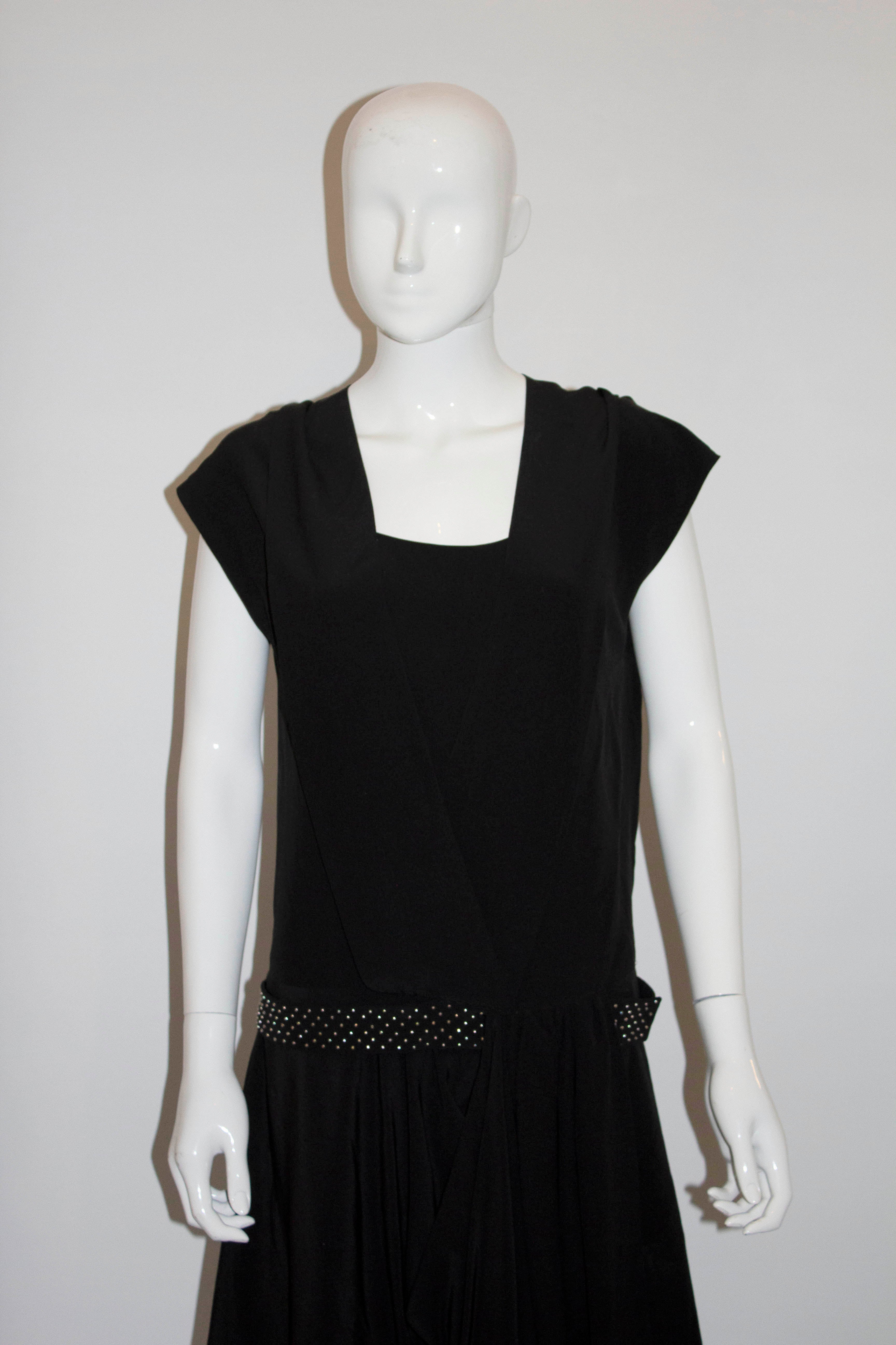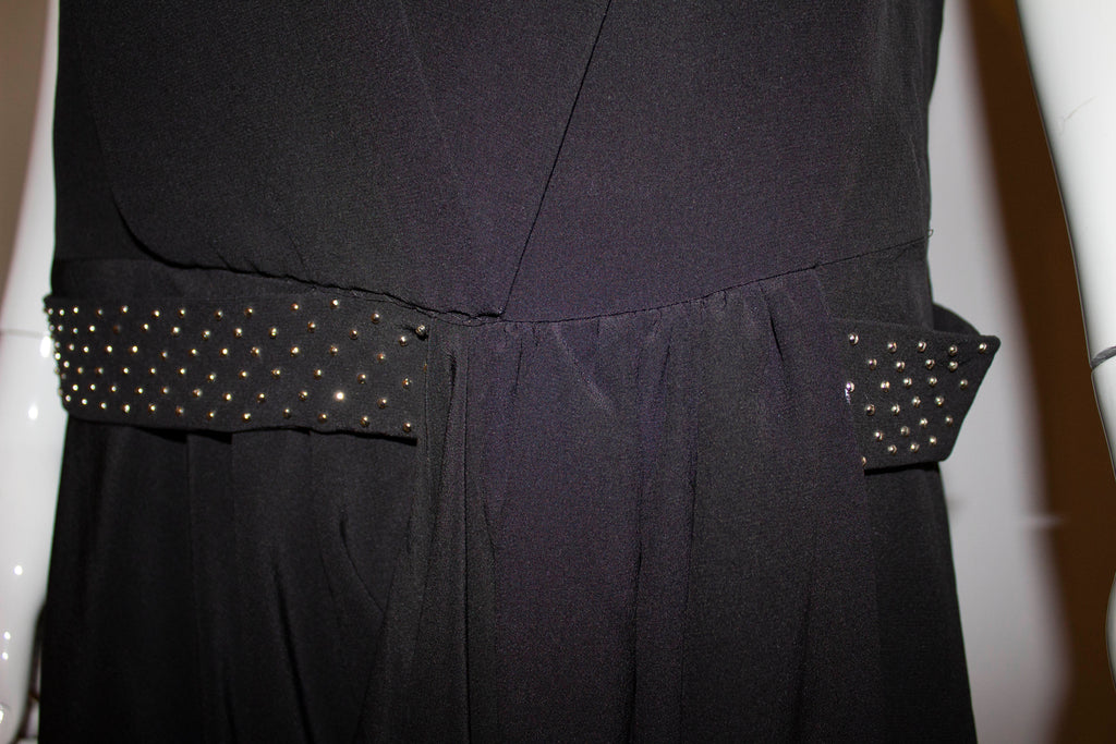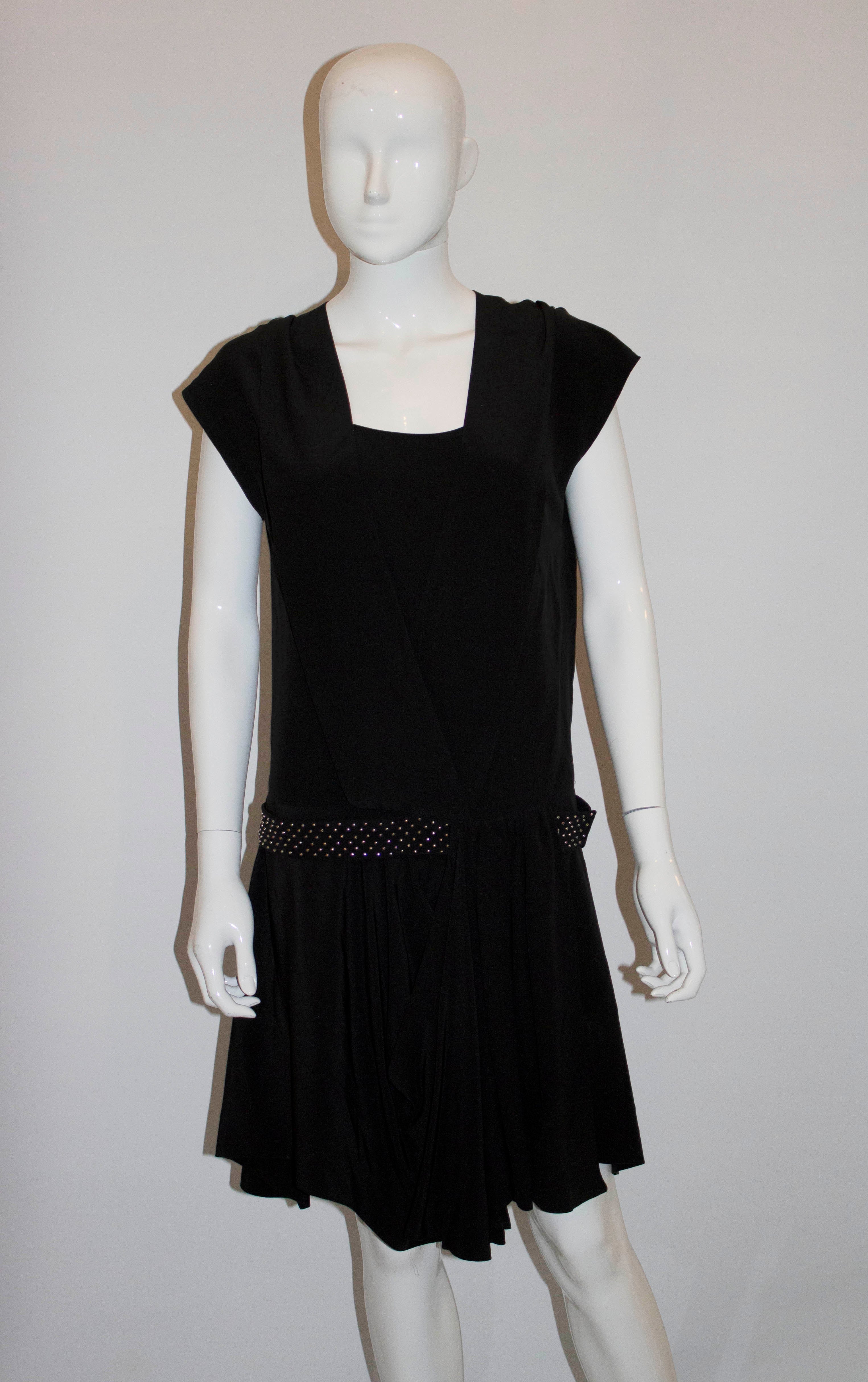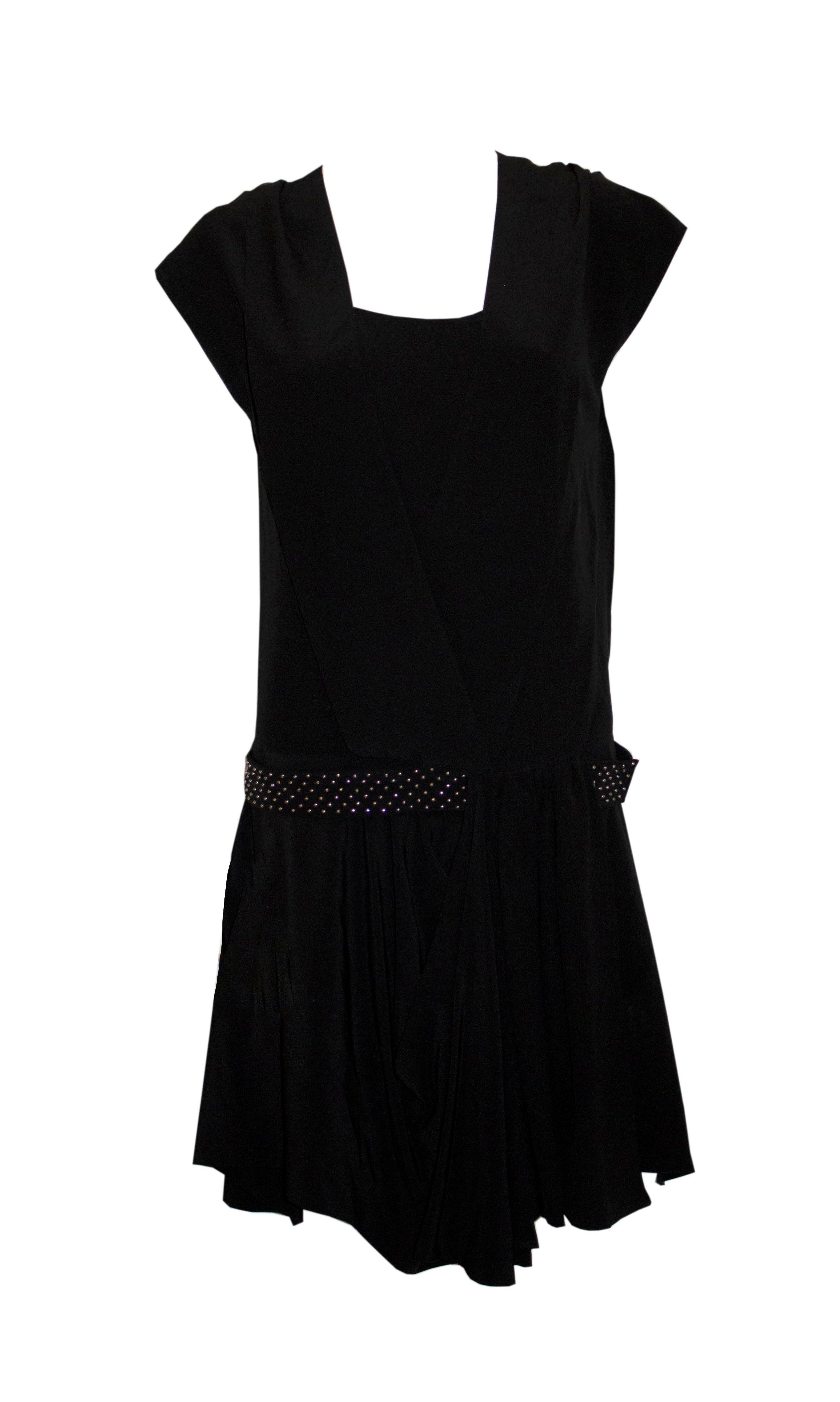 A head turning vintage black silk dress by Chloe. The dress has a low square neckline and over layer of silk. It has a drop waist and a studded silk belt. Size 38 , Measurements: