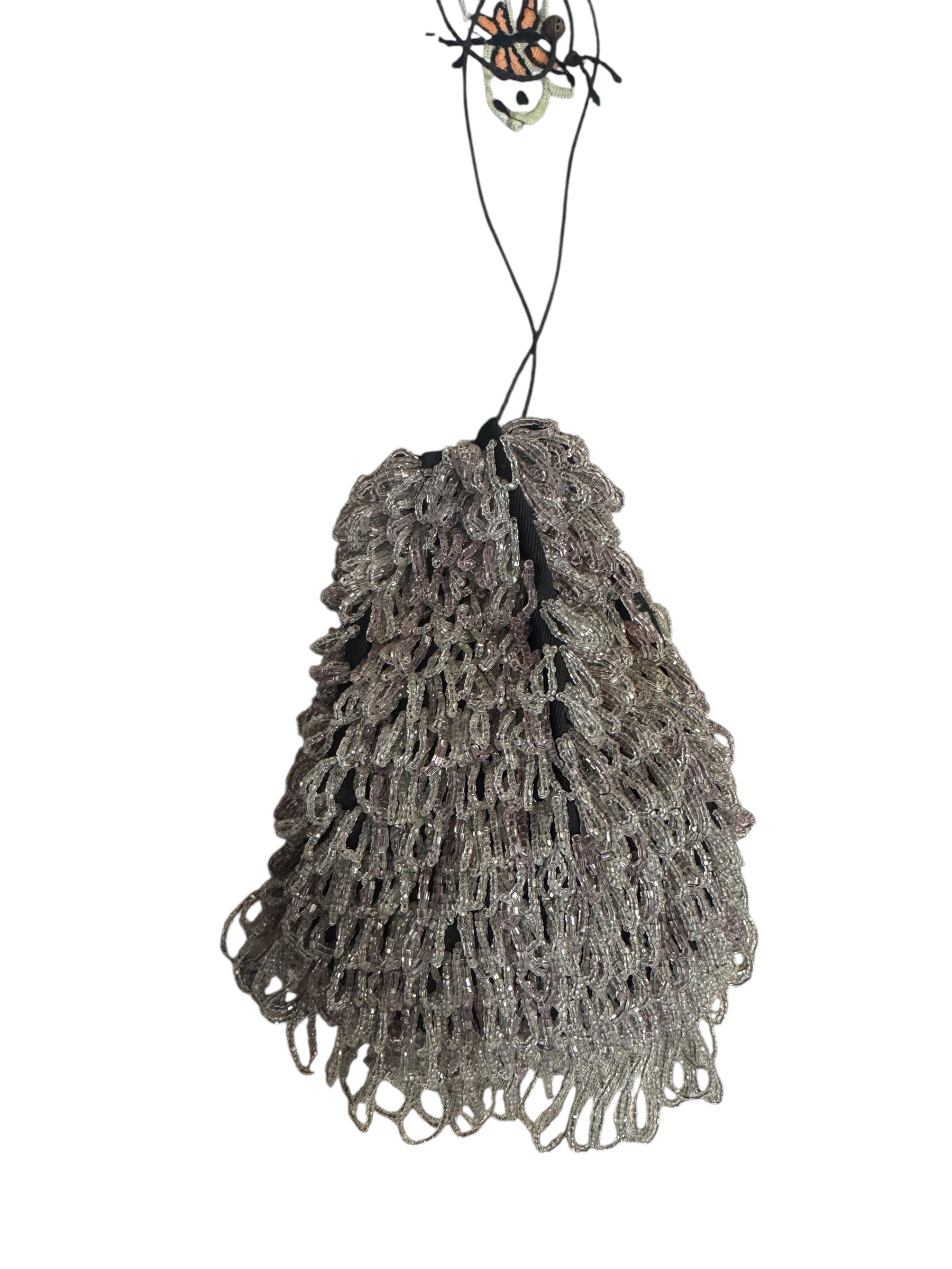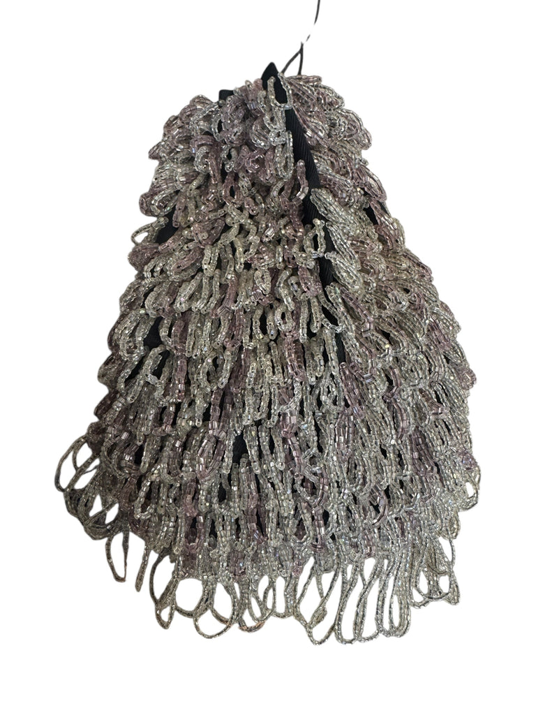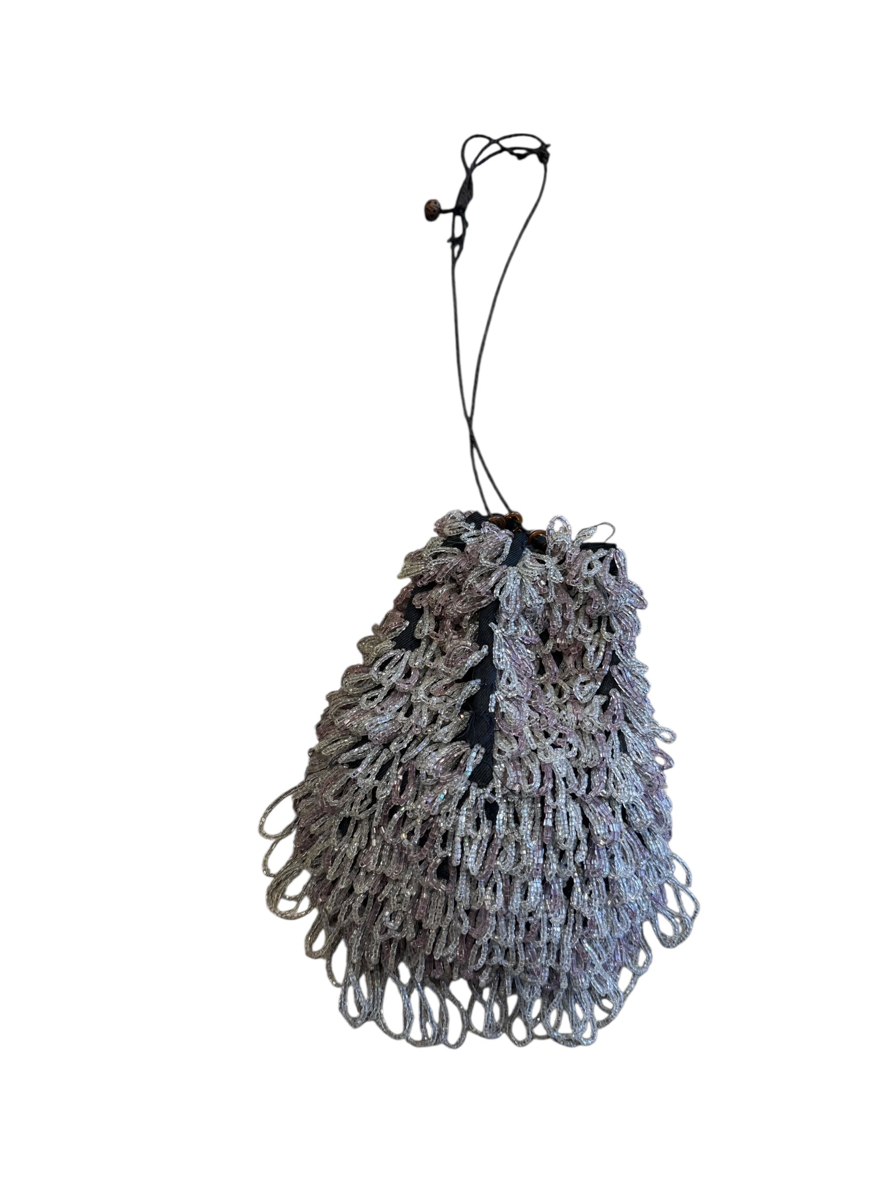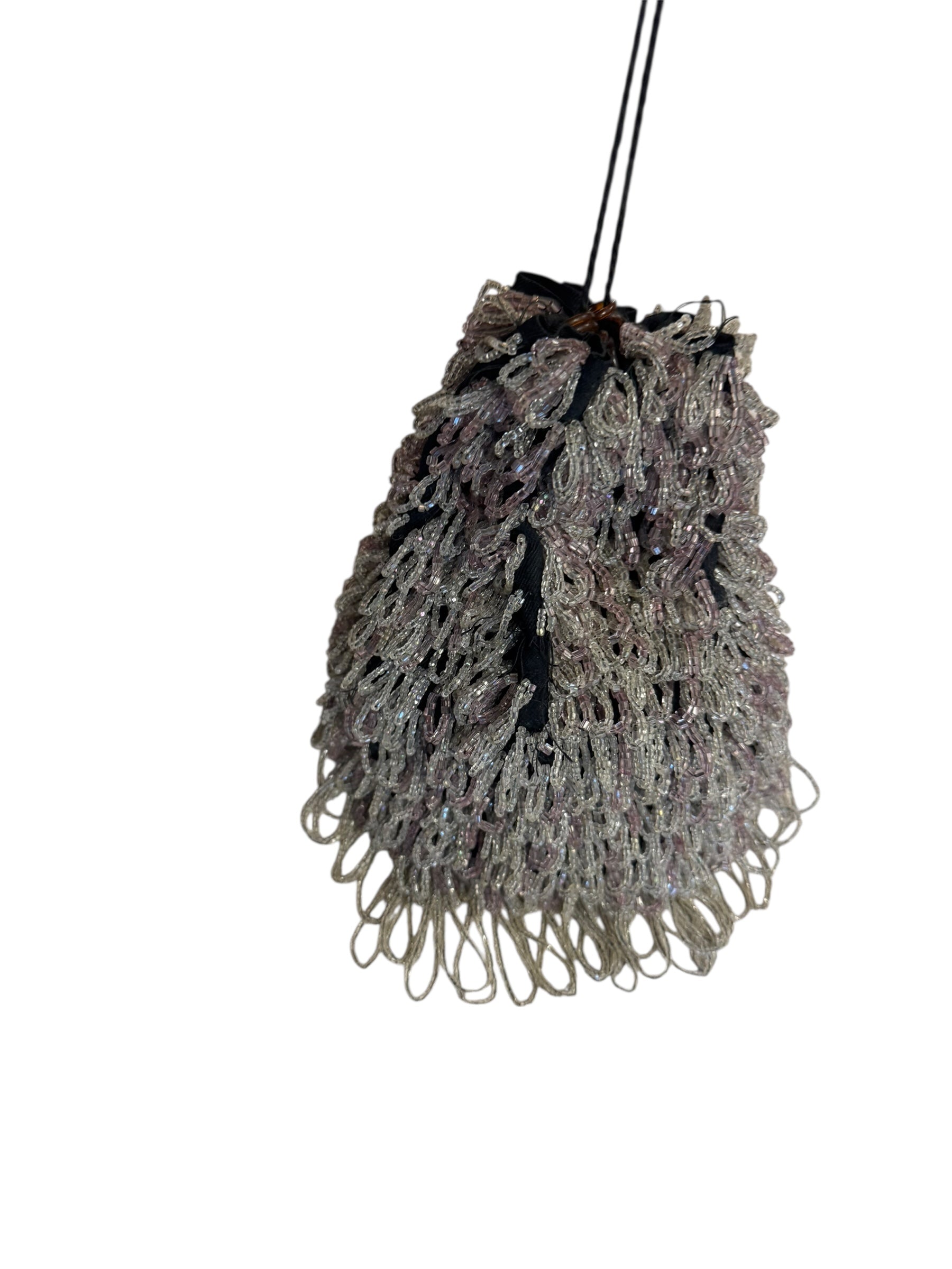 This 20s silver beaded drawstring handbag is a true gem of a bag. Featuring an original 30s design, this bag is crafted with silver glass beads and a sleek black cord. With a bucket design, it's both elegant and functional. Fits a phone and a lipstick or keys.