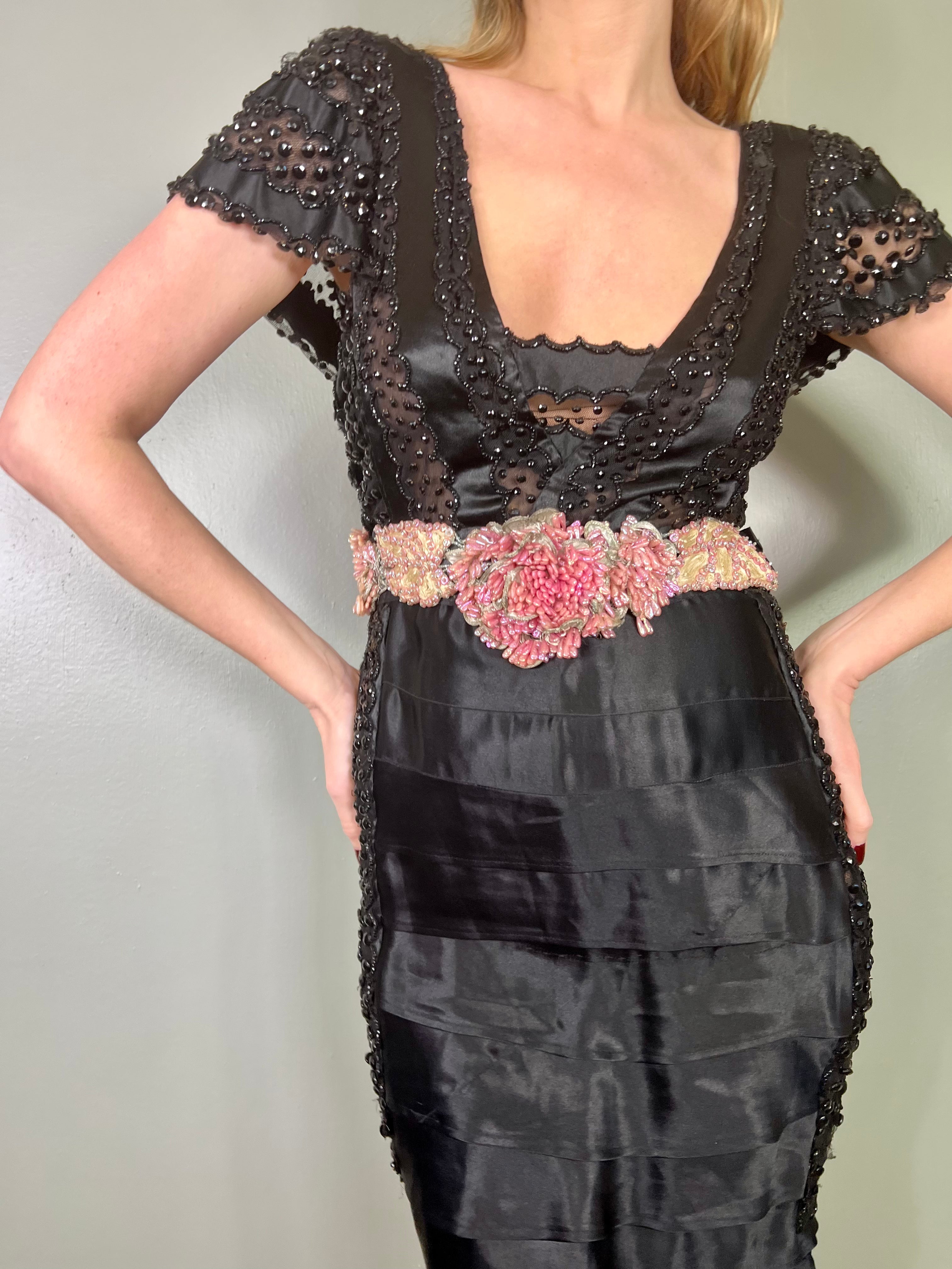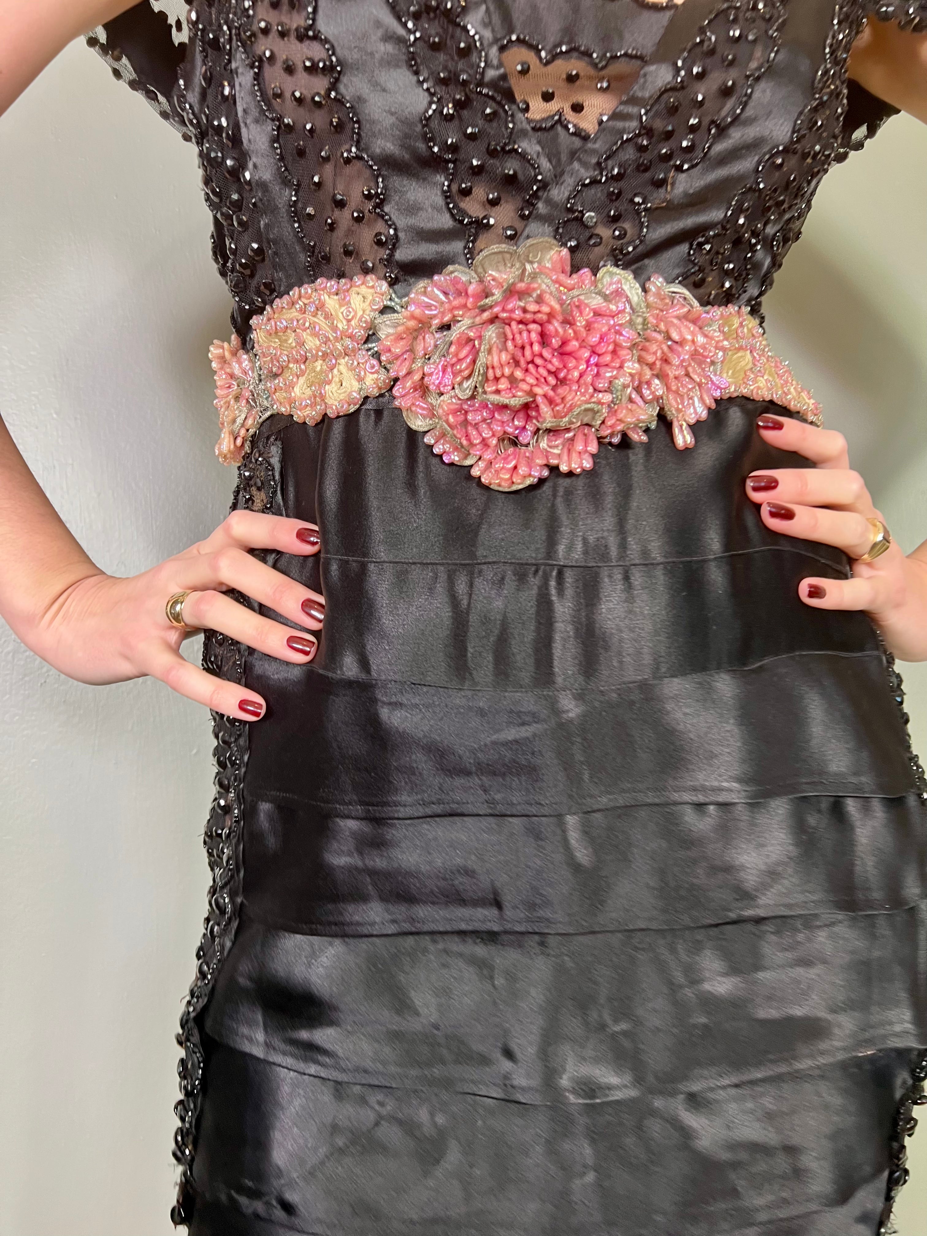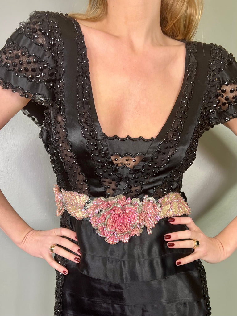 Incredible 30s dress made from a salvaged and restored silk and sheer beaded bust. Has a beaded pink scale and leaf like belt and a fishtail tiered silk skirt with mirrored sheer beaded inserts on the hips. Fastens on the side with a zip and snap buttons. A truly unique head turner, perfect for a black tie event.