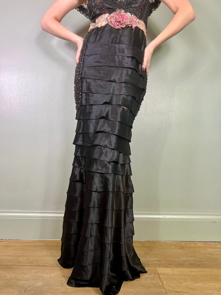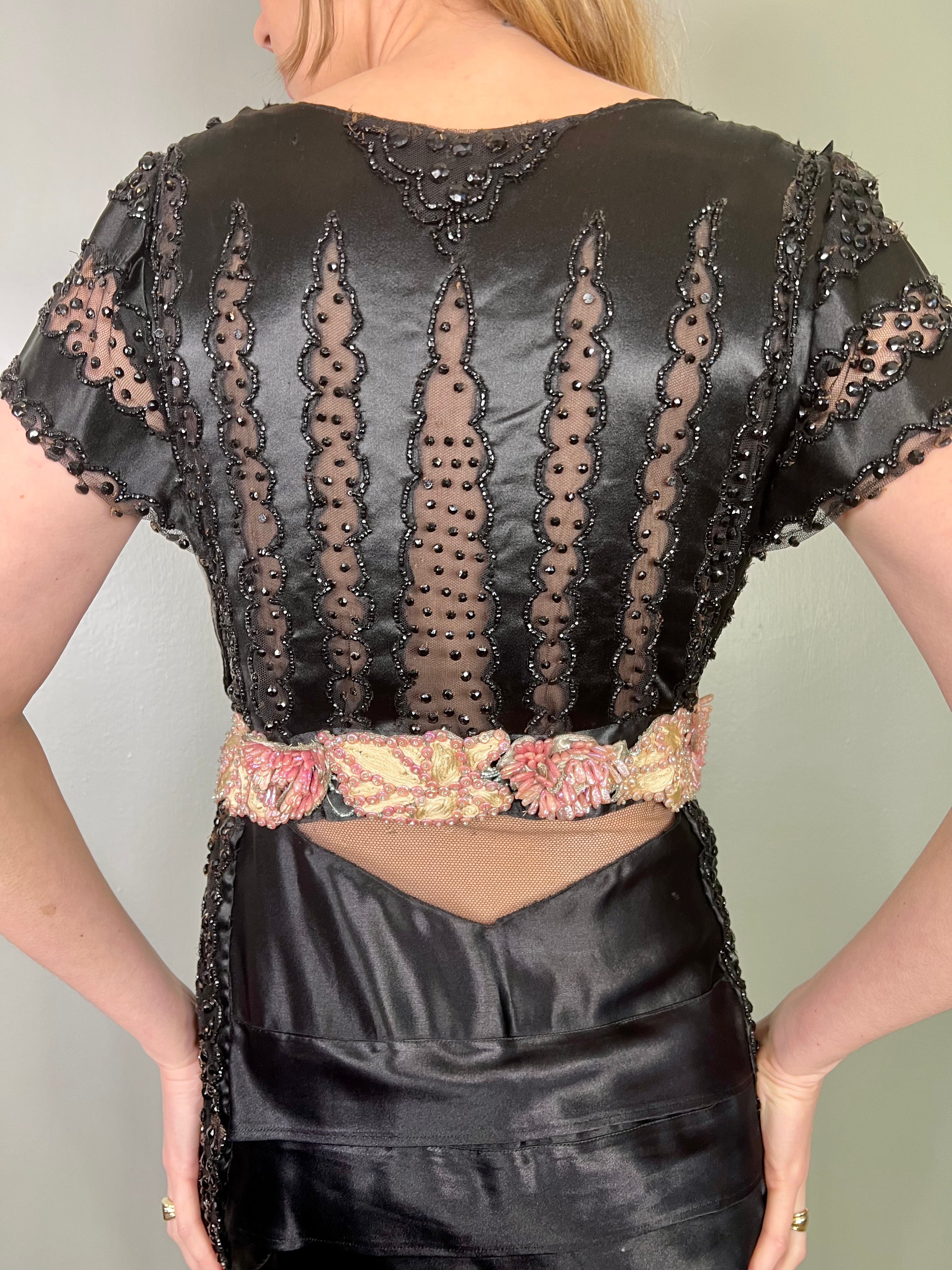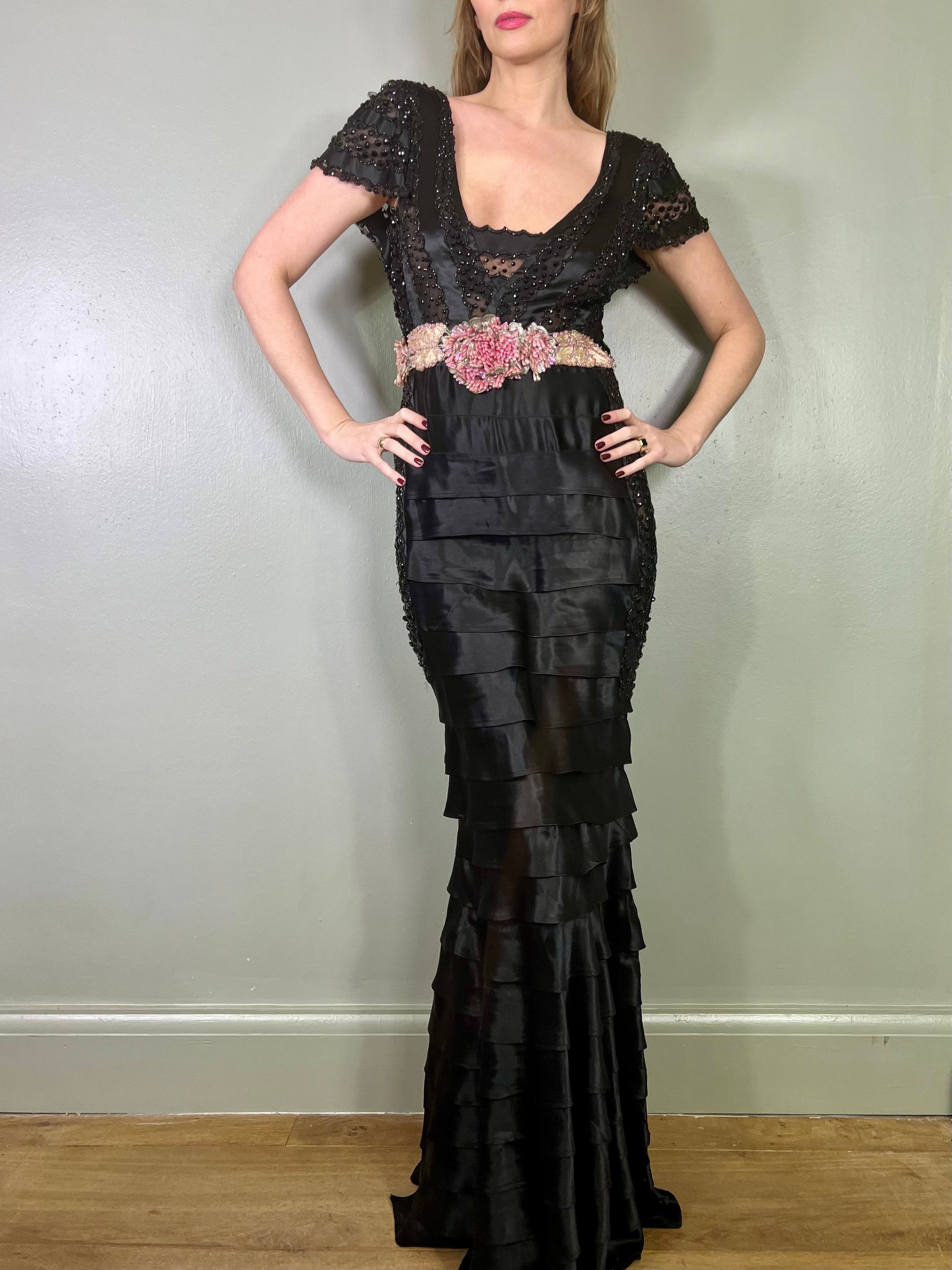 Incredible 30s dress made from a salvaged and restored silk and sheer beaded bust. Has a beaded pink scale and leaf like belt and a fishtail tiered silk skirt with mirrored sheer beaded inserts on the hips. Fastens on the side with a zip and snap buttons. A truly unique head turner, perfect for a black tie event.