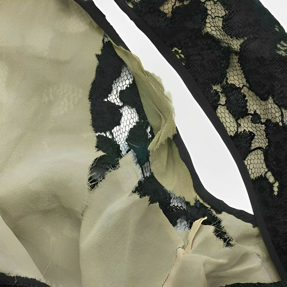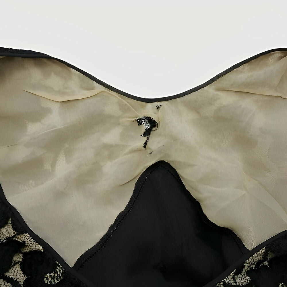 There are tears to the bodice lining, a very few tears to the black lining, and a very few holes to the lace.