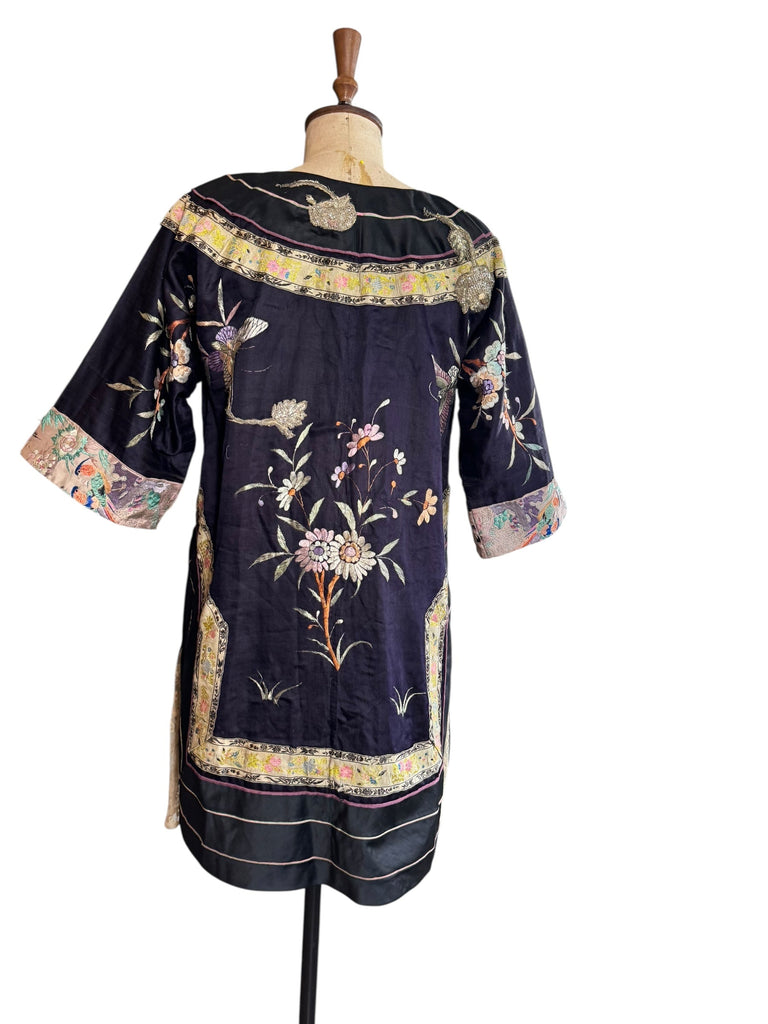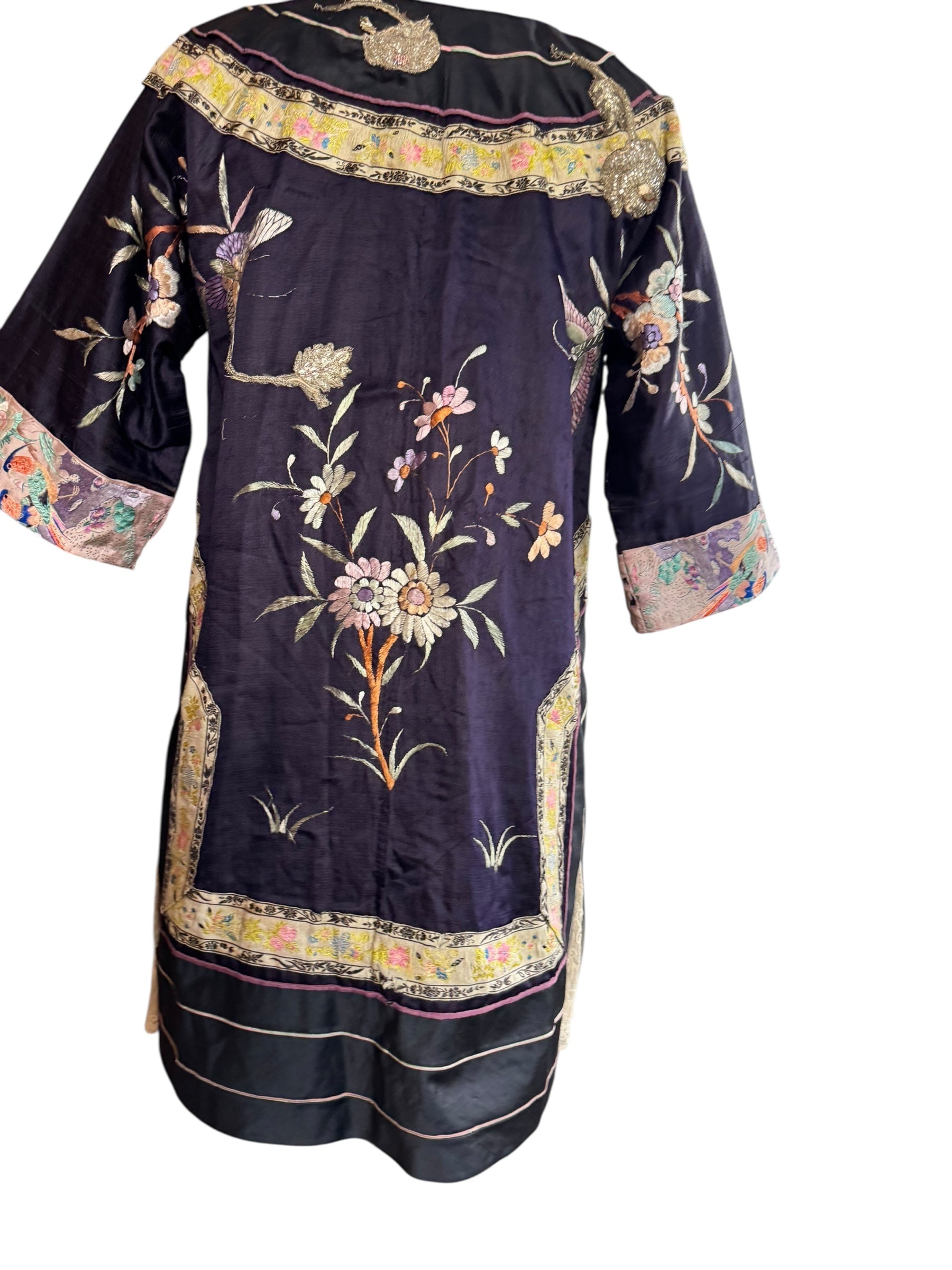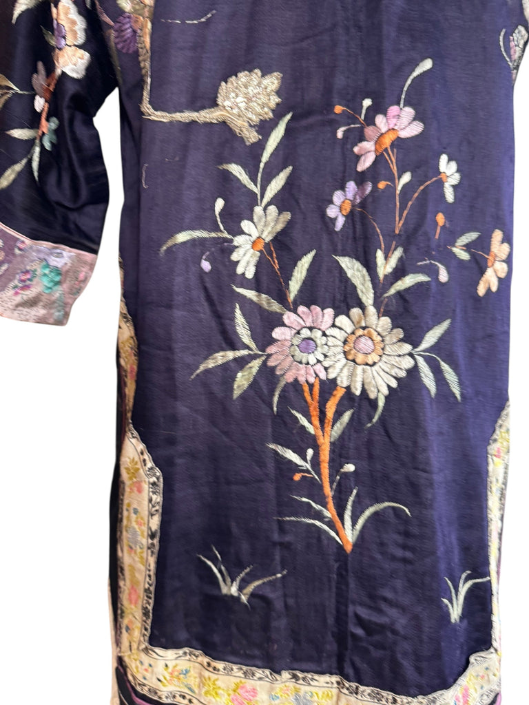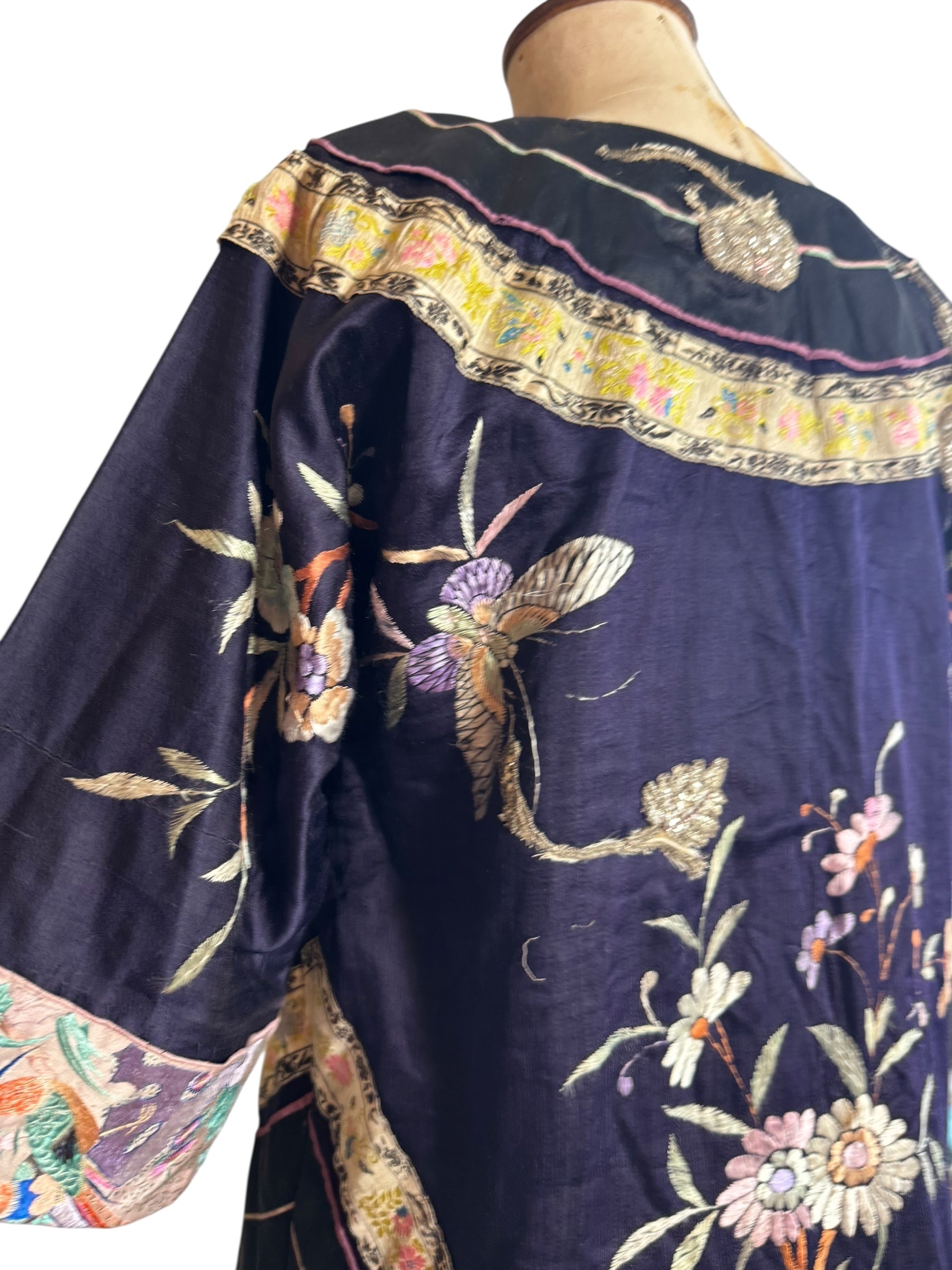 Expertly crafted in the 1930s, this Chinese dark blue jacket showcases exquisite silk embroidery and delicate beadwork. The back and sleeves feature a stunning floral design, while the front is adorned with a contrasting ribbon detail. The neckline is round with wide sleeves and a straight fit.