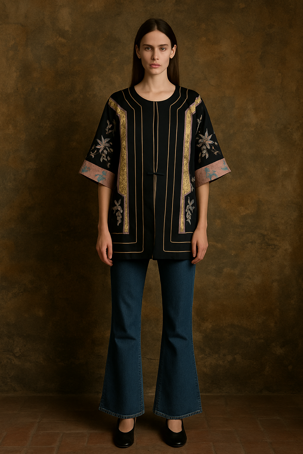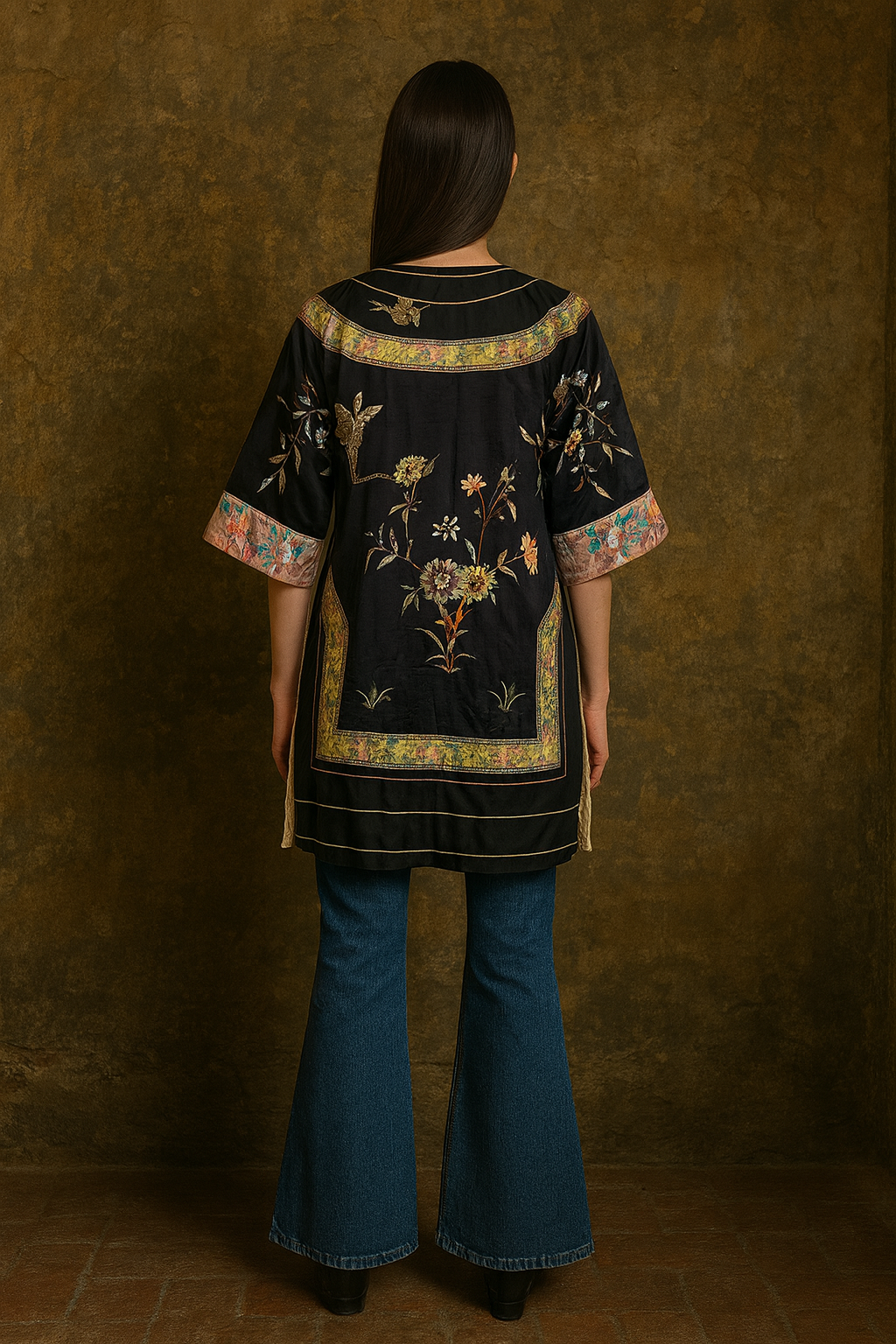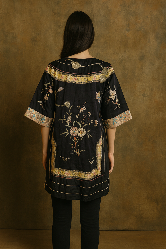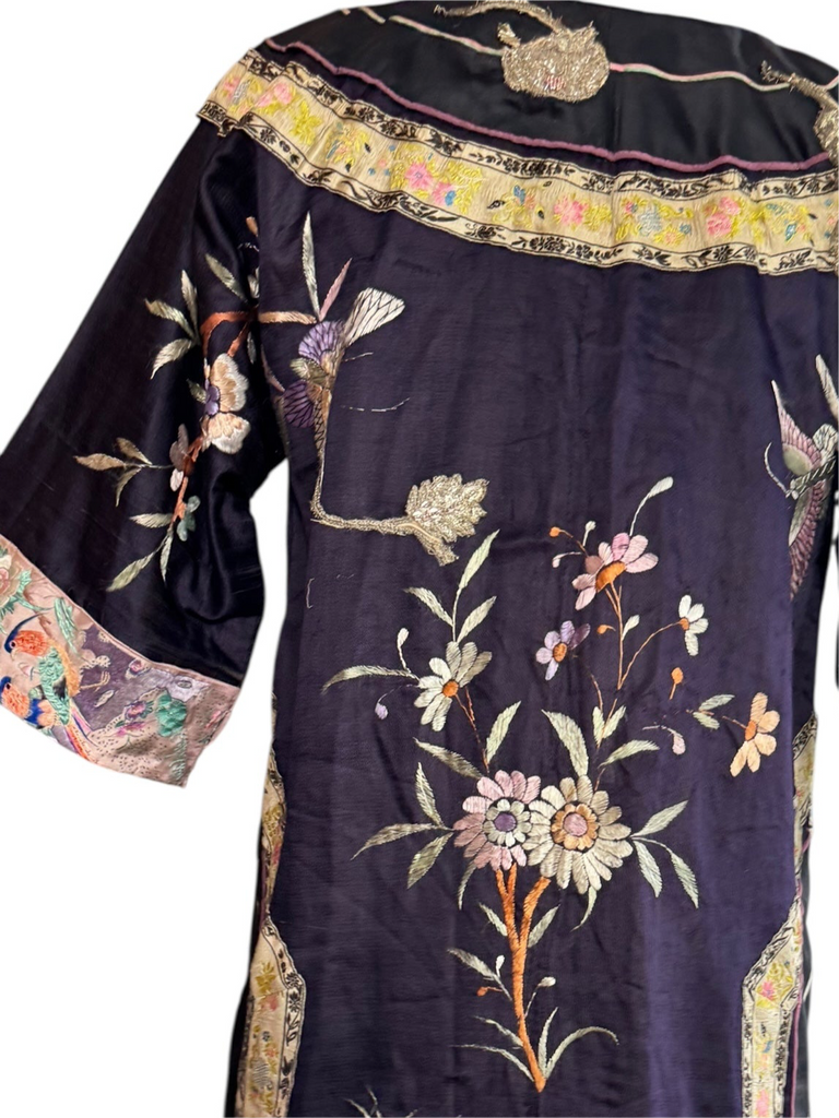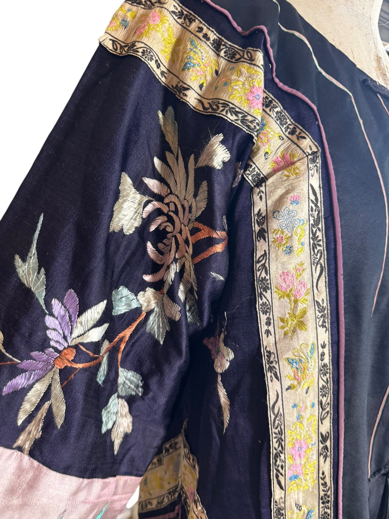 Expertly crafted in the 1930s, this Chinese dark blue jacket showcases exquisite silk embroidery and delicate beadwork. The back and sleeves feature a stunning floral design, while the front is adorned with a contrasting ribbon detail. The neckline is round with wide sleeves and a straight fit.