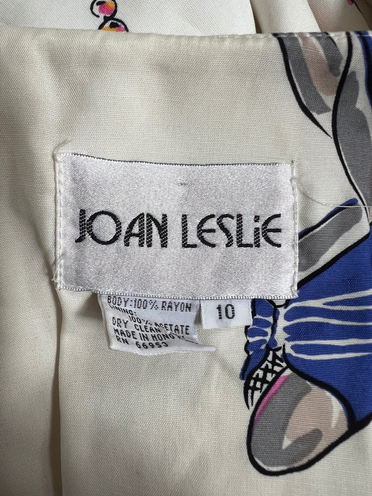 This playful daytime dress was designed by occasion wear designer Joan Leslie in the 1980s. It offers a highly wearable take on the 1940s novelty print. Set against a cream background, the dress is printed with hand-drawn designs showing dressing table accoutrements, elegant female silhouettes and bold hat and shoe designs, all rendered in vibrant jewel tones. The dress is tailored to a shirt-waister silhouette with a nipped-in waist. It has short sleeves with a pretty, fluttering cut. The front is secured with chunky buttons in white plastic detailed with royal blue stripes. The waist features a peplum ruffle which can be tied at the front to secure the waist further and alter the silhouette. The top of the dress is lined with cream satin. The skirt is unlined.