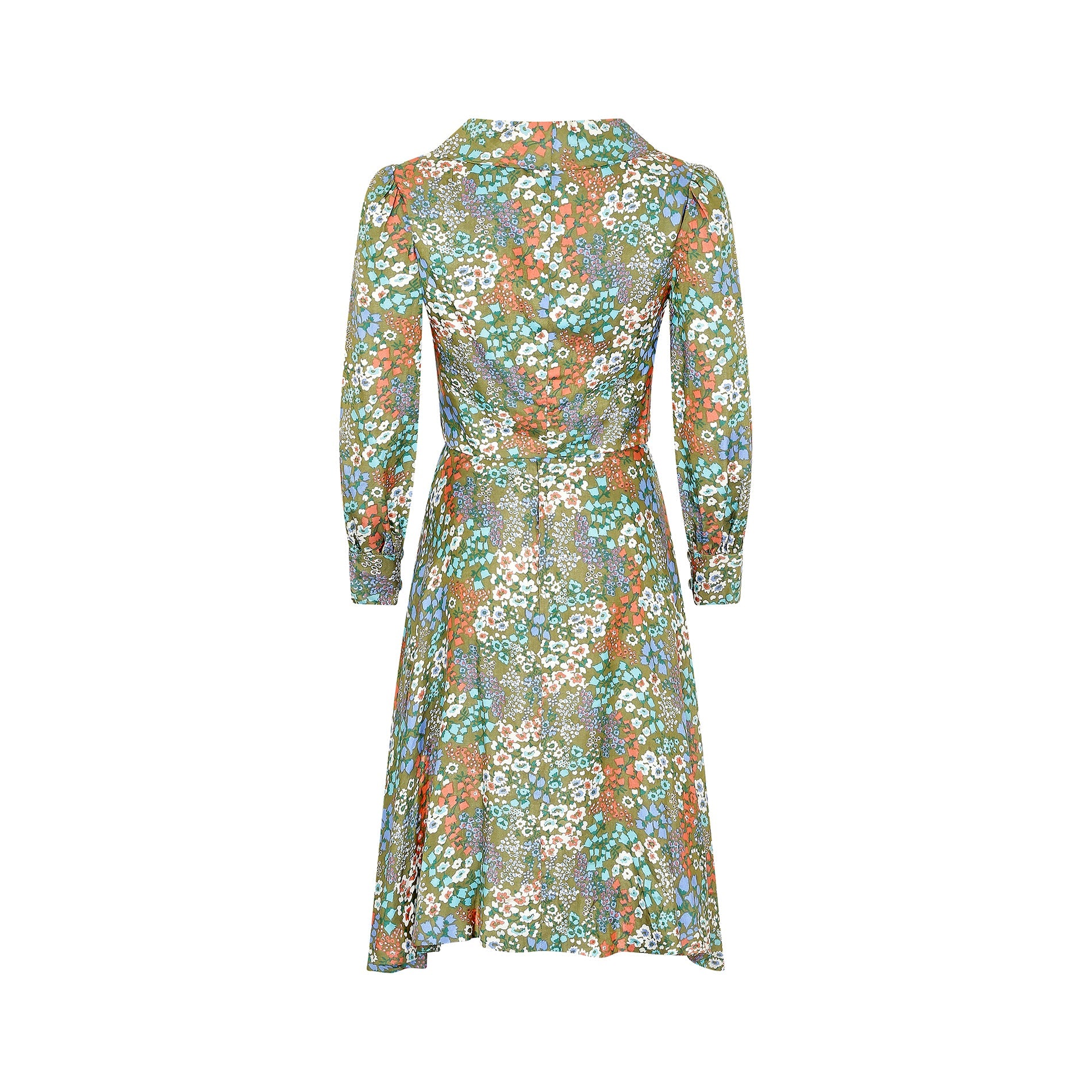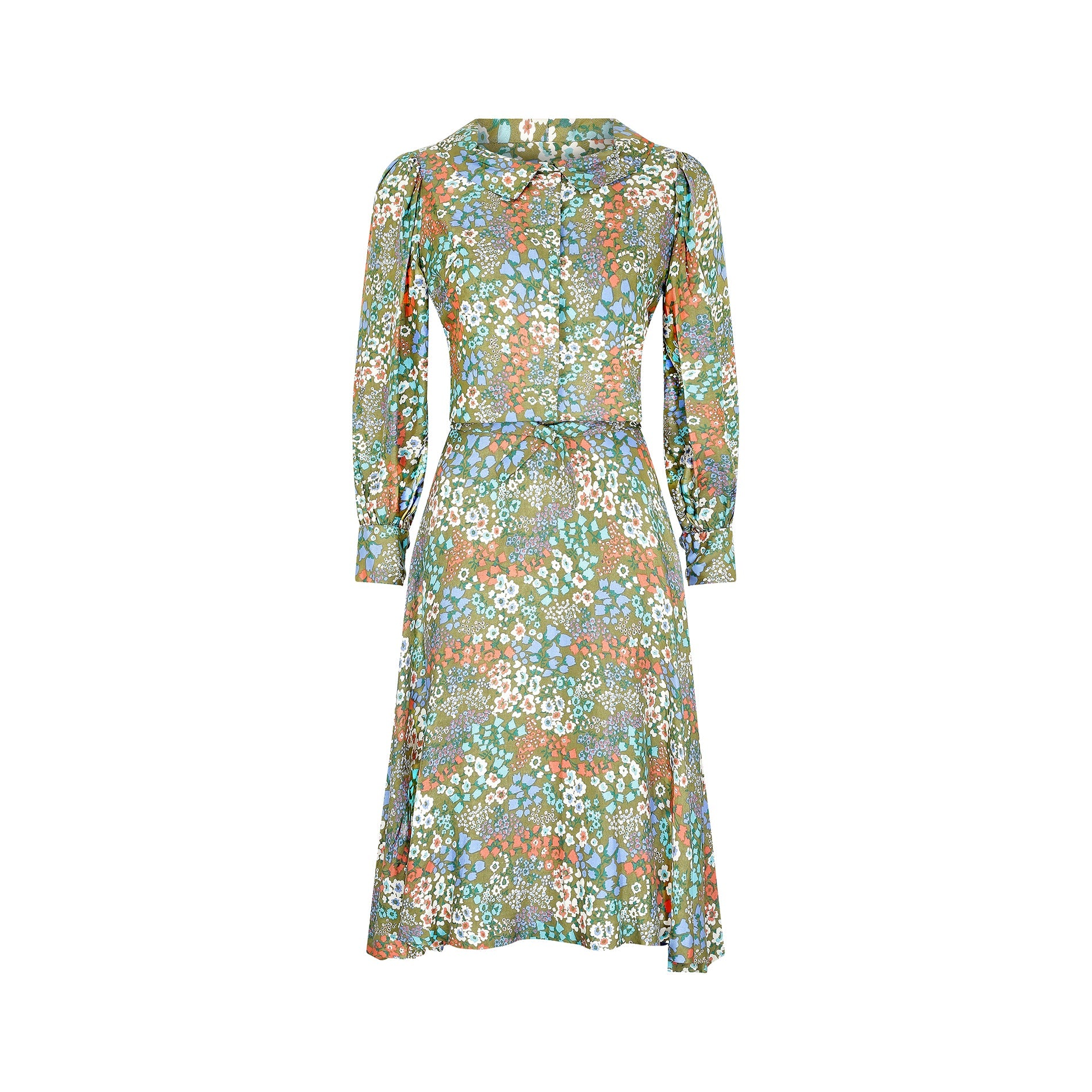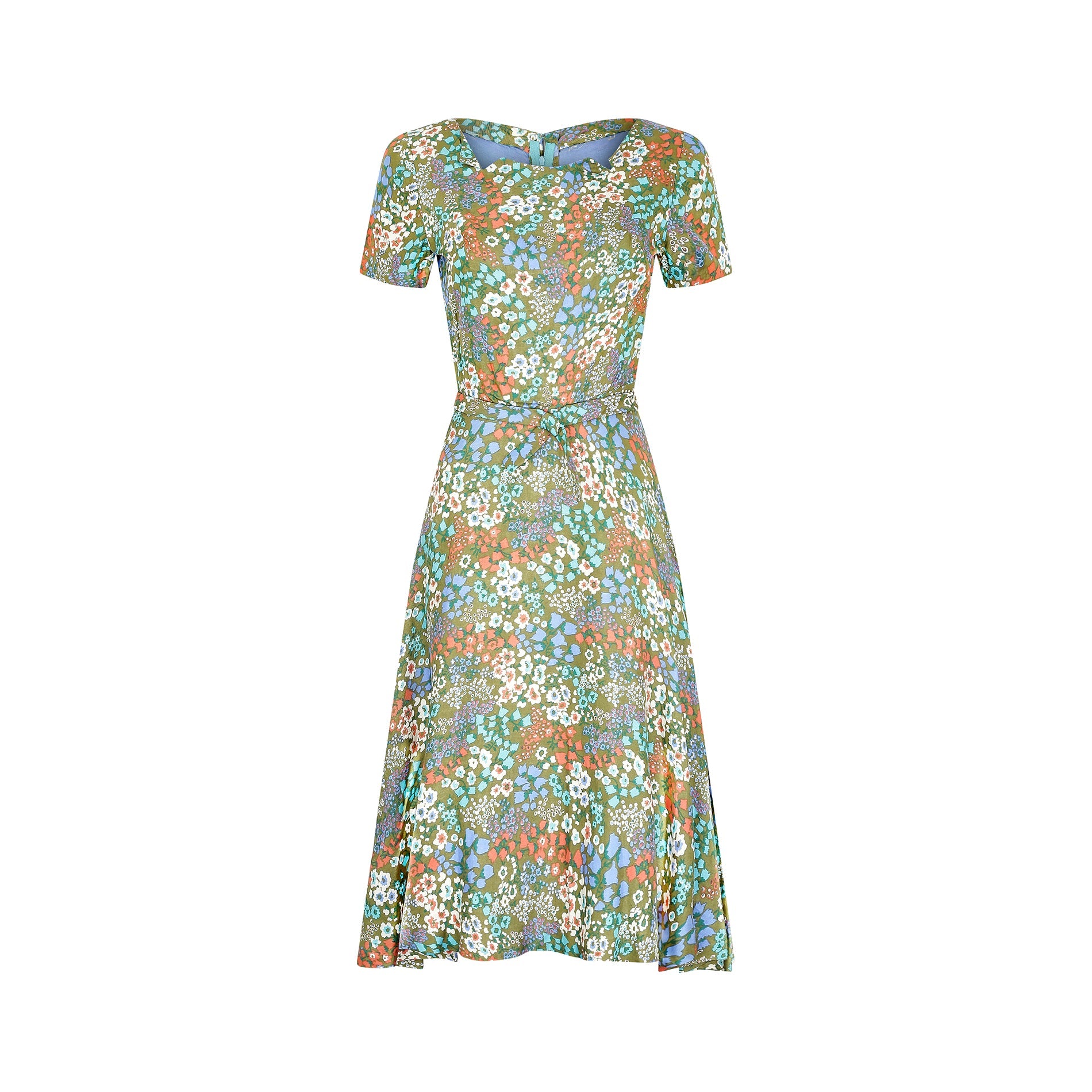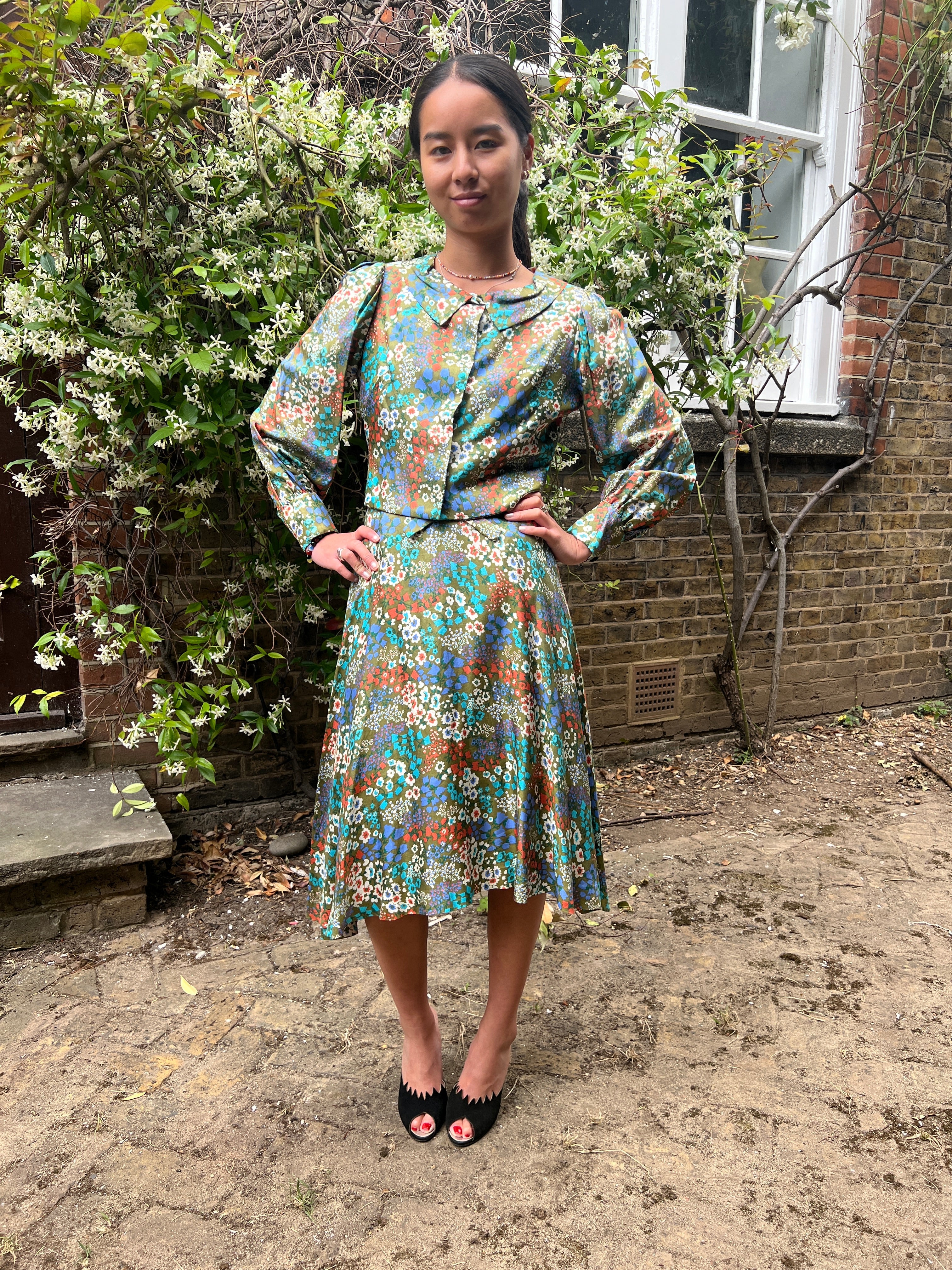 Very pretty late 1950s to early 1960s floral print silk dress and jacket set. The dress has a high, rounded neckline with notched detail, short sleeves, and fastens down the back with the original metal zipper. It is nipped in at the waist with a separate, thin fabric belt and then flows into an A-line flared skirt. The jacket has gathered sleeves, slightly puffed at the shoulder and finished at the cuff with two fabric covered buttons each. It is lined in a sky blue acetate and closes at the front with covered popper fastenings. The fabric of both the dress and jacket is a lovely muted pea green, with a powder blue, turquoise, peach and white ditsy floral pattern.