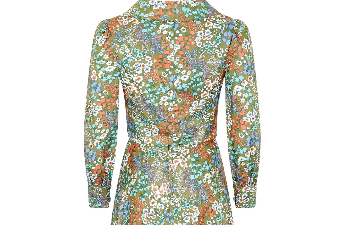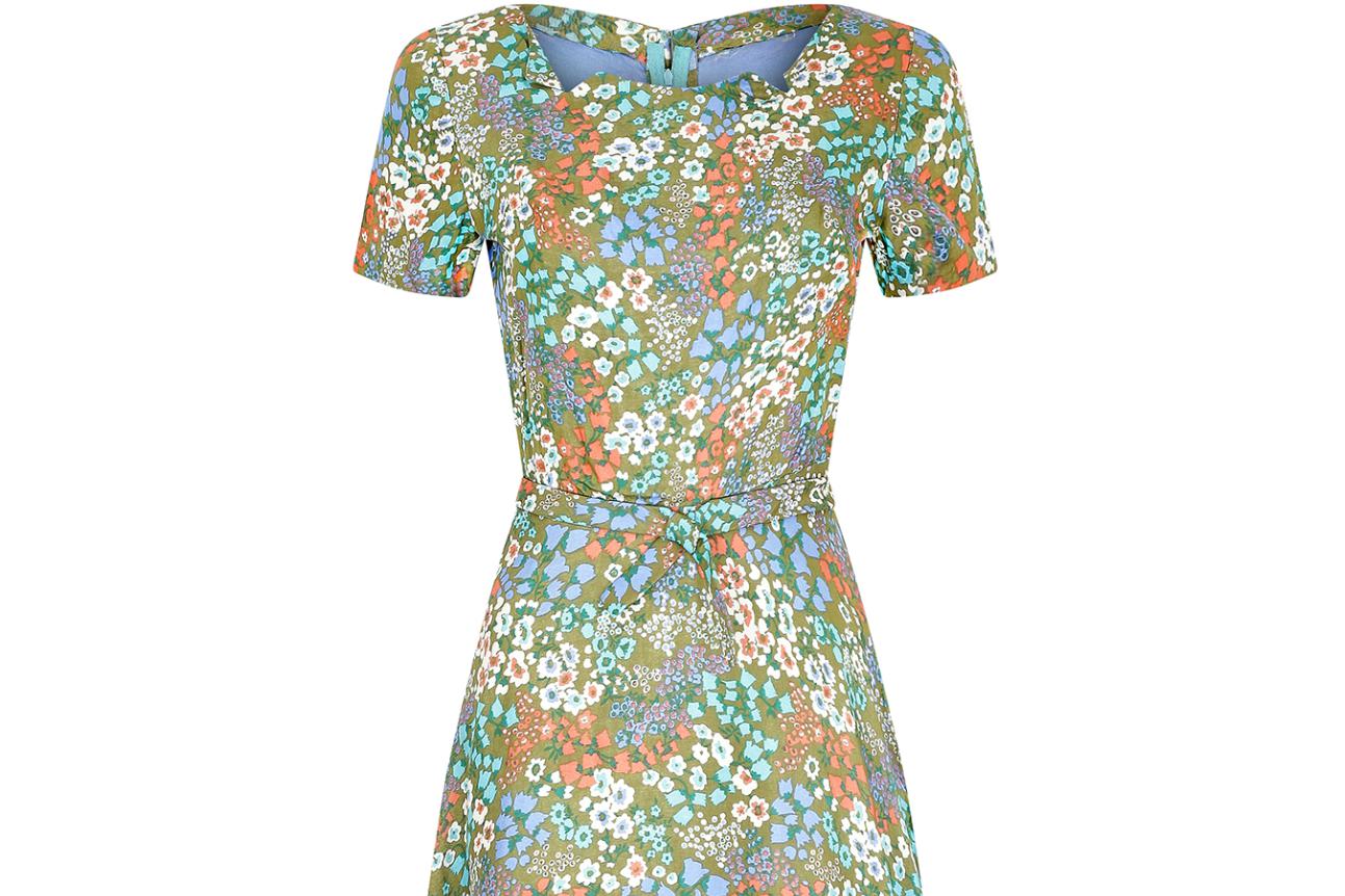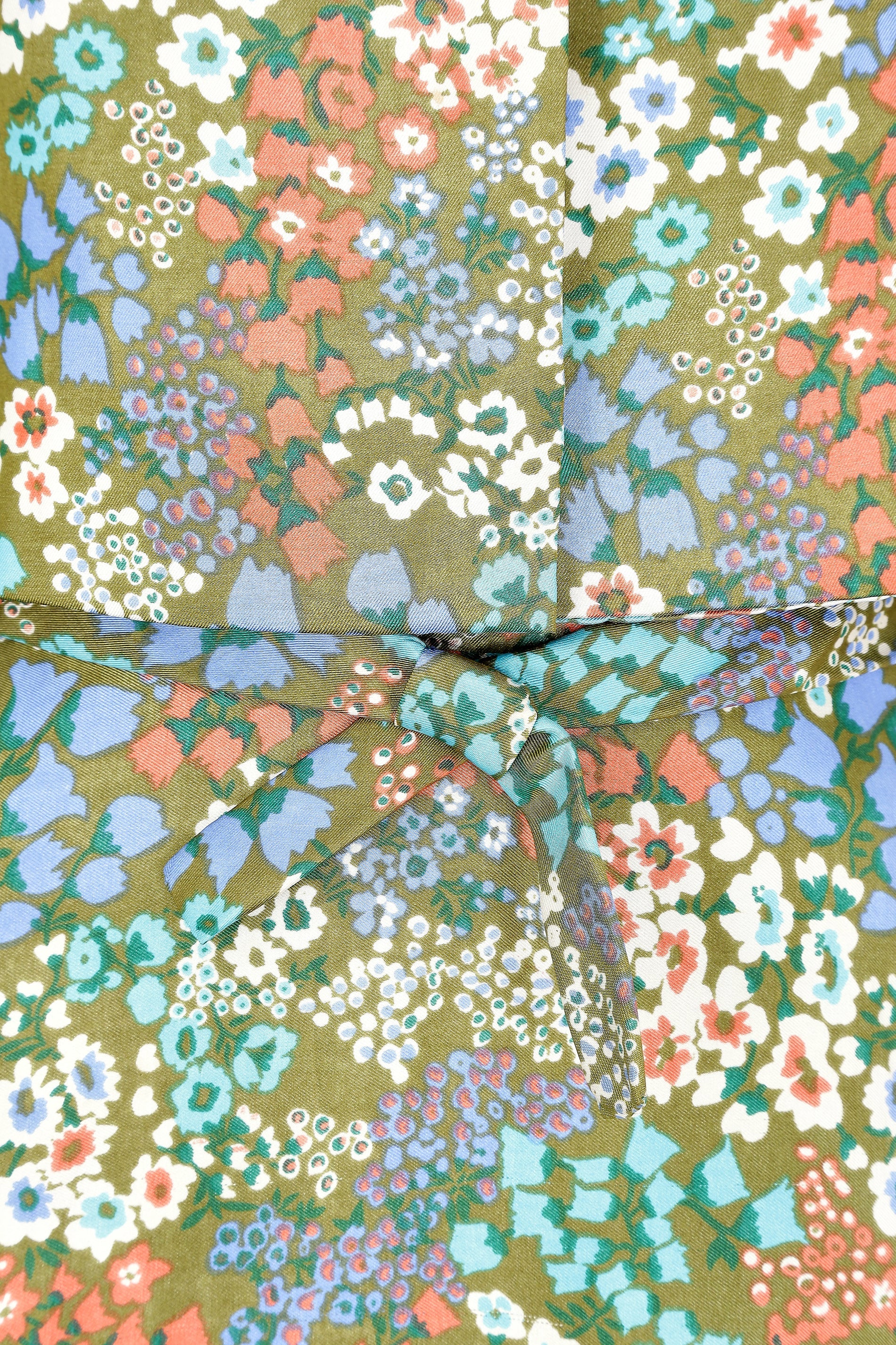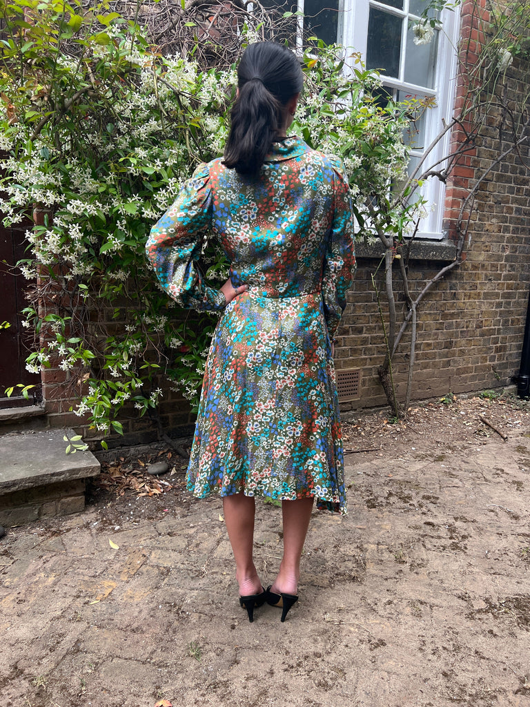 Very pretty late 1950s to early 1960s floral print silk dress and jacket set. The dress has a high, rounded neckline with notched detail, short sleeves, and fastens down the back with the original metal zipper. It is nipped in at the waist with a separate, thin fabric belt and then flows into an A-line flared skirt. The jacket has gathered sleeves, slightly puffed at the shoulder and finished at the cuff with two fabric covered buttons each. It is lined in a sky blue acetate and closes at the front with covered popper fastenings. The fabric of both the dress and jacket is a lovely muted pea green, with a powder blue, turquoise, peach and white ditsy floral pattern.