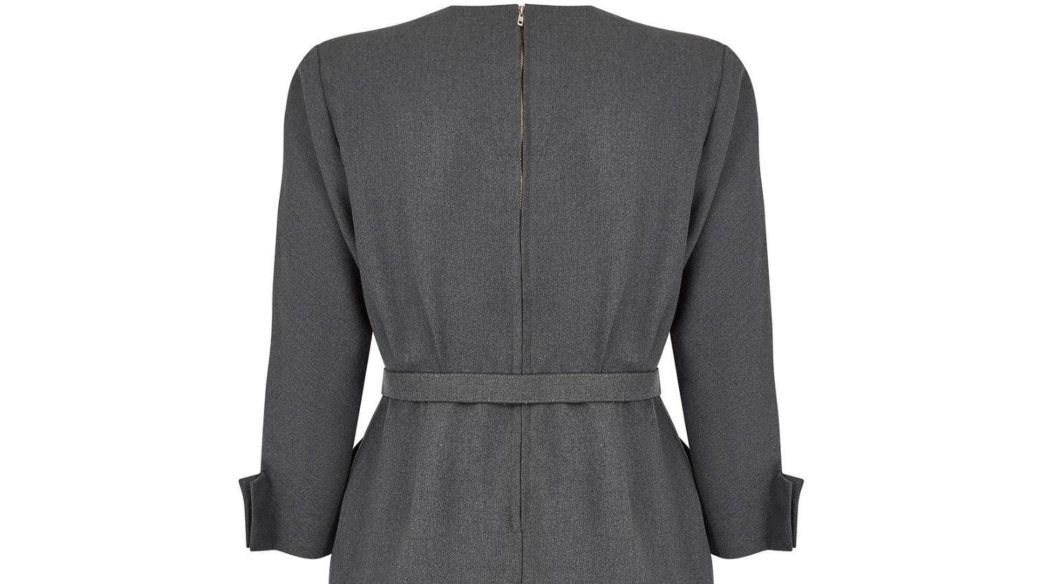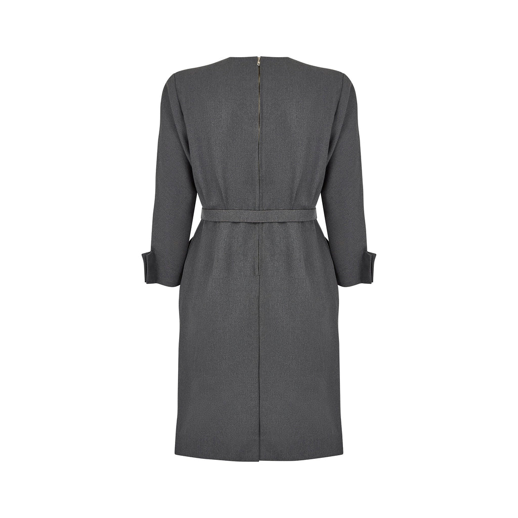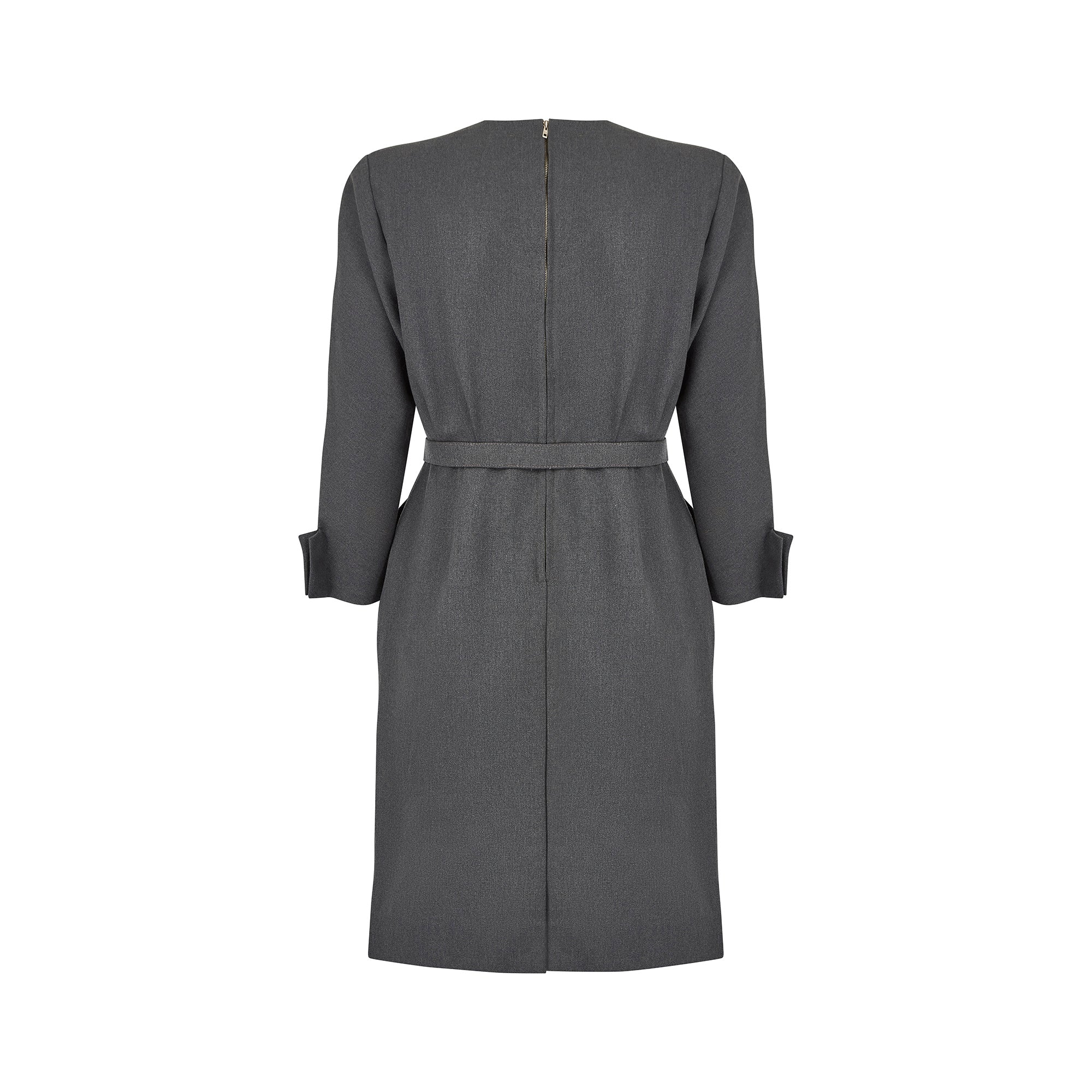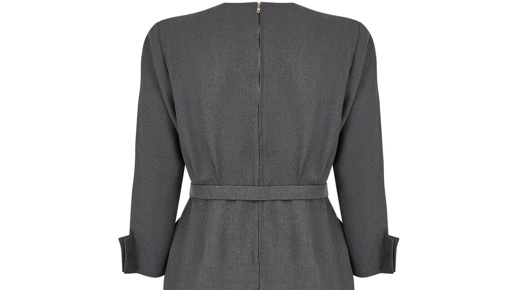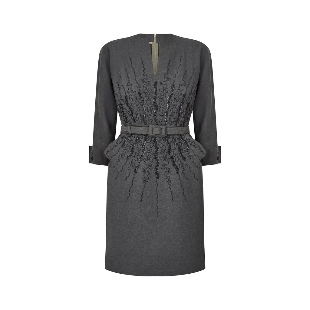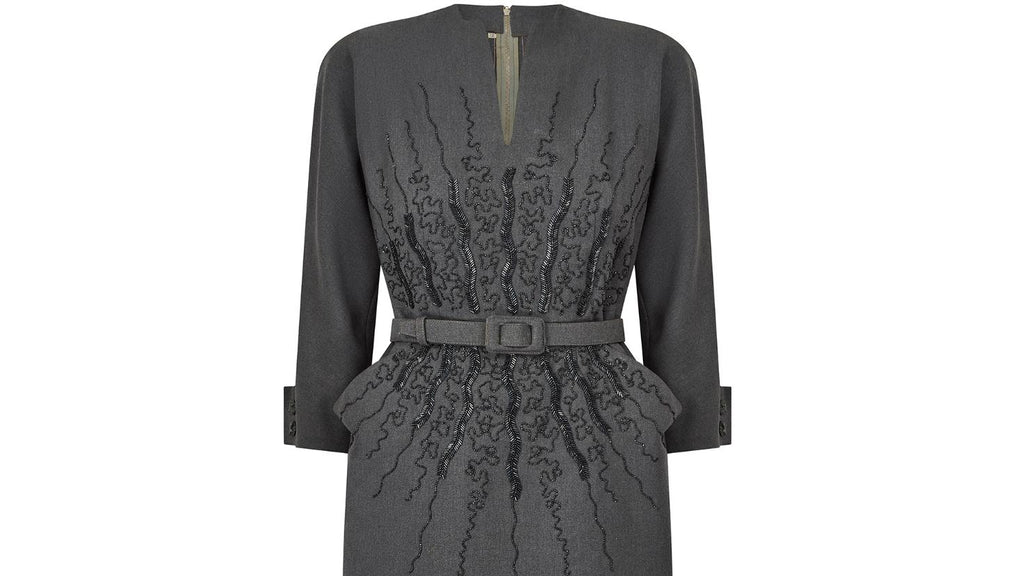 This grey wool dress dates from the very early 1950s has a lovely structured feel to it, and incredible beaded detail. The neckline is high with a small V shaped slit to the front of the bust, and the cuffs have a two button detail to each sleeve. The front panels are embroidered with dark grey, almost charcoal coloured bugle beads in a very detailed, abstract design which expands outwards from the centre. The dress has shoulder padding, nips in at the waist and is finished with a slim grey belt in a matching fabric. It fastens down the back with the original metal zip and features two pockets - great for the colder winter months! Unlined but immaculately finished and would be a versatile piece for both formal and every day occasions. It's a fine choice for Goodwood too. Unlabelled but this is most certainly a designer dress which would have retailed in a high-end department store. Will fit up to a UK 8-10 or US 4-6. Excellent vintage condition - no issues to note.