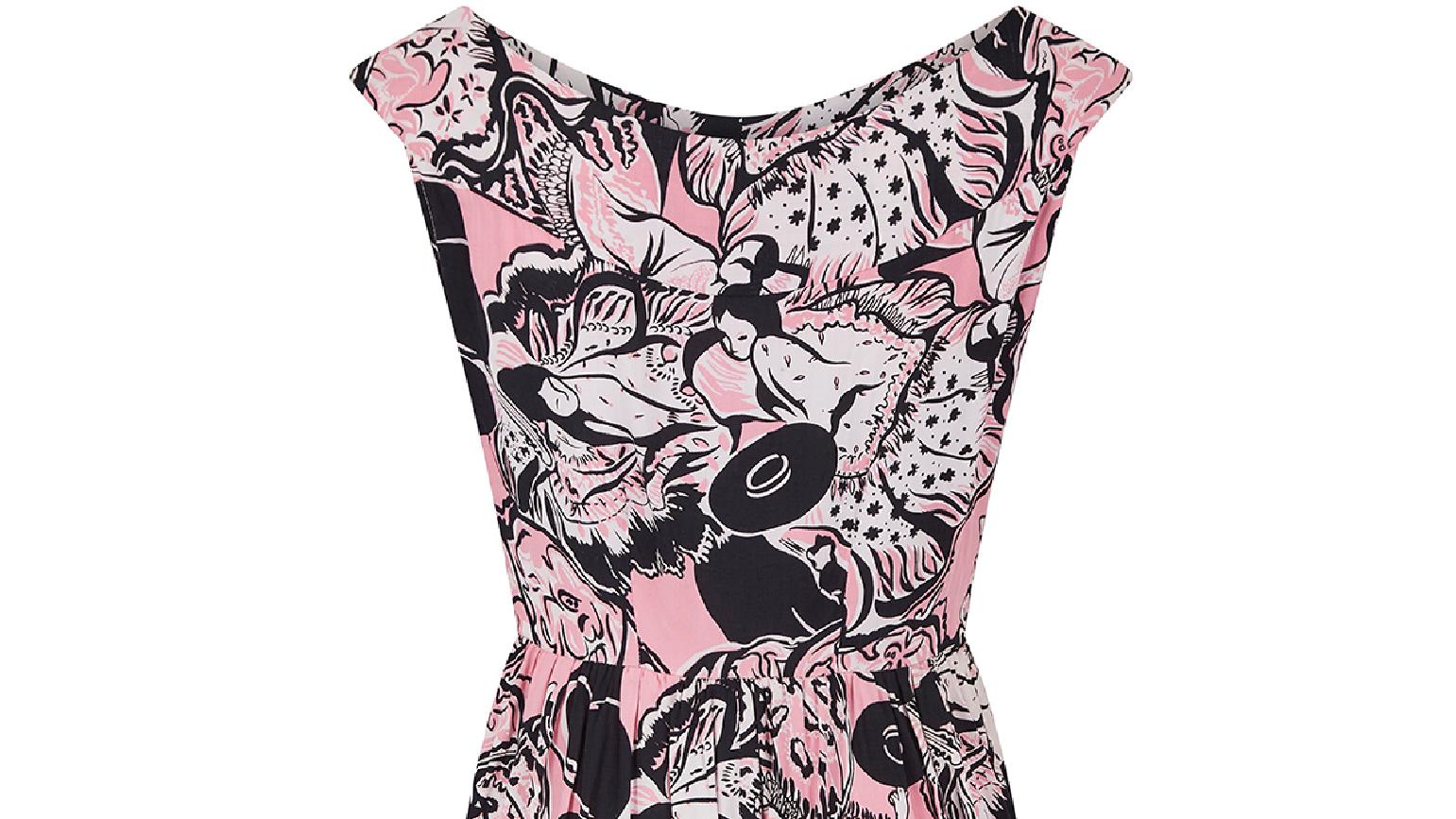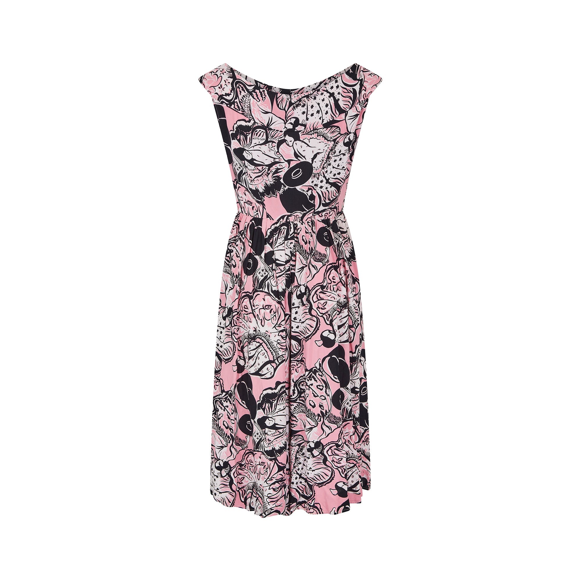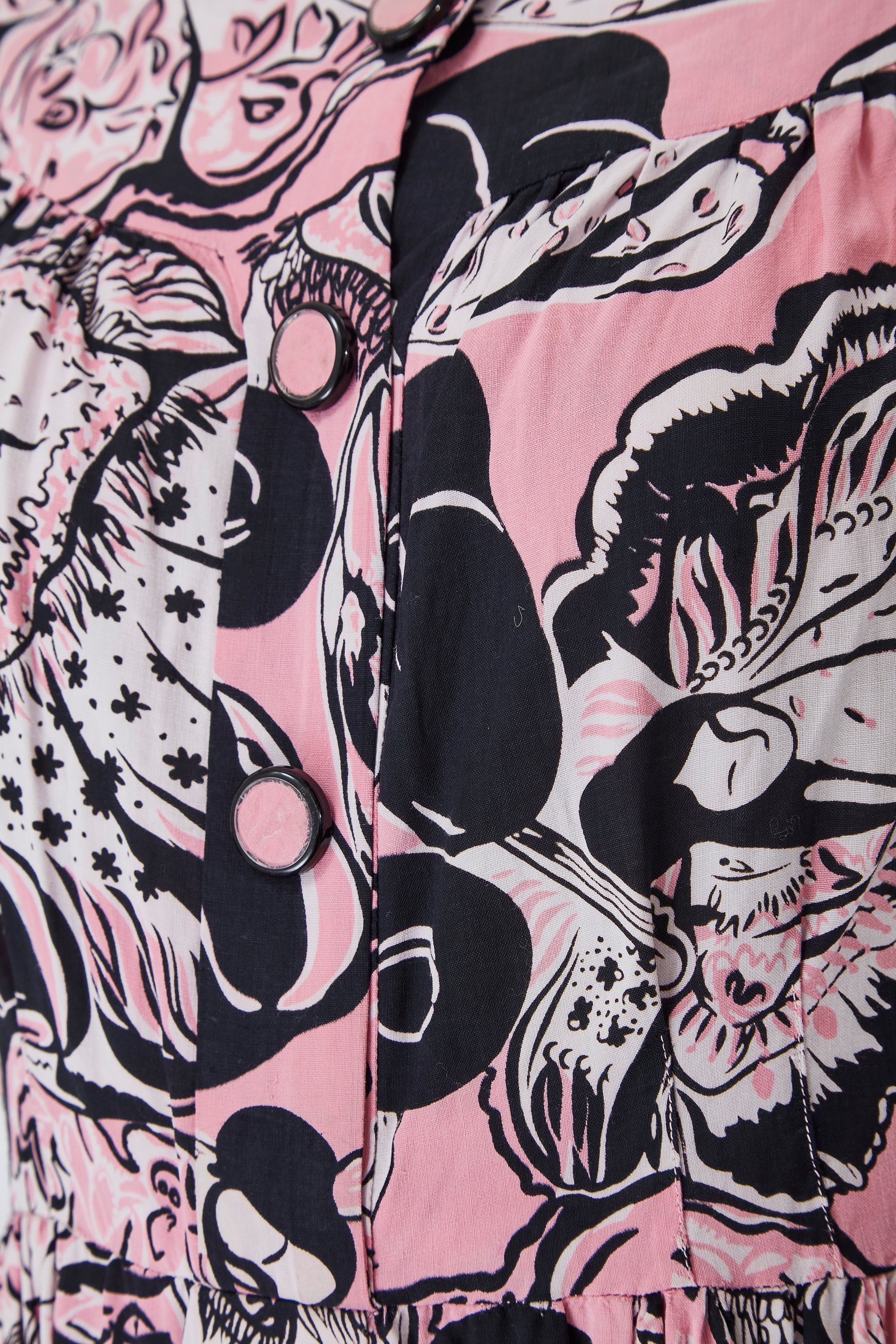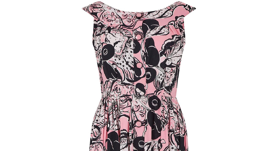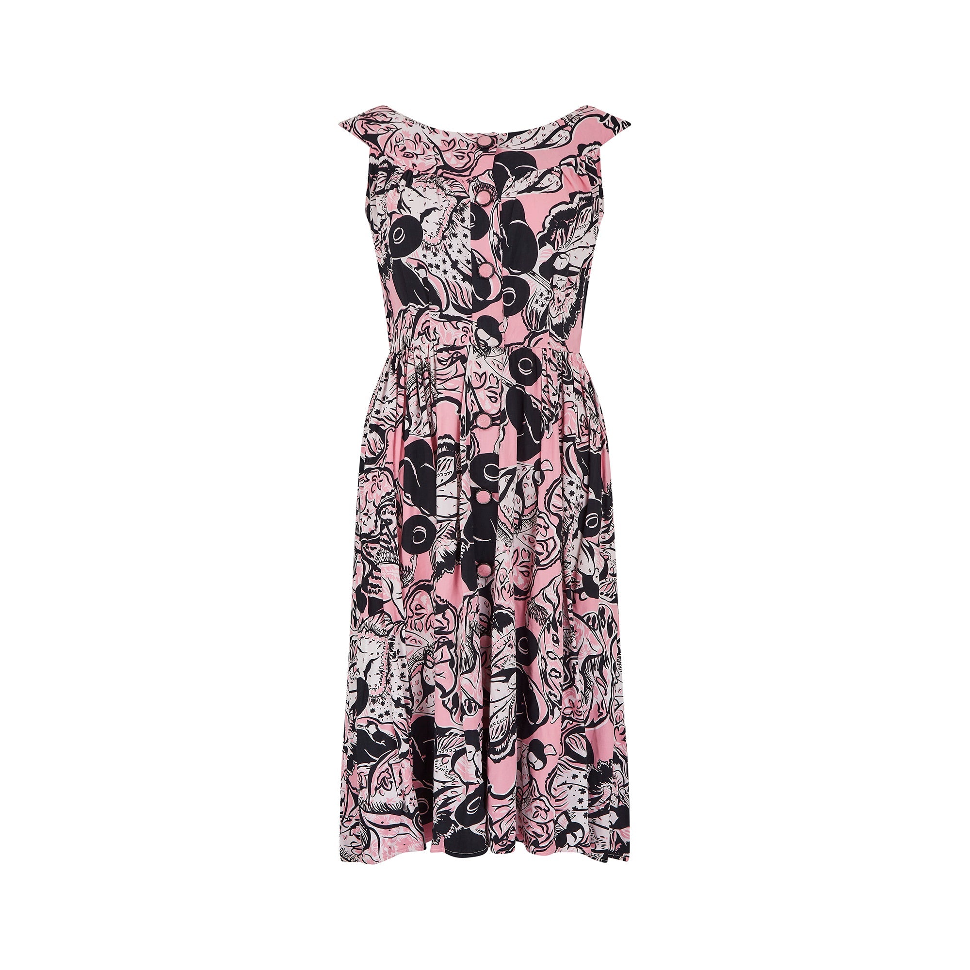 A rare mid-century button down dress with an amazing novelty Geisha print. This is one of the most extraordinary prints we've come across from this era for a very long time. The dress almost certainly dates from the early 1950s, possibly late 1940s, and is made from a striking colour combination of monochrome and pink. The geishas are in a variety of poses and costume. The dress is a faux shirtwaister style so there is a centre front seam with the button stand running from the top of the yoke of the wide boat neck all the way down to the skirt. However, this is for decoration only. The buttons have a clear plastic top and cotton in the same colour pink as the fabric has been placed into the buttons to match. With a fitted bodice, the dress has some darting at the waistline with a gathered skirt and fastens with the original side zip. The material is a lovely lightweight cotton, perfect for spring and summer.