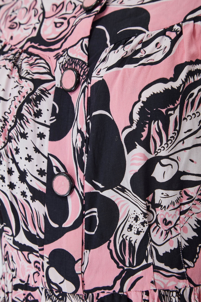 1950s Pink and Black Novelty Geisha Print Button Down Dress