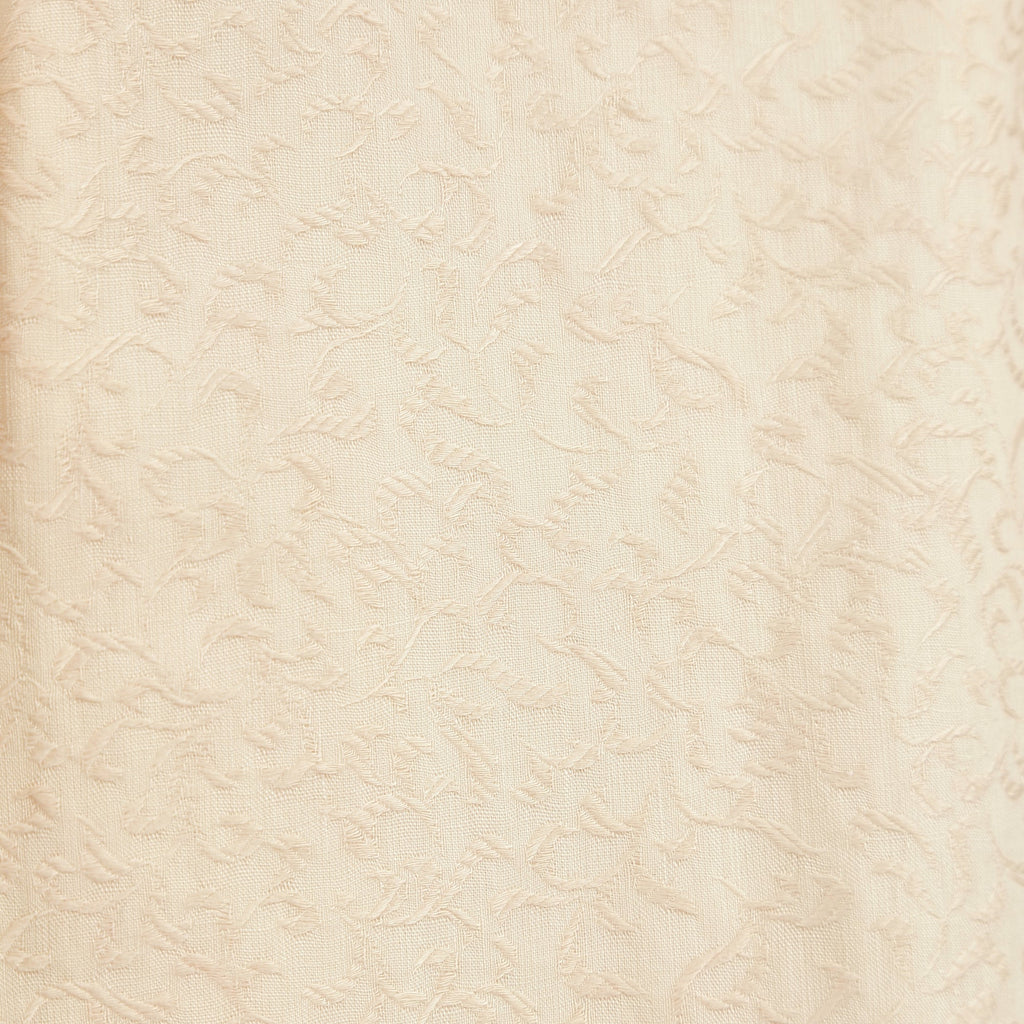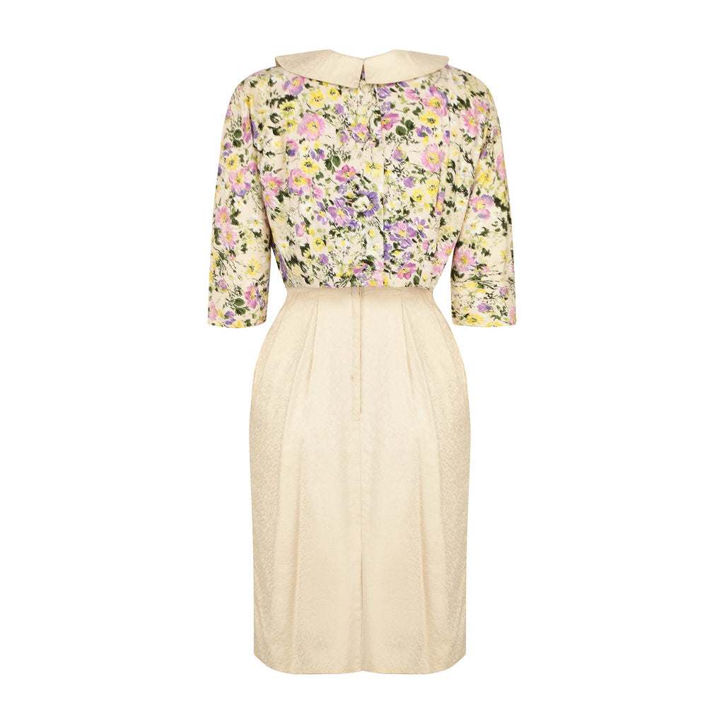 The dress is tailored from a pale apricot brocade detailed all-over with delicate, tonal lines and leaves. Cut to a shift-style with a nipped in waist and knee-length skirt. The skirt has two soft pleats at the front and at the rear. The boat neckline is rounded and detailed with a wide, curved collar. The dress fastens at the rear with a hidden zip and hook-and-eye clasp. It is unlined. The jacket is tailored from the same fabric which has been dramatically printed with vibrant florals in bright pink, yellow, violet and blue-grey. It has a curved neckline which allows the collar of the dress underneath to be seen. It has a cropped, cocooning cut which stops at the waist. The sleeves are cut to an elegant, slightly cropped length as it was the fashion to wear gloves and display the era's dazzling jewellery designs. Three large buttons secure the front, detailed with coordinating floral-printed brocade. The jacket is lined in cream cotton.
