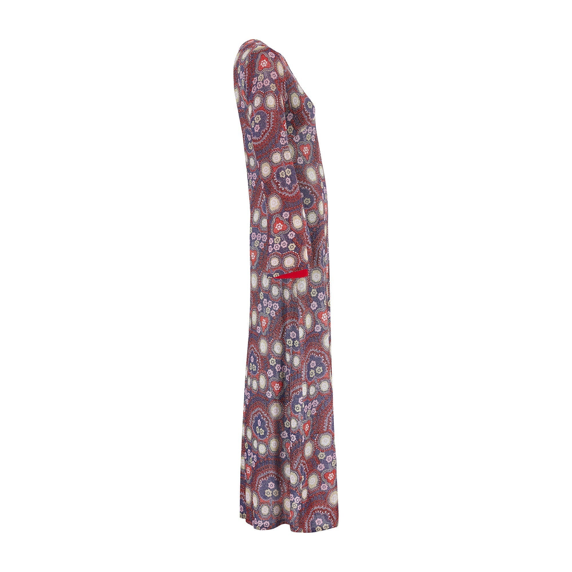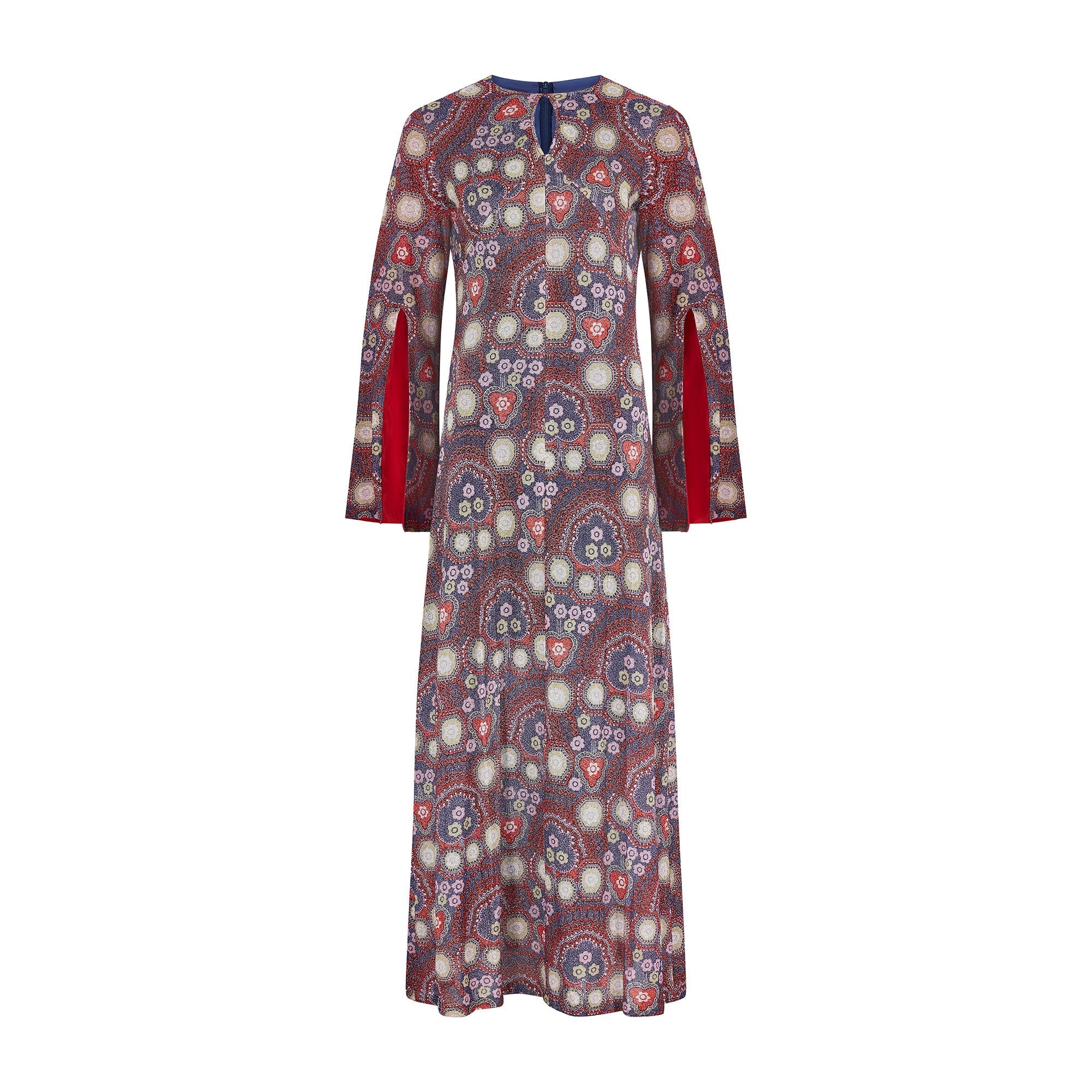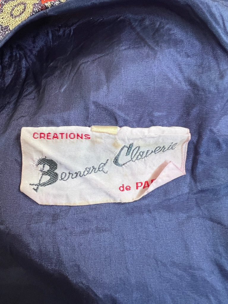 The Parisian answer to the 'flower power' fashions of the late 1960s, this glittering maxi gown was created by Bernard Claverie of Paris circa 1968-1969. An excellent example of a Parisian boutique adapting haute couture designs for the ready to wear market; this gown was most likely inspired by Pierre Balmain. The dress is fabulous quality and the fabric is mesmerising; russet red lurex patterned with purple, white, yellow, tangerine and rose-pink florals and geometric shapes. The dress has long angel-sleeves with a theatrical slit cuff that reveals flashes of red satin lining. There is a rounded neckline with a pretty keyhole cut-out at the front and a maxi-length skirt that falls in an A-line shape to the ankle. The dress is lined with satin in a deep slate blue for a comfortable wear. It fastens at the back of the neck with a hidden tonal blue zip.