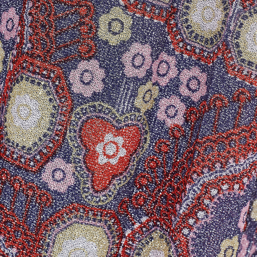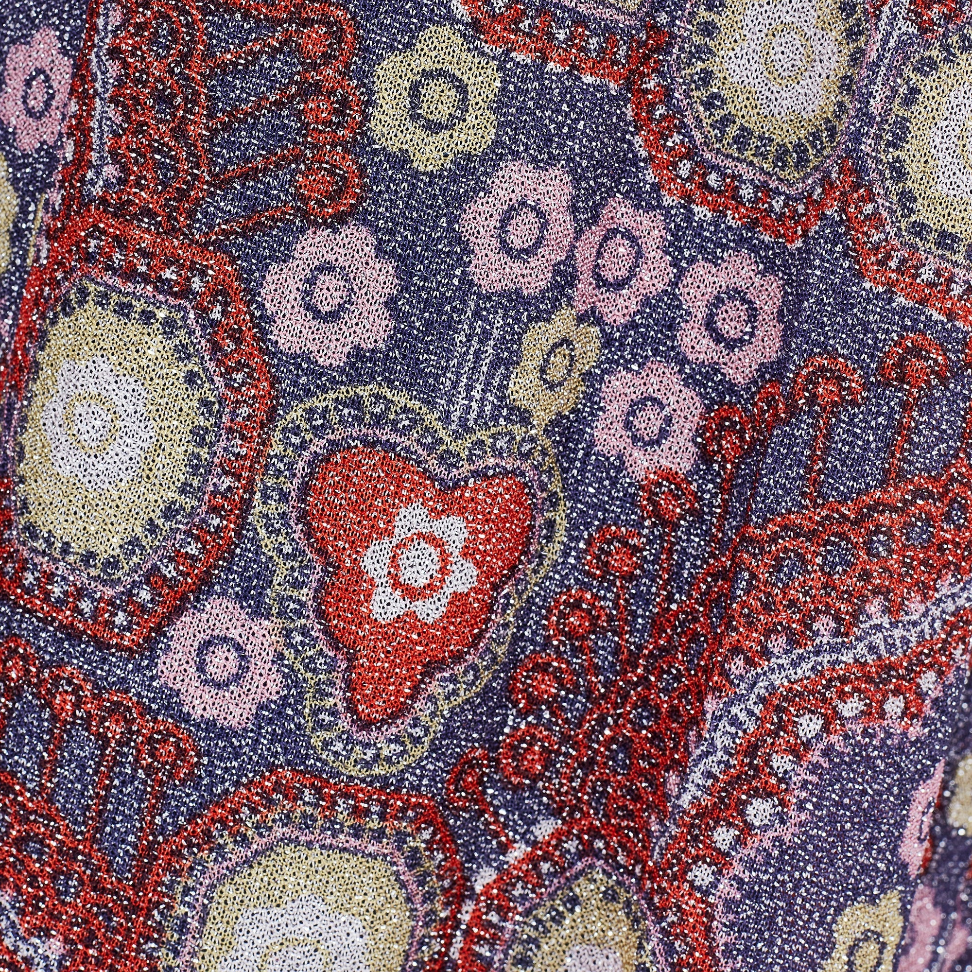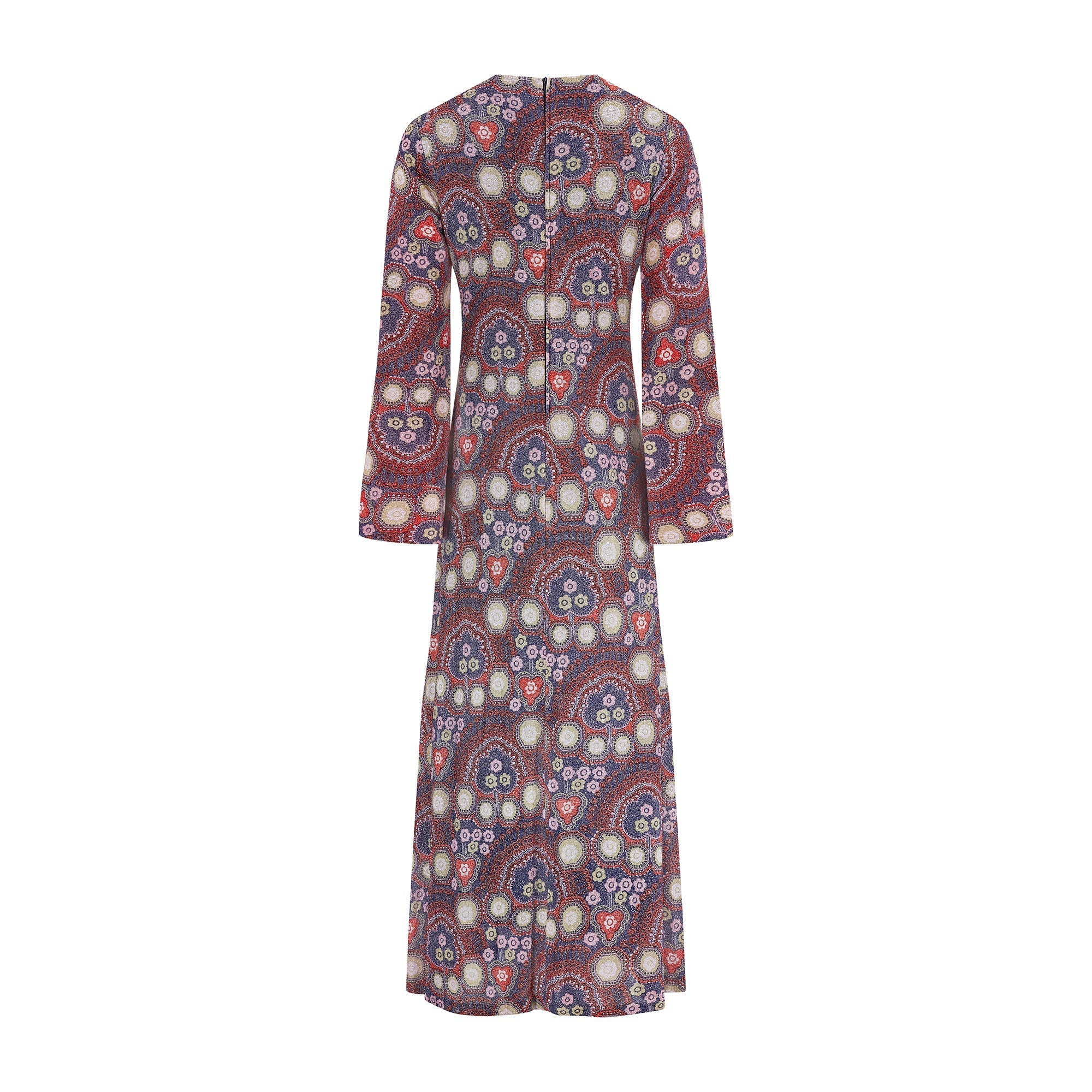 The Parisian answer to the 'flower power' fashions of the late 1960s, this glittering maxi gown was created by Bernard Claverie of Paris circa 1968-1969. An excellent example of a Parisian boutique adapting haute couture designs for the ready to wear market; this gown was most likely inspired by Pierre Balmain. The dress is fabulous quality and the fabric is mesmerising; russet red lurex patterned with purple, white, yellow, tangerine and rose-pink florals and geometric shapes. The dress has long angel-sleeves with a theatrical slit cuff that reveals flashes of red satin lining. There is a rounded neckline with a pretty keyhole cut-out at the front and a maxi-length skirt that falls in an A-line shape to the ankle. The dress is lined with satin in a deep slate blue for a comfortable wear. It fastens at the back of the neck with a hidden tonal blue zip.