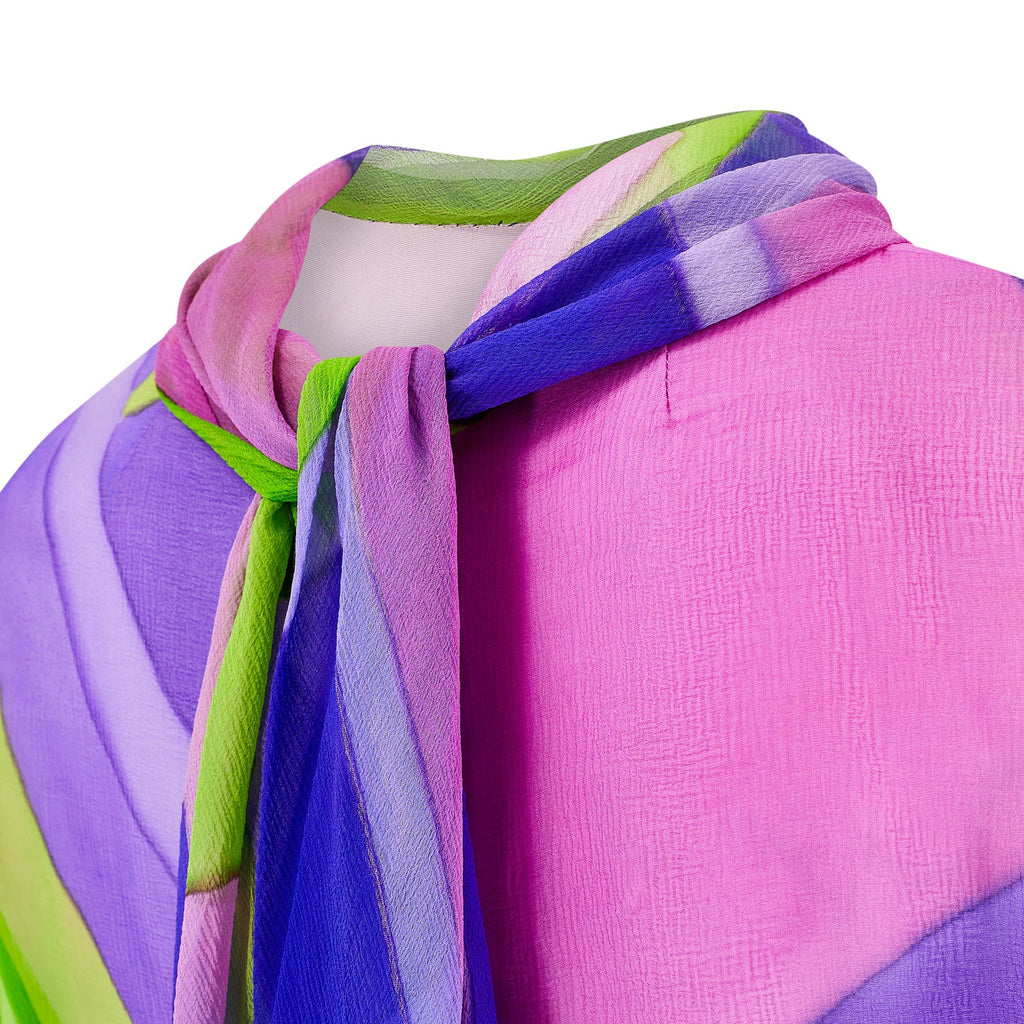This flamboyant 1960s British couture dress is crafted from silk chiffon hand-dyed with a swirling, psychedelic pattern in lilac, pink and lime green. The couturier is unknown as the labels have been lost with the passage of time. This bell-sleeve, high-neck silhouette was a desirable look during the swinging 60s period of British fashion. The skirt is plissé pleated and the top and skirt are lined with pale pink-lilac viscose. The attached, flowing scarf forms a high-neckline at the front and is cut from matching printed chiffon. The back of the dress is secured with the original hidden lilac zip.