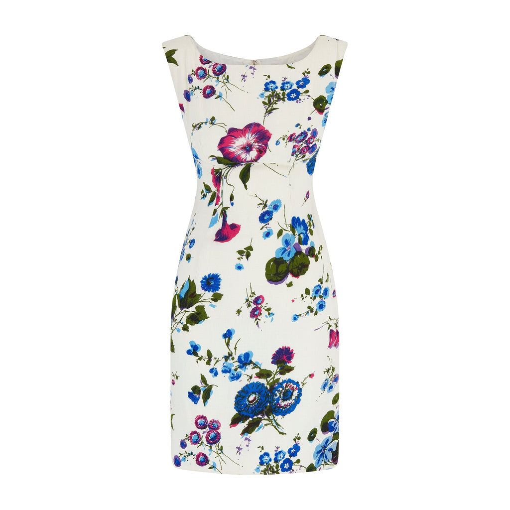 This charming dress was designed by Edward Abbott in the 1960s and was a high-end ready to wear brand which retailed in the UK and US. It is tailored from a very fine quality cream linen cloth which is printed all-over with vibrant florals and foliage in fuchsia, violet, royal blue, baby blue and green. It showcases a classic, flattering sheath silhouette with a wide neckline, nipped-in waist and relaxed pencil-shaped skirt. The dress fastens at the back of the neck with a hidden tonal zip and hook-and-eye clasp. It is fully lined throughout with cream silk for a comfortable, luxurious wear and would be a perfect choice for a summer garden party.