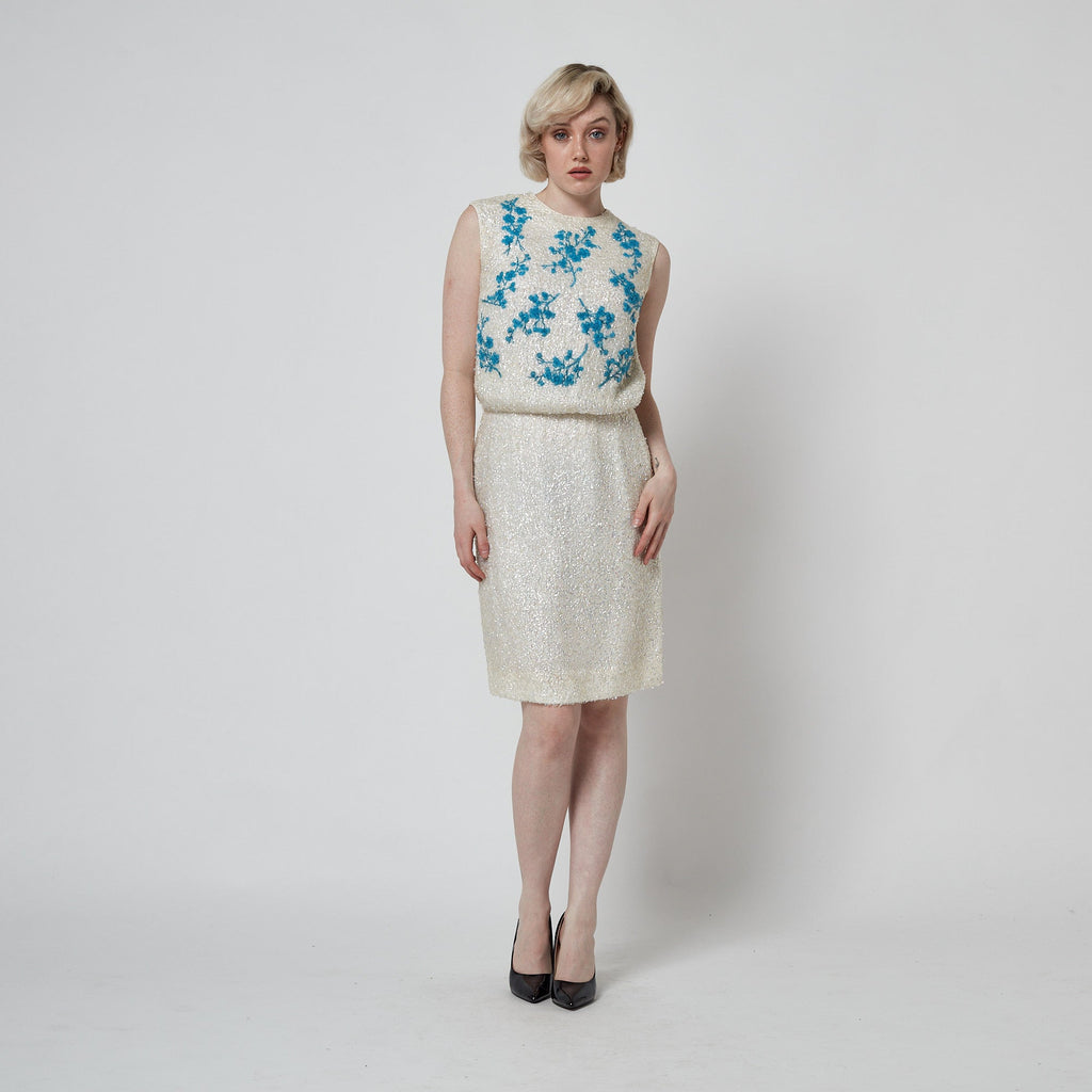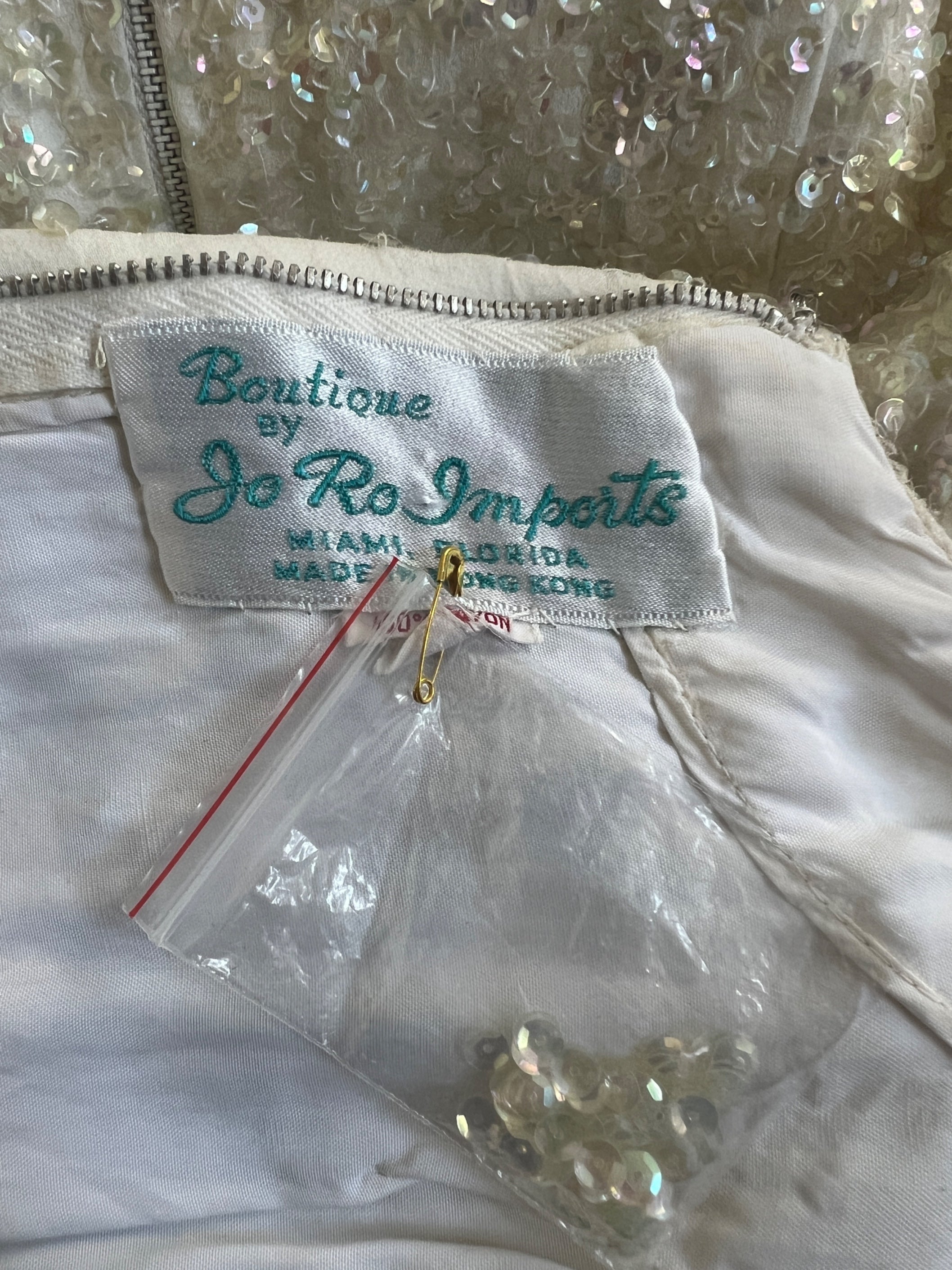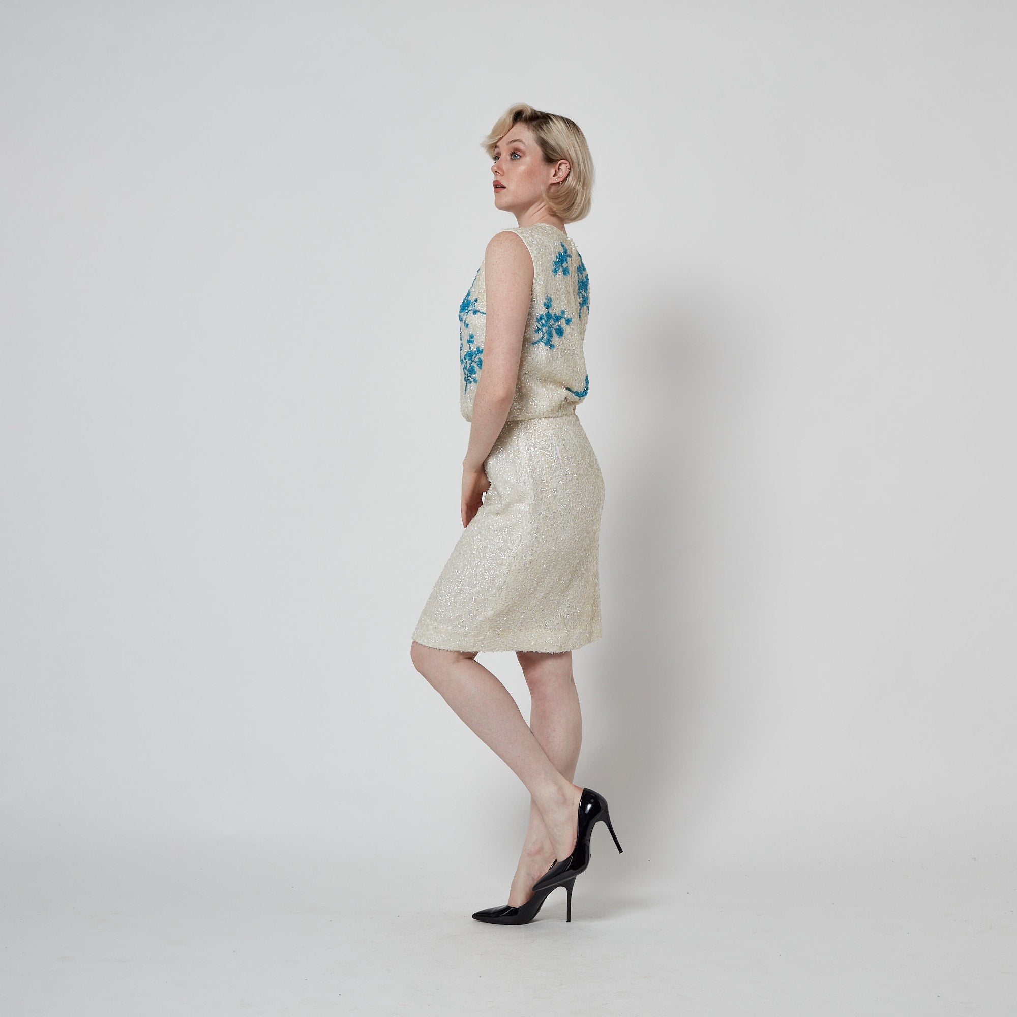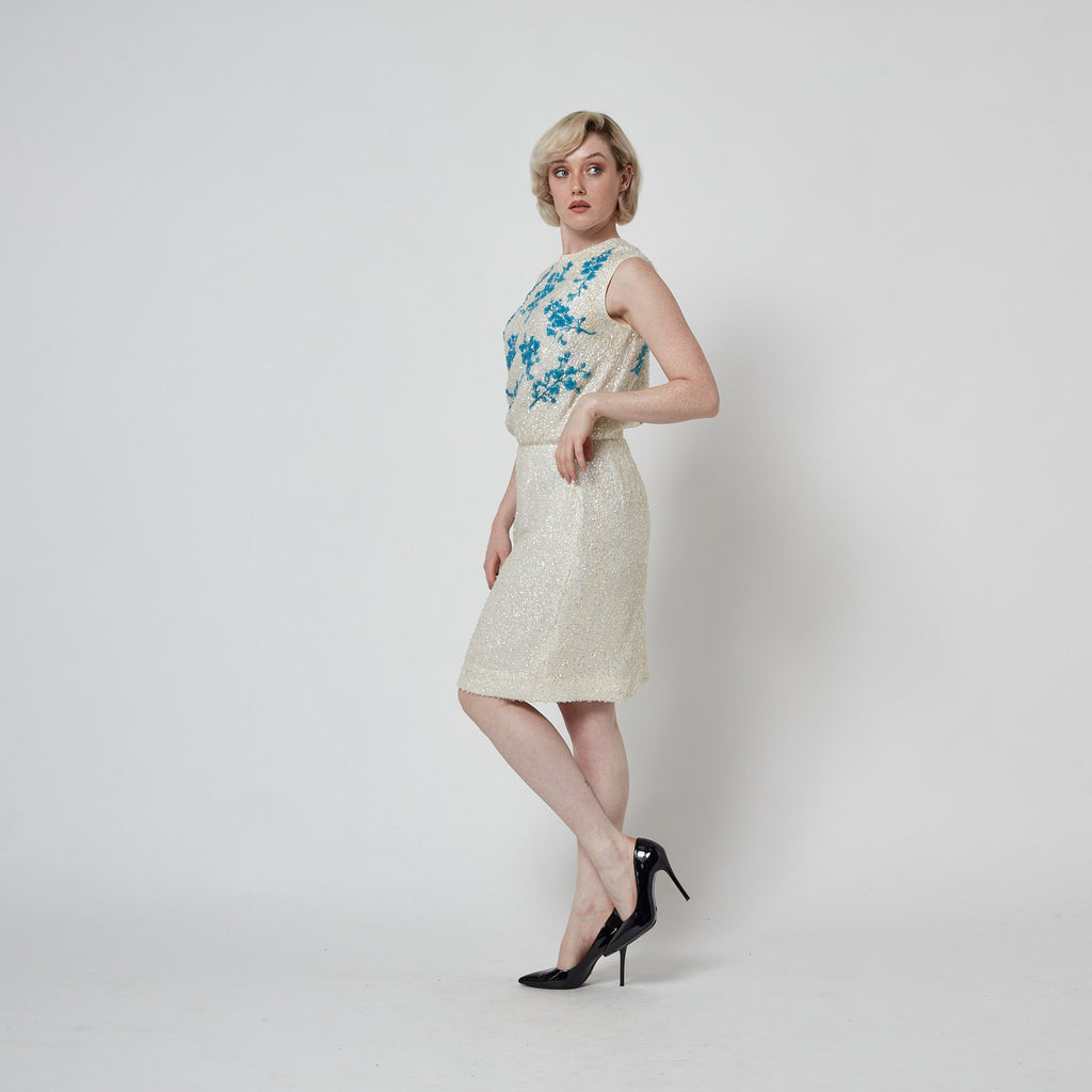 This early 1960s sequin and beaded dress was designed by Boutique by Jo Ro Imports. Crafted to the highest quality, it is tailored from rayon fabric and smothered all over in tiny iridescent sequins. The dress is cut to a shift-dress style, sleeveless with a rounded neckline. It has a blouson top which overhangs a nipped-in waist and falls to around knee length on most wearers. The top of the dress is adorned with further embellishment in the form of bright turquoise beads woven to form intricate vines dotted with flowers in bloom. The dress fastens at the back with a hidden tonal zip and hook-and-eye clasp. This beautiful dress is lined with white crepe. The label reads, “Made in Hong Kong”; an area known for its exceptional embellished garment making during the 1960s and 1970s.