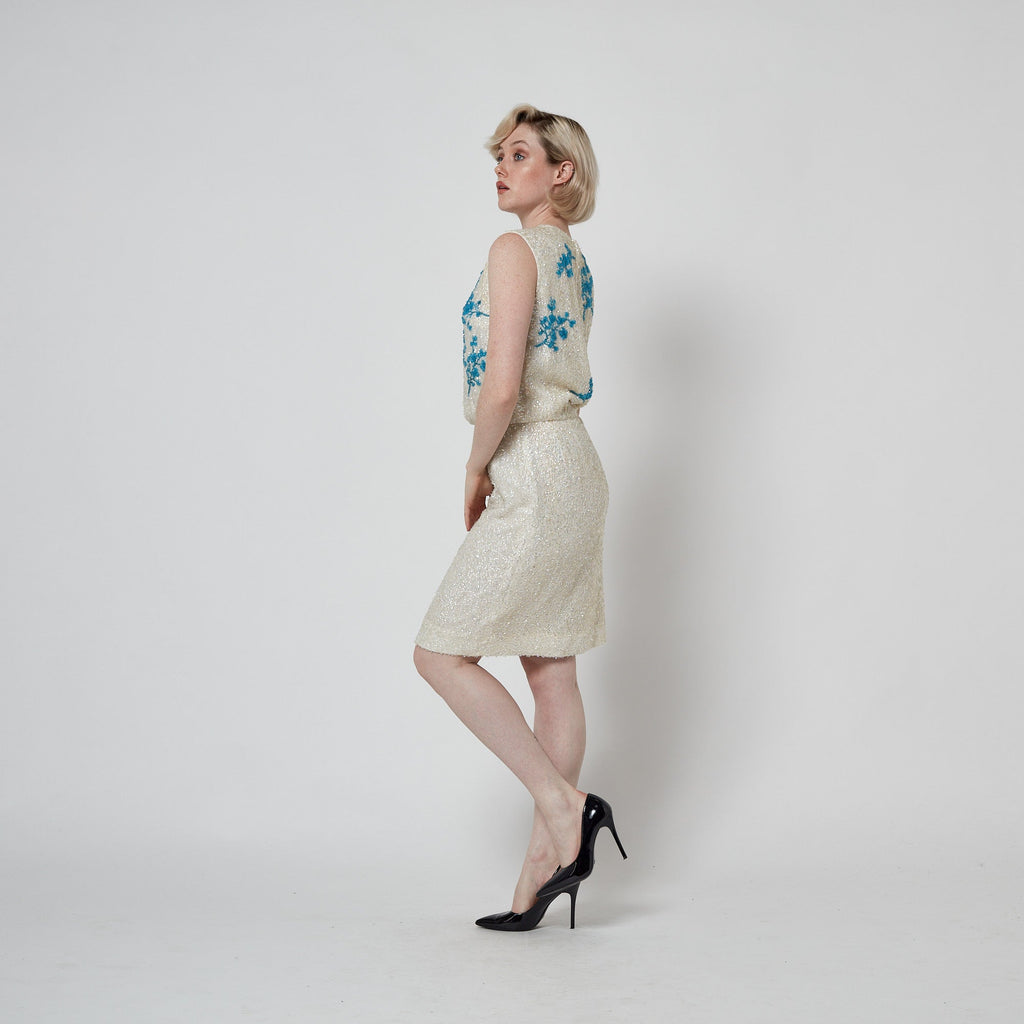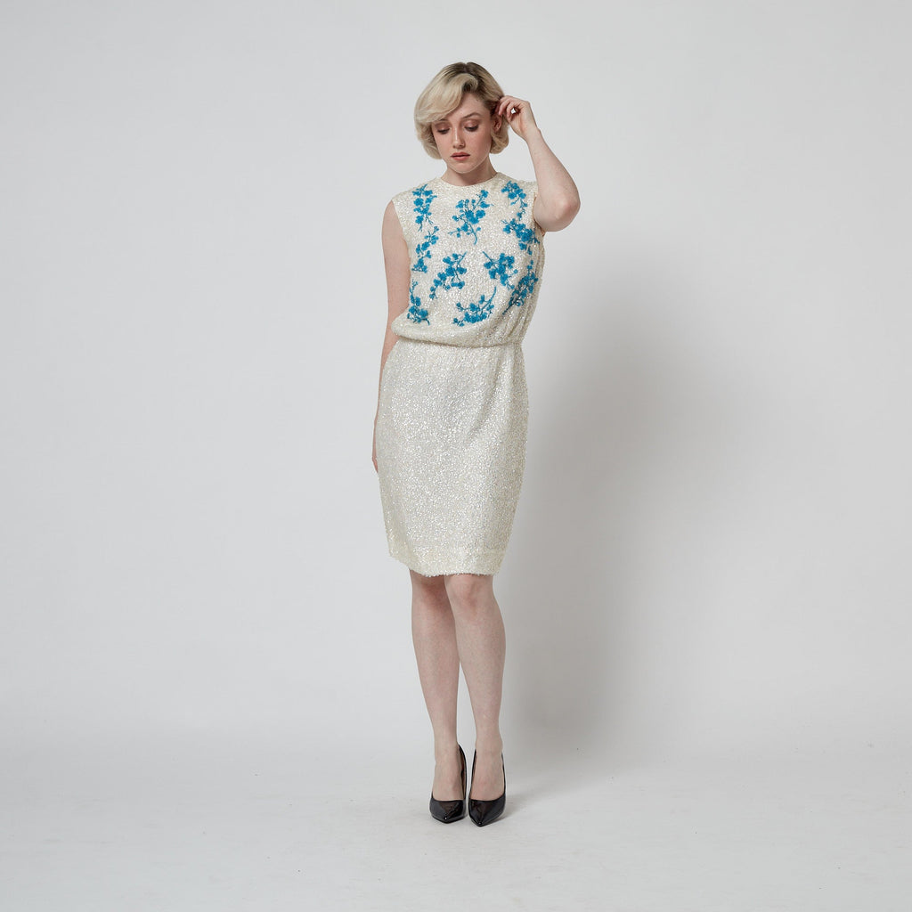 1960s Jo Ro Imports Blue and Cream Sequin Shift-Dress