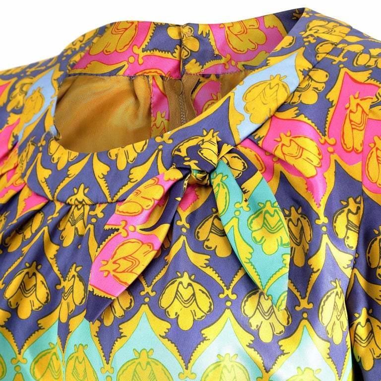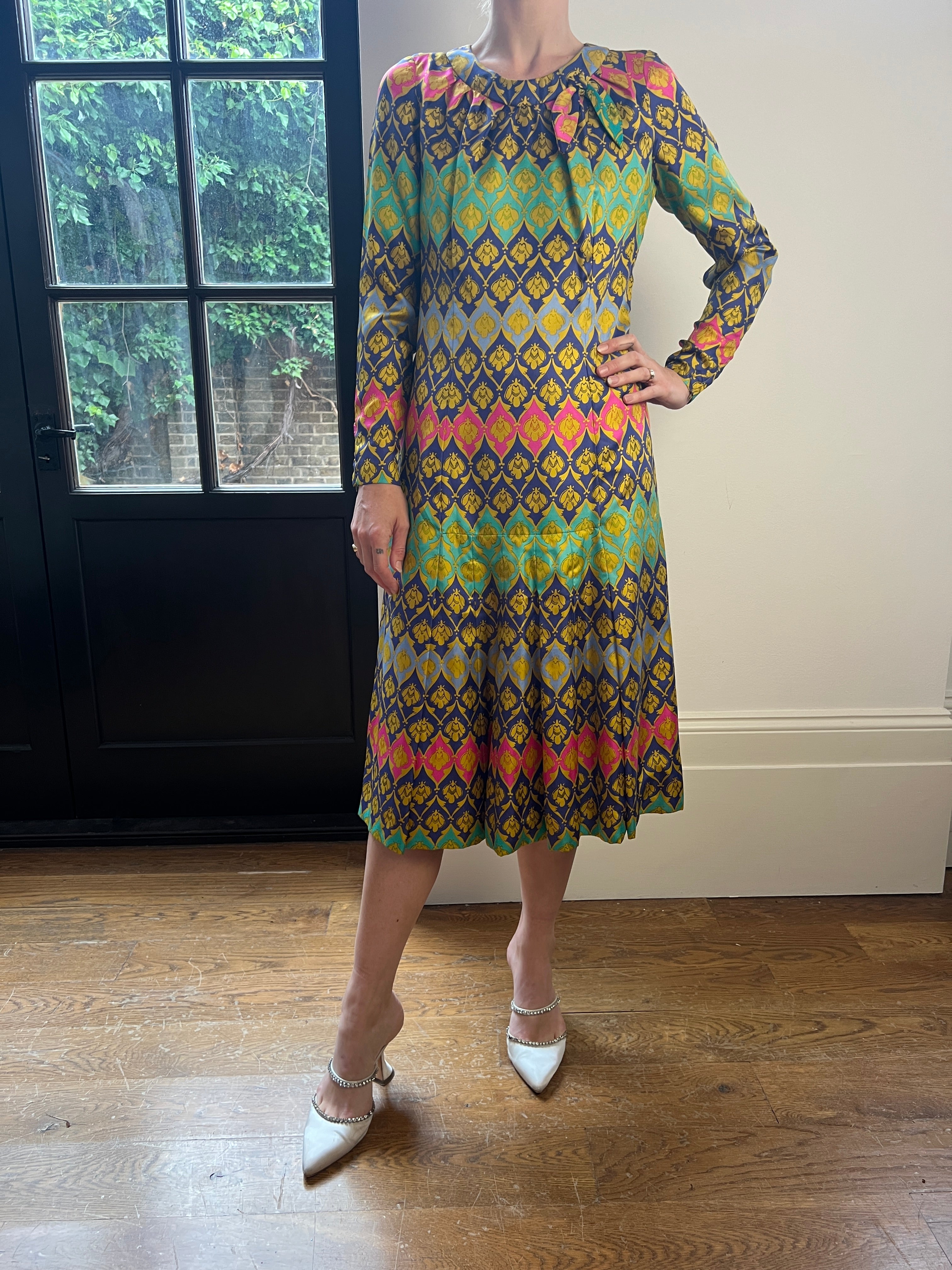 A 1960s silk bee print dress by none other than Lachasse, one of the oldest British couture houses having opened in 1926, it sadly closed its doors in 2006. The dress is entirely handmade and was made in the same tradition as haute couture fashion from the ateliers in Paris. Nearly all of Lachasse's clients were wealthy titled ladies, including royality and socialites. It is lined in mustard silk and the colours are turquoise, lilac, pale lilac and shocking pink. The dress has a high scoop neck with a fixed tie and princess cut seams. The front hem is arranged in seamed fan-like panels giving the dress fluidity of movement. It fastens to the rear with a concealed zip which is original to the dress as well as hooks and eyes. The cuffs on the long sleeves have small zips around 10 centimetres long.