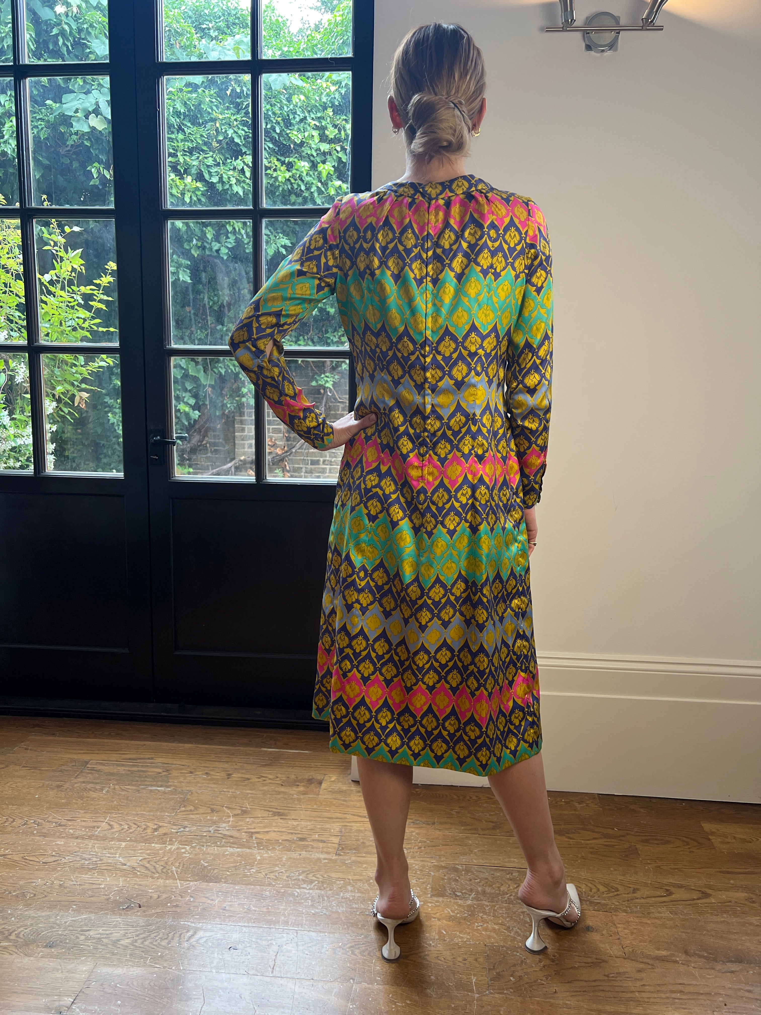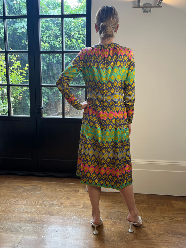 The condition of the dress is very good - very fresh looking and the silk has retained all its lustre. On close inspection there are one or two very small water marks which are well hidden in the busy print and are difficult to see unless inspecting very closely. This piece will improve further with each dry cleaning. There are also one or two stressed areas on the underside forarm seams on the sleeves. This is minor in nature and they cannot be seen when worn. Will best fit US 6-8, UK size 10-12. Our model is a UK 8-10 and 5ft 11in. (180cm), this dress was roomy on her.