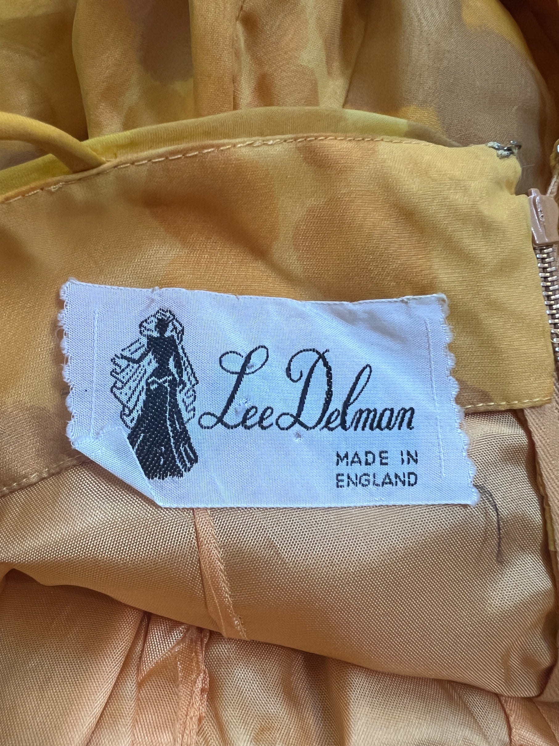 This 1960s glorious sunshine-yellow chiffon dress was made by Lee Delman in England; the label retailed in Harrods and sat in the top echelons of British ready to wear during the 1950s and 1960s. The chiffon is patterned with painterly, bubble-like polka-dots of varying sizes in shades of mustard, gold and brown. Cut to a timeless midi-silhouette with a nipped in waist, the chiffon is gathered across the ruched bust and culminates in a decadent chiffon petalled rose. The dress has double spaghetti straps crafted from the same fabric. The flattering skirt is cut to a pencil style, skimming the hips and falling to below the knee. The dress is lined in peachy yellow satin to complement the outer cloth. It fastens at the rear with a hidden tonal zip and hook-and-eye clasp. The skirt has a pleat at the rear for ease of movement.