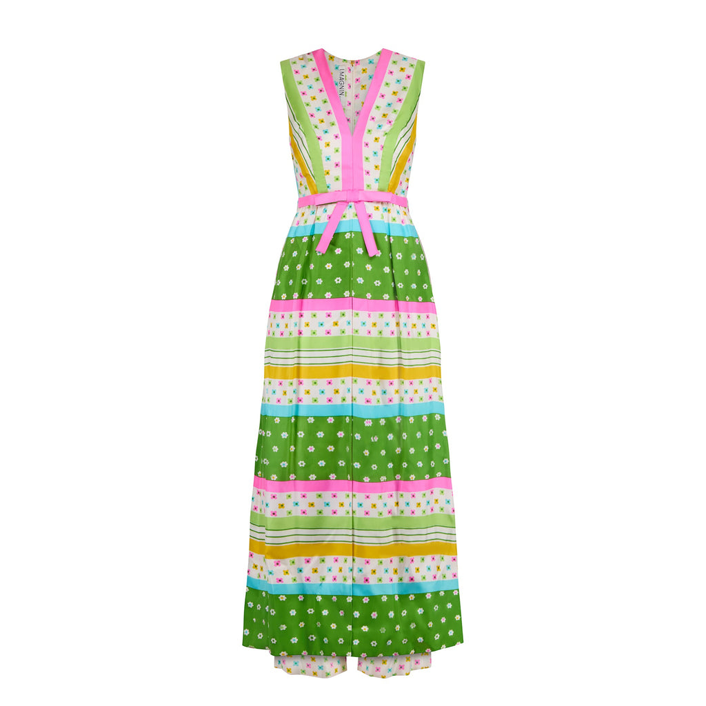 The top is tailored to a classic empire silhouette that falls to the ankle. The fabric is stunning, a twill silk printed with horizontal stripes in fuchsia, apple-green, mustard and turquoise and dotted with flowers in the same hues. The top is sleeveless with a V-neckline outlined in fuchsia pink. It fastens at the back of the neck with a hidden zip and hook-and-eye clasp. At the waist, sits a fuchsia pink grosgrain belt, crowned at the front with a flat bow. The front of the dress has a high slit, revealing the trousers underneath. The coordinating white trousers are cut to a straight-leg silhouette and have a high-waistline. They are printed all over with the same flowers as the dress. They fasten at the back of the waist with two hidden hook-and-eye clasps and a hidden zip.