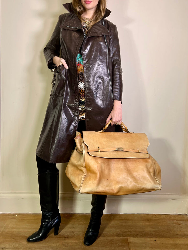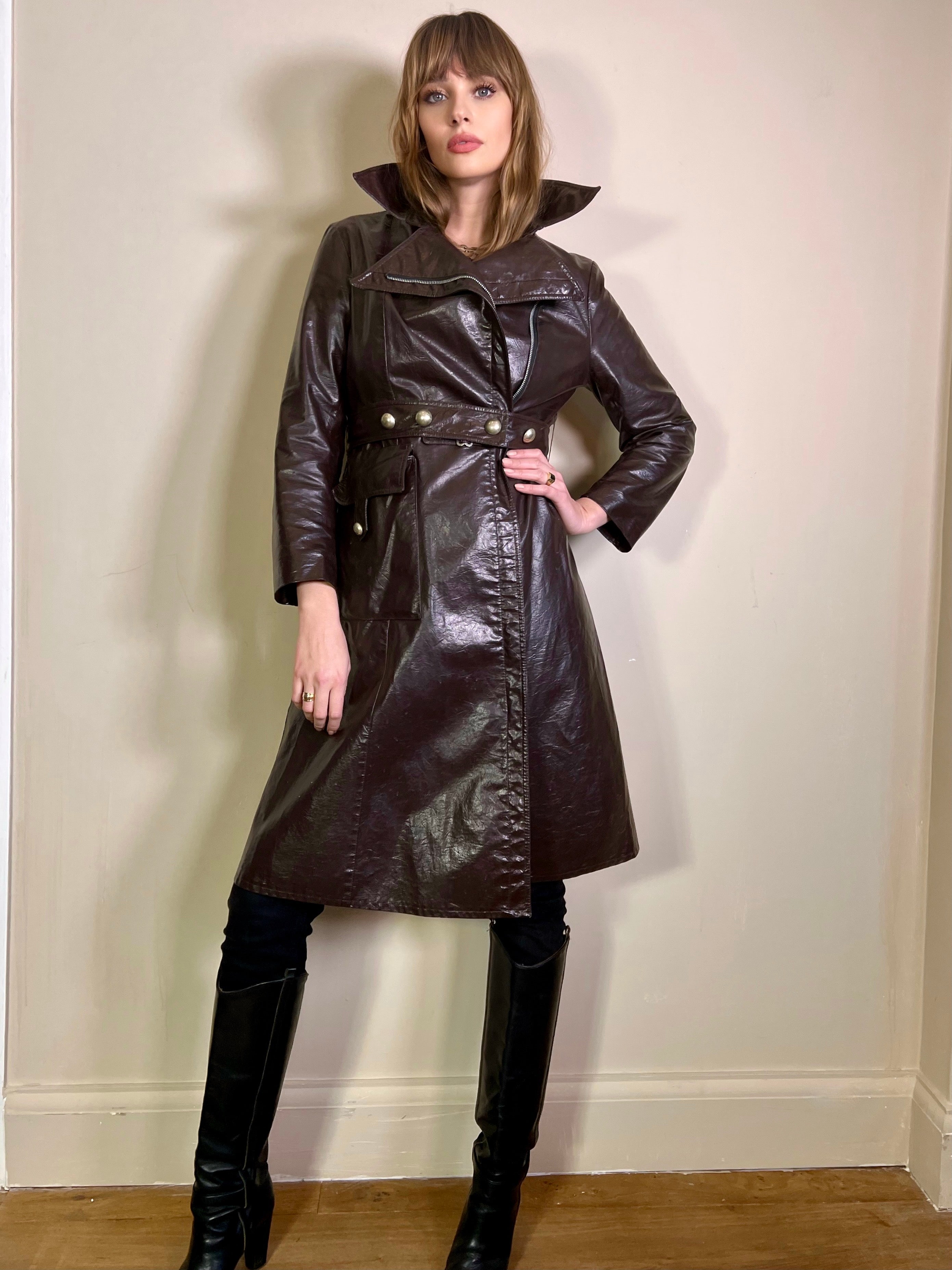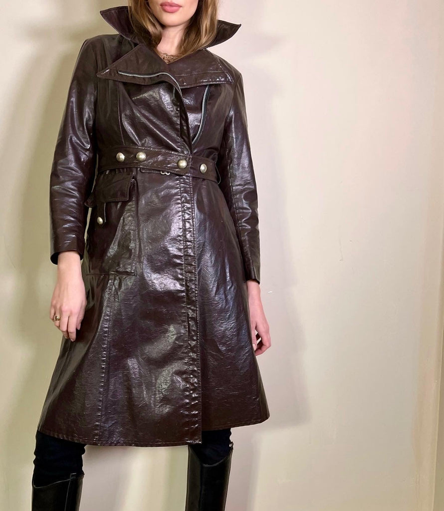 Fab dark brown faux leather 60s trench coat full of cool details. Has a front zip, a large side pocket and metal circular buttons on belt and pocket. The real hero is the fit which exemplifies the 60s fitted mod vibe.