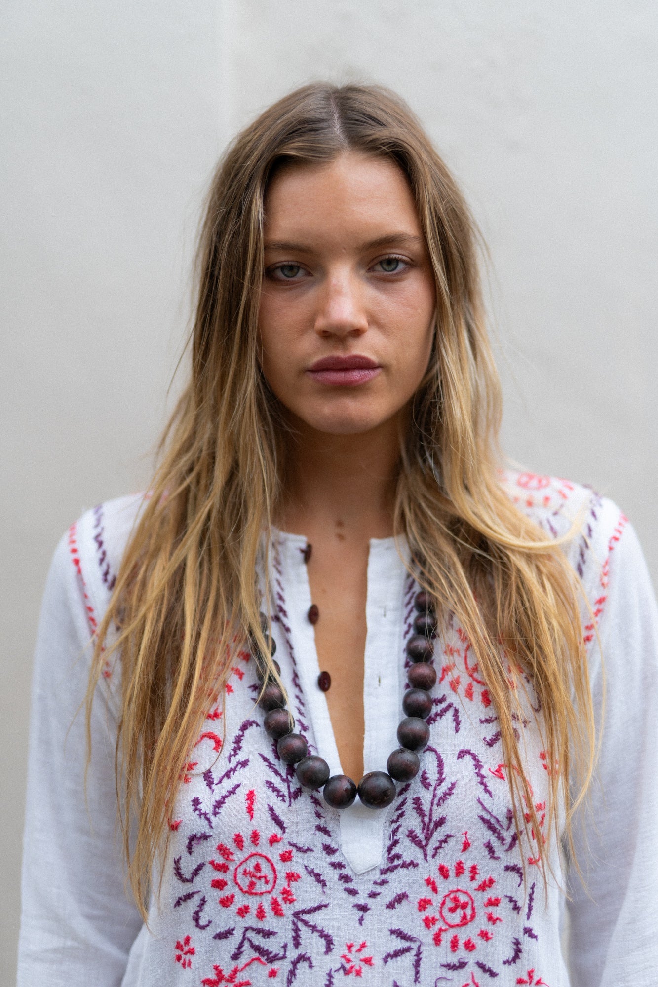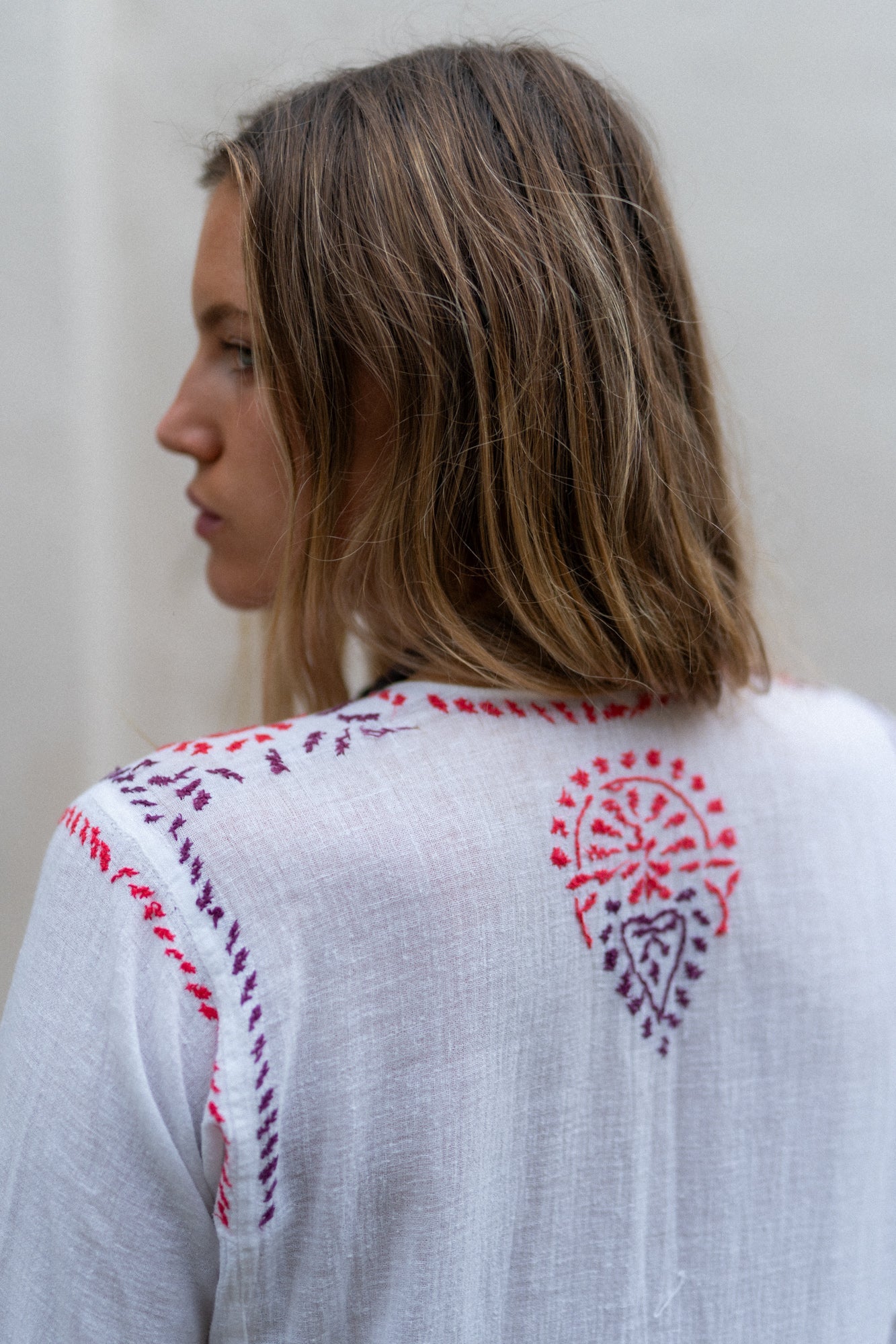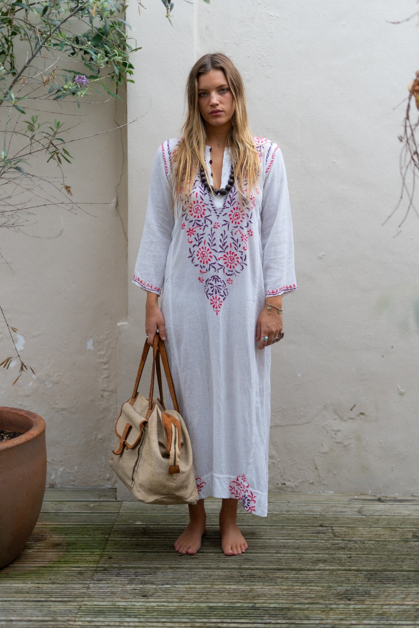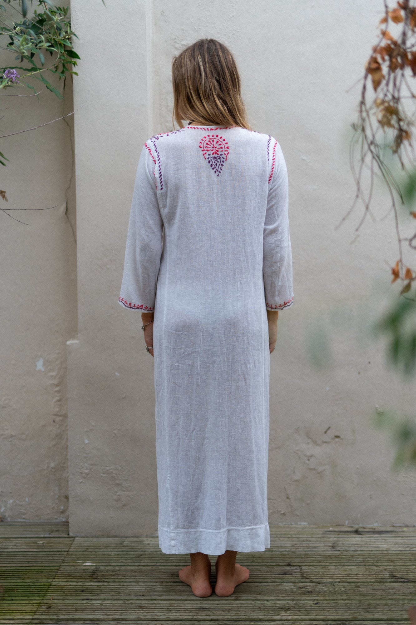 LATE 1960S HIPPIE DRESS. MADE FROM CHEESECLOTH COTTON WITH SURFACE EMBROIDERY. BUTTONS AT THE NECKLINE TO CLOSE. IN GREAT VINTAGE CONDITION.