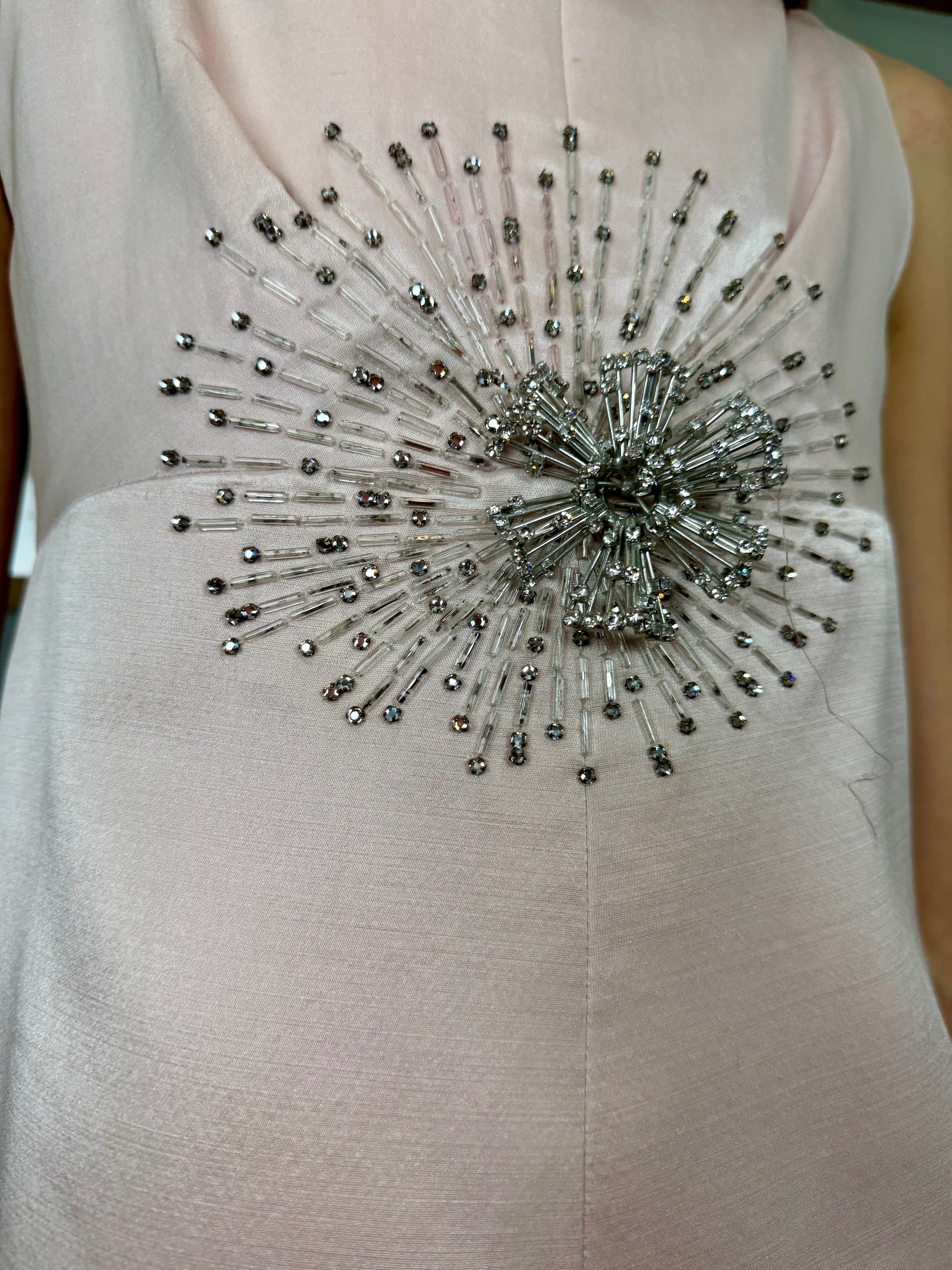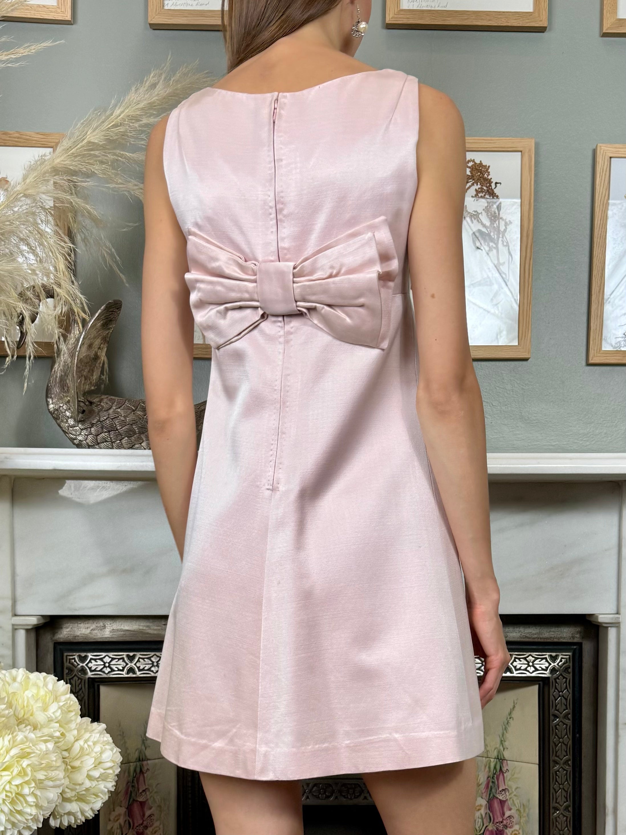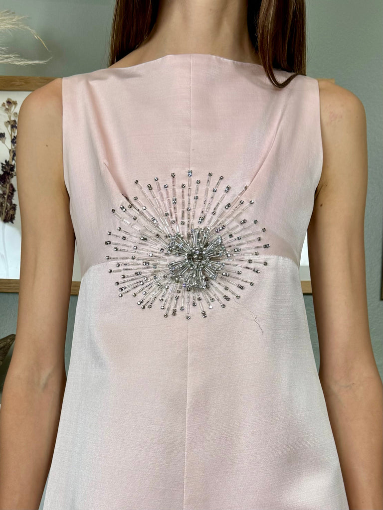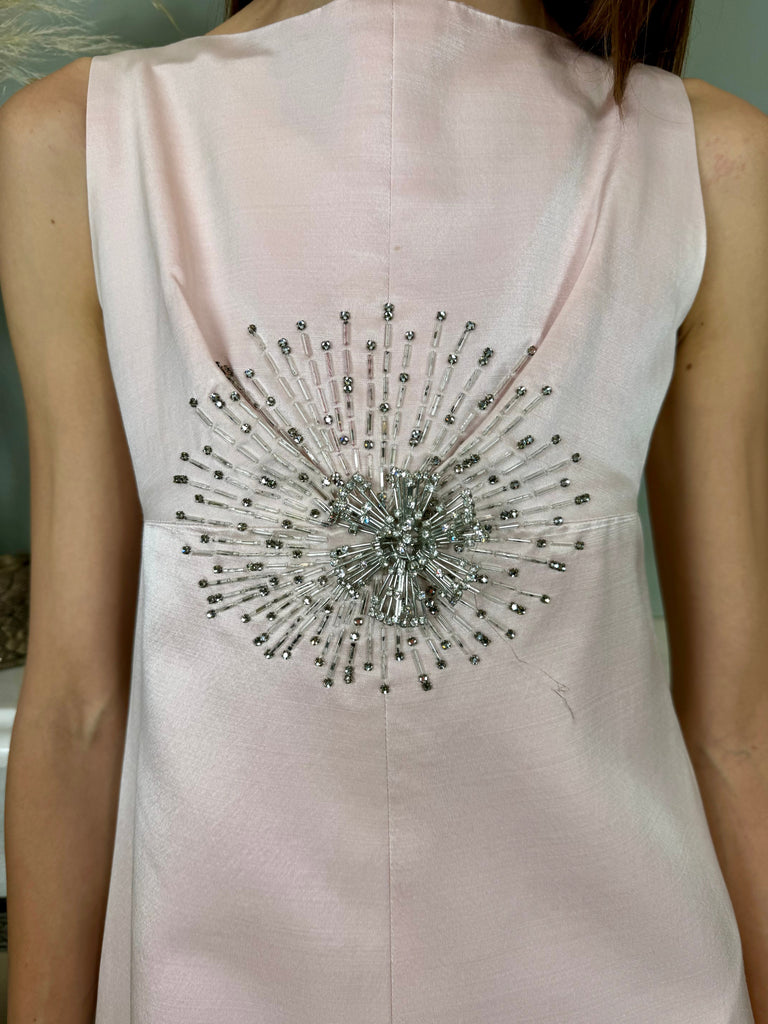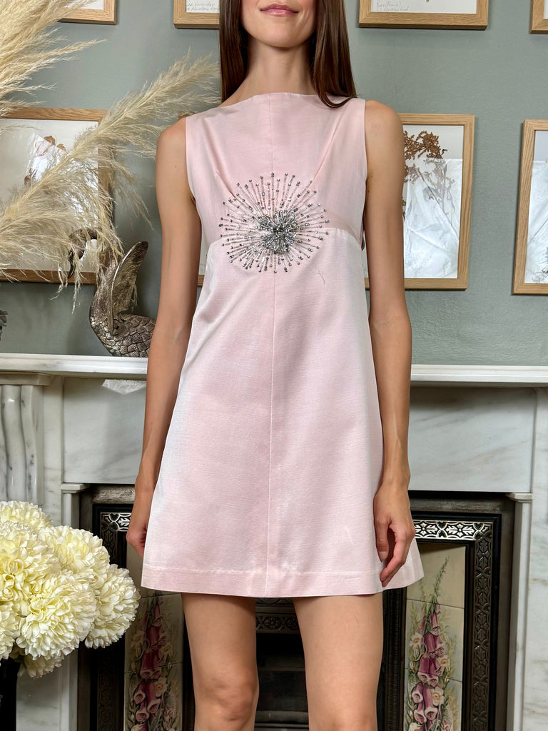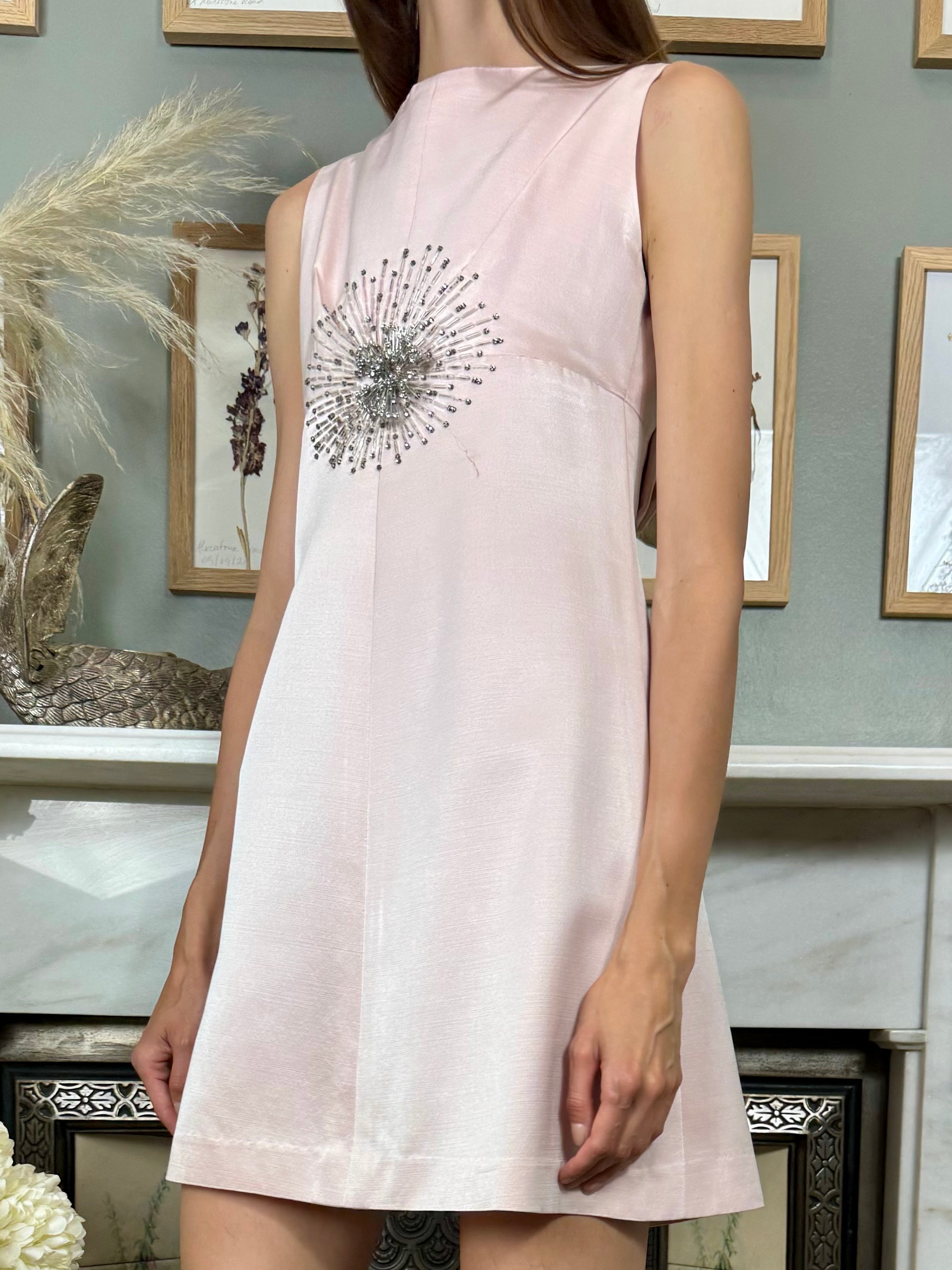 The Yana 60s pink short beaded dress is a stunning A line dress that exudes vintage charm. Its sleeveless design is accentuated with a delicate bow detail on the back waist, while a zip fastening makes it easy to wear. Complete with a dazzling sunburst of beads on the bust, this dress is perfect for those looking for a short neat dress.