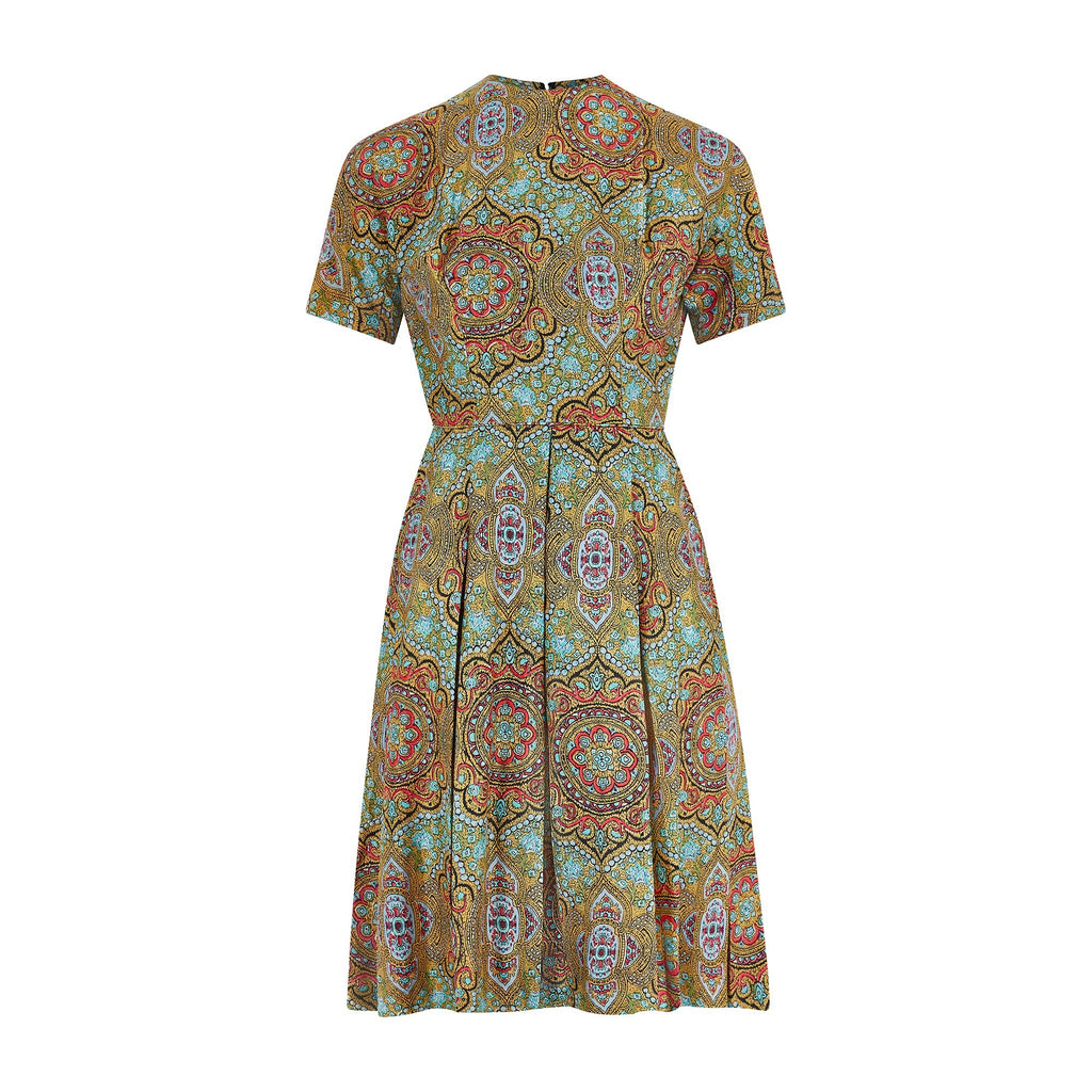 1960s Mustard Paisley Silk Short-Sleeve Pleated Dress