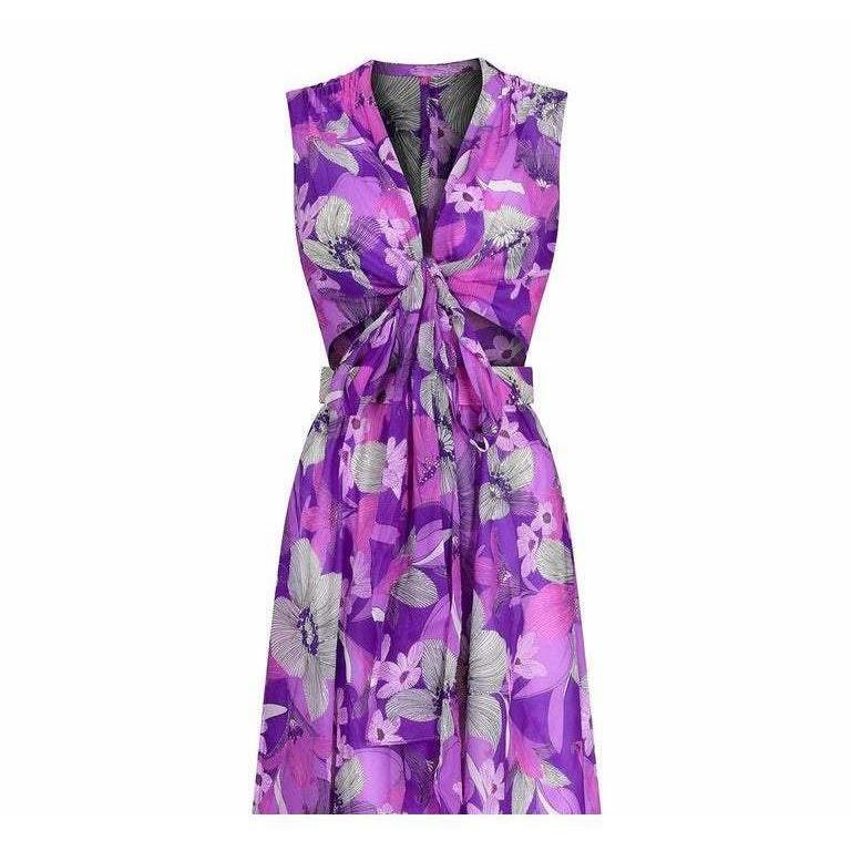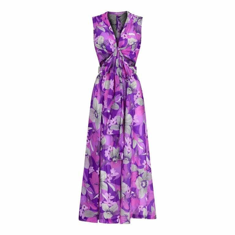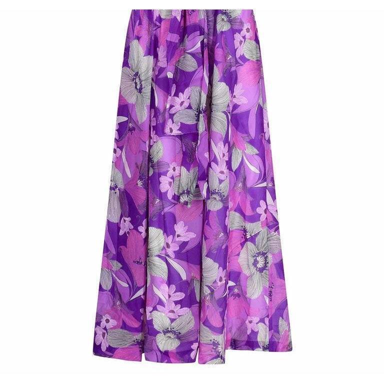 This is a really fun and original two-piece resort-wear or "riviera-wear' skirt set. It probably dates from the late 60s or early 70s and is couture made. It would certainly hold its own today on the beach in Cannes or Malibu! The skirt is exceptionally well made and is composed of a man made georgette-type fabric in the most fabulous shades of purple, lilac, white, grey and pink. It is completely lined in a quality cream acetate and fastens to the side with the original purple metal zip as well as hook and eyes. The skirt length will be ankle length or just above on the average height woman. The top is a sleeveless, front fastening, tie wrap that crosses over at the bust. It wraps around the waist and could be tied at the front or the back depending on preference. The top is not lined. This set has lost its original designer or retailer label but it is incredibly well made. We suspect this came from a very high end British fashion house due to the craftsmanship which is at couture standards. Condition wise it is excellent - there are no issues of any note. Will fit UK 8 or US 4 best.