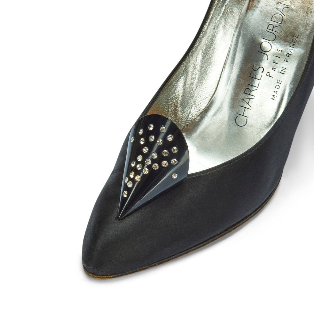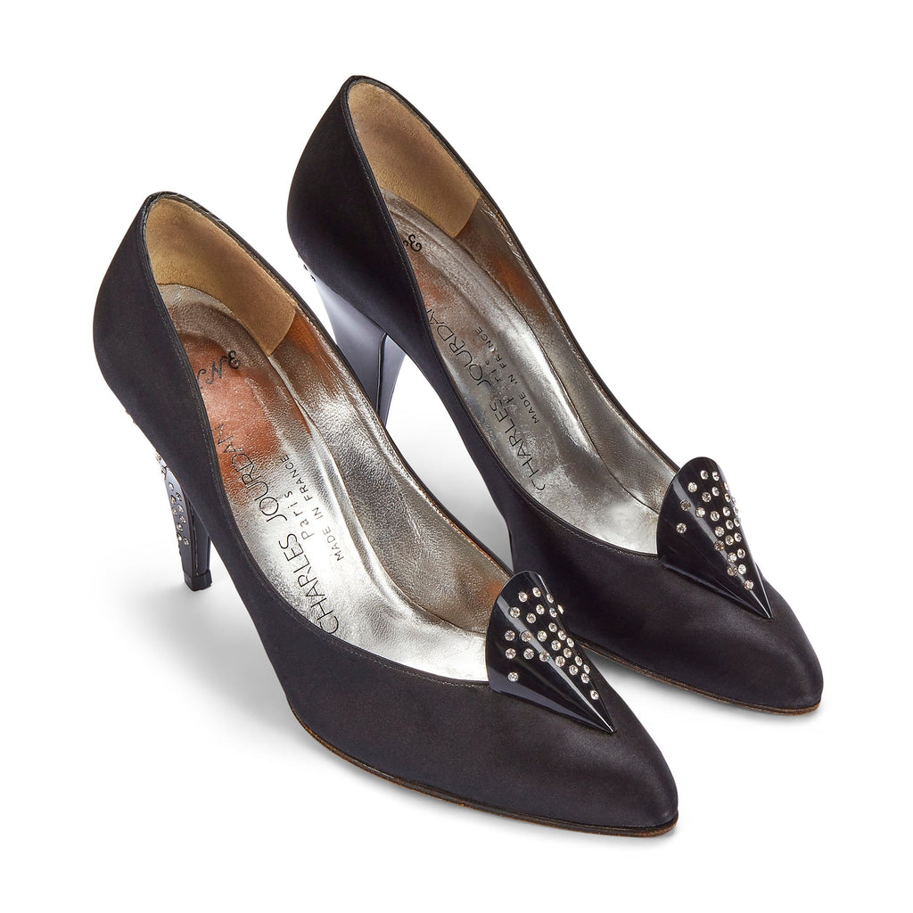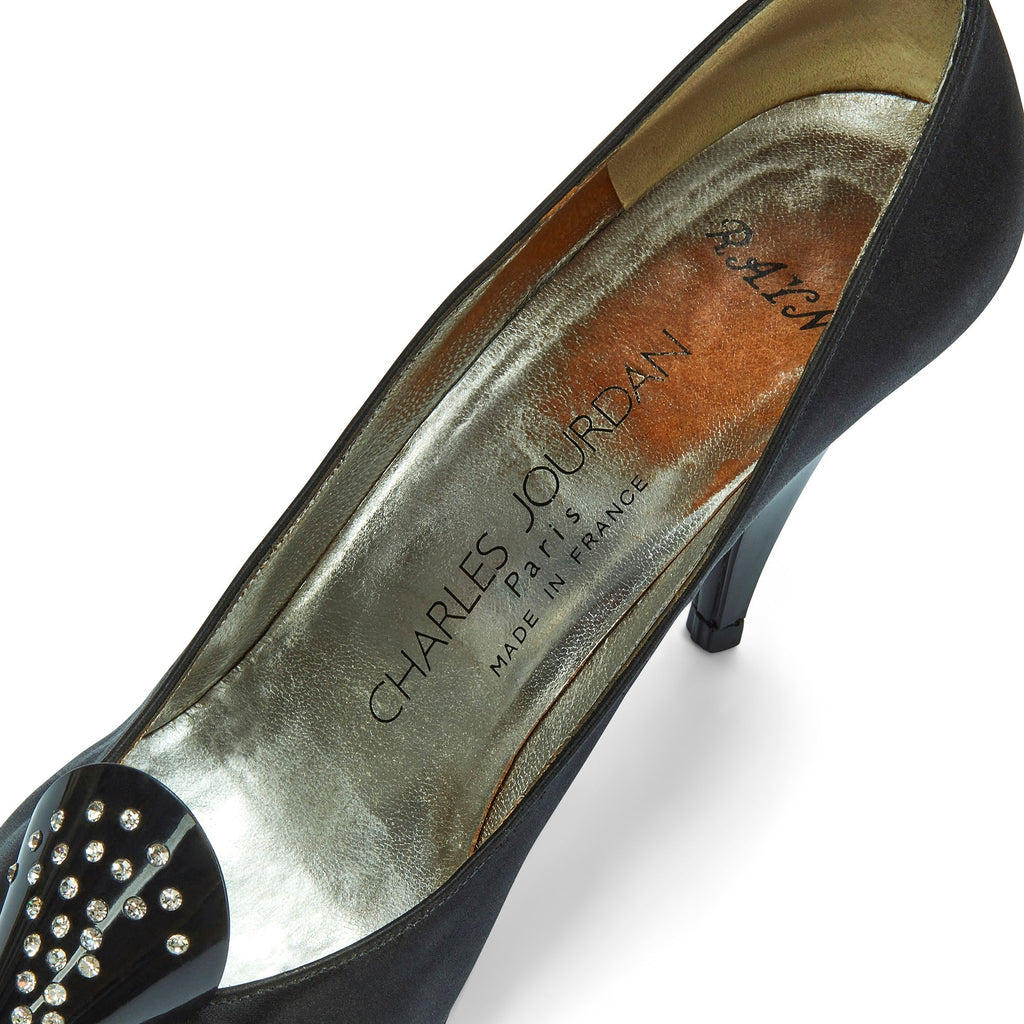 1970s Charles Jourdan for Raine Black Satin Diamante Heel Shoes
