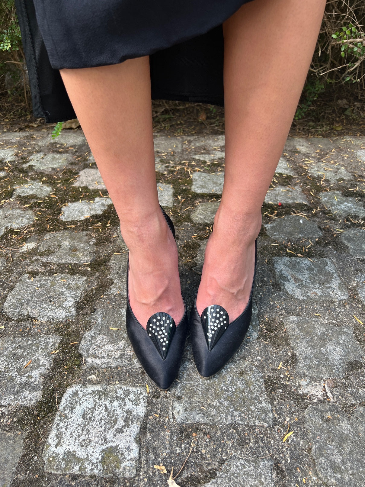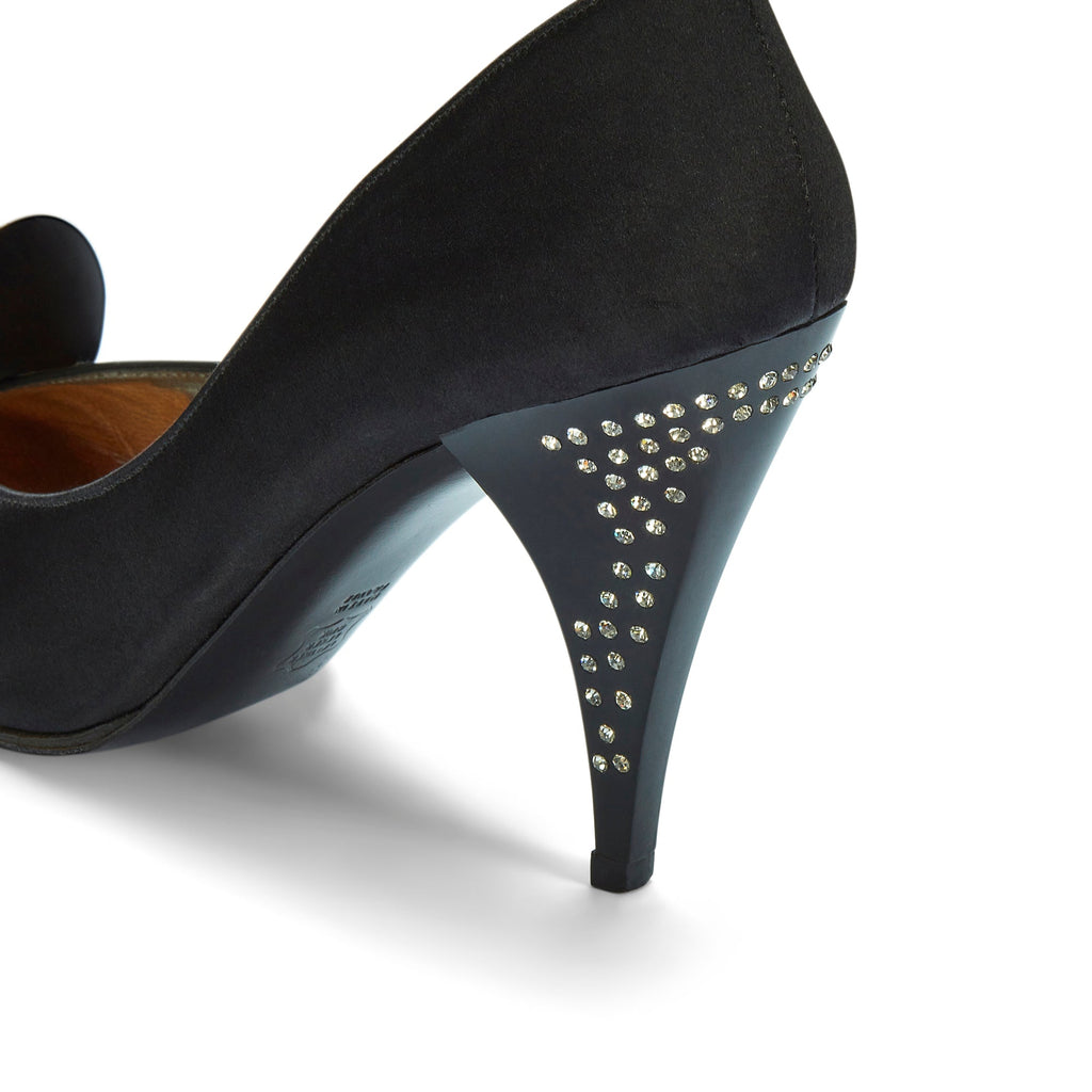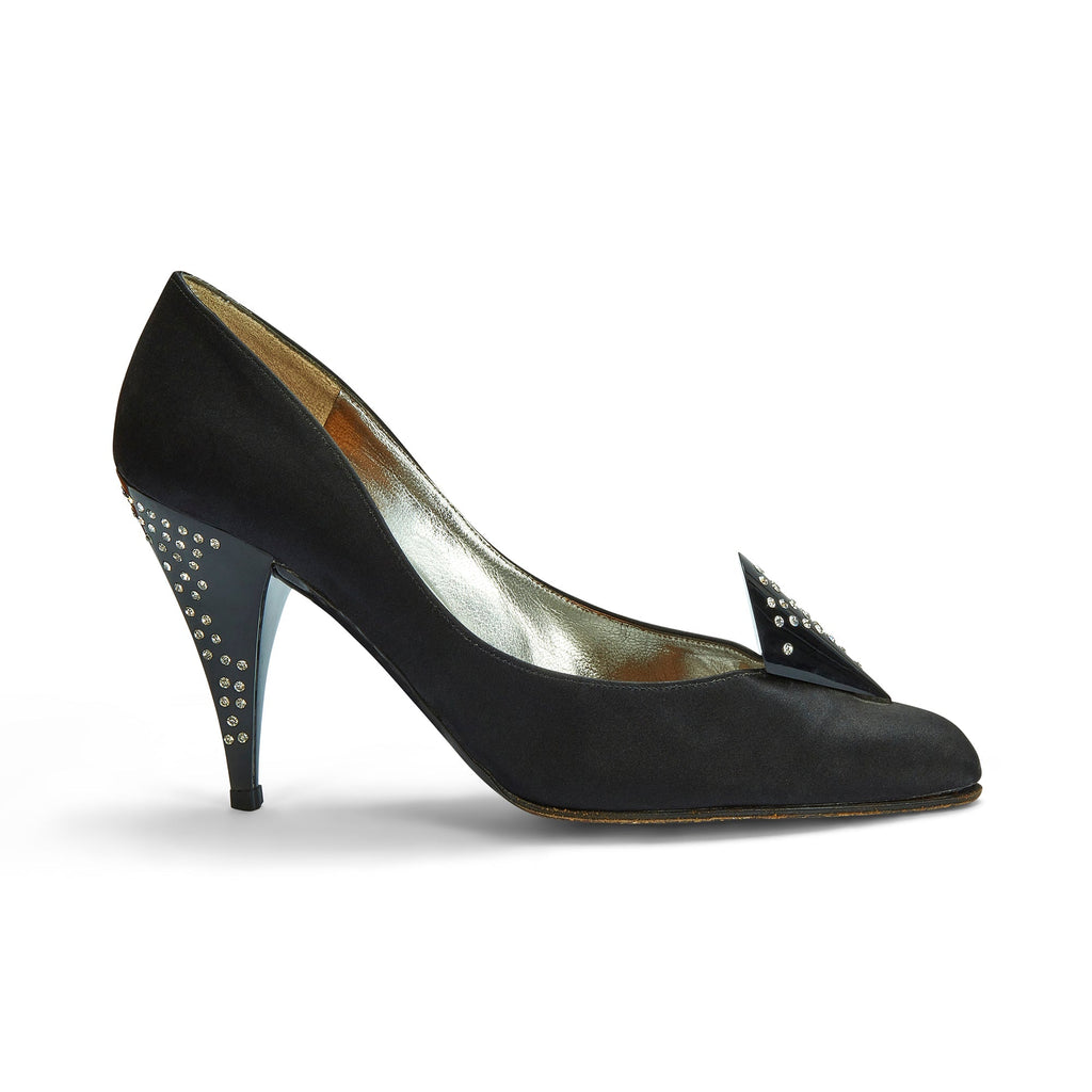1970s Charles Jourdan for Raine Black Satin Diamante Heel Shoes