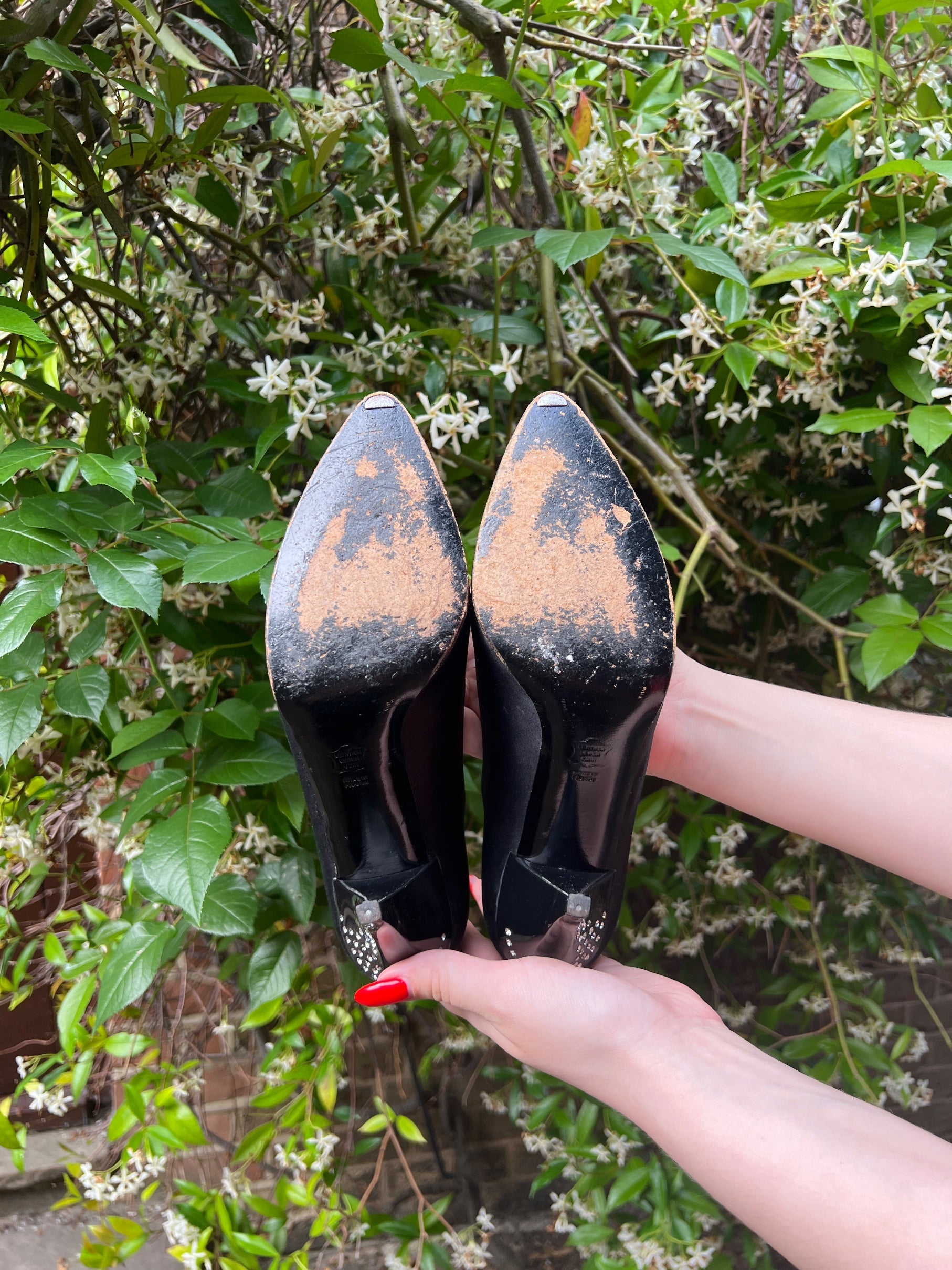 These 1970s stilettos are inspired by the flapper and art deco designs of the 1920s and are crafted from black satin with a polished silver leather lining. Highly glamorous they are detailed with glittering rhinestones on a polished plastic heel and on the sculptural plastic form at the front of the shoes. Made in France, for legendary British shoe maker Rayne, the soles are labelled with “leather lewer cuir”. These shoes are in very good vintage condition with no flaws to the outside. Please note that some of the inside silver lining has worn away and they have light wear to the soles. The shoes measure to be a UK size 6 and a narrow fit.