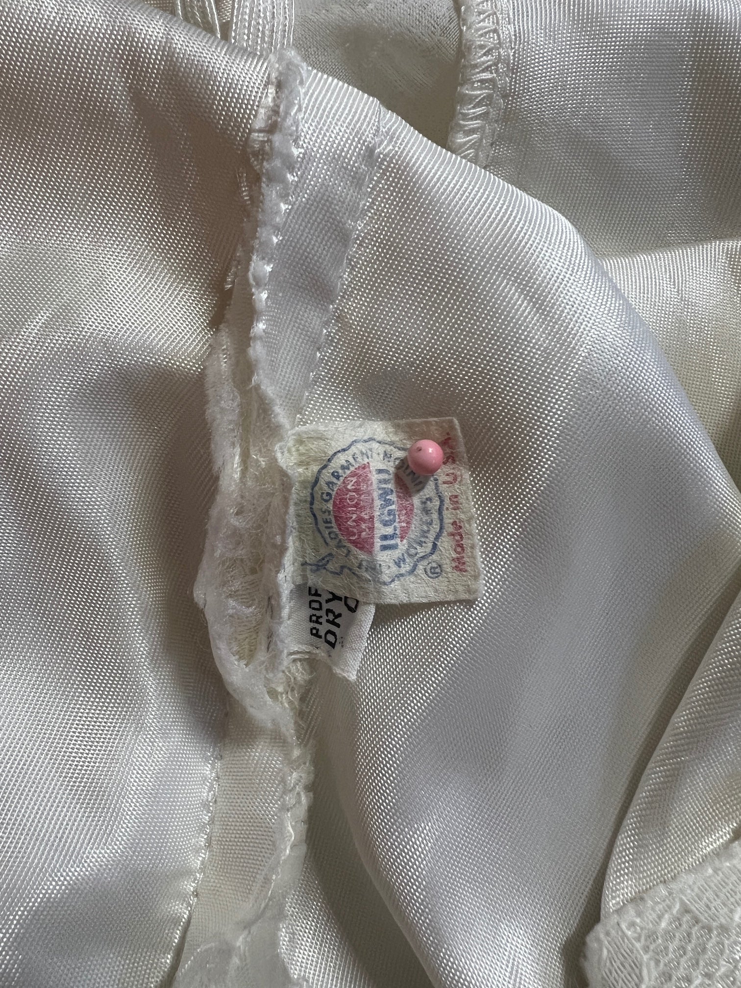 This wedding dress is in very good vintage condition and the lace element is without fault and fresh looking. There are a few faint marks and tiny knicks on the bottom layer of satin which cannot be seen when worn. The designer or retail label has been lost to the passage of time and the only remaining label is for the International Ladies Garment Workers Union (ILGWU) from the period 1974 to 1995. The fabric does not have any stretch and we estimate this will fit sizes up to a UK 8-10 or US 4-6 with plenty of room in the hip.