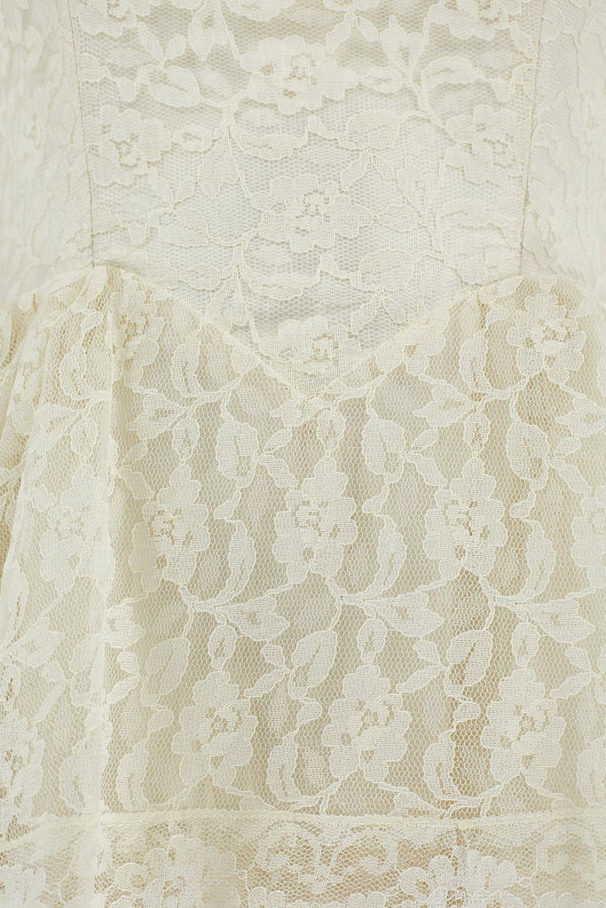 Made in the USA circa 1975, this enchanting wedding dress, with its tiered construction and layers of delicate lace, is an unforgettable choice for any vintage-loving bride. It has a long-sleeved top with a fitted bust and wide, rounded neckline trimmed with a lace ruffle. The silhouette is fitted at the waist and there is a zig-zag hemline, below this, the frothy lace layers start to fall. Five tiers of machine made lace with delicate scallop hems fall across the sides of the skirt. These layers swirl around the wearer and up-close, the detail of the beautiful lace is revealed, composed of intricately woven leaves and flowers. The dress has a small train at the back which puddles on the floor. A concealed, tonal zip and hook-and-eye fastens the back. This dress is fully lined in ivory satin - probably viscose or acetate.