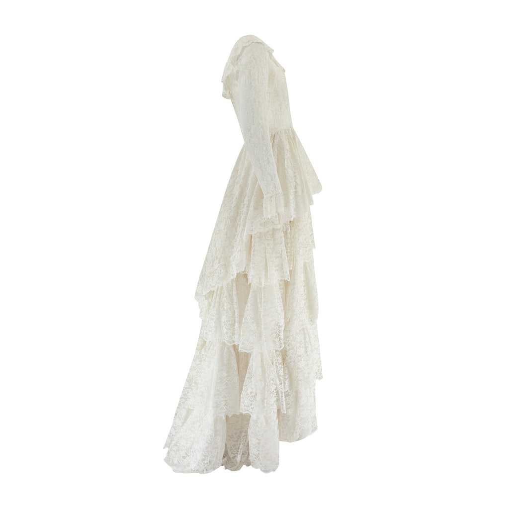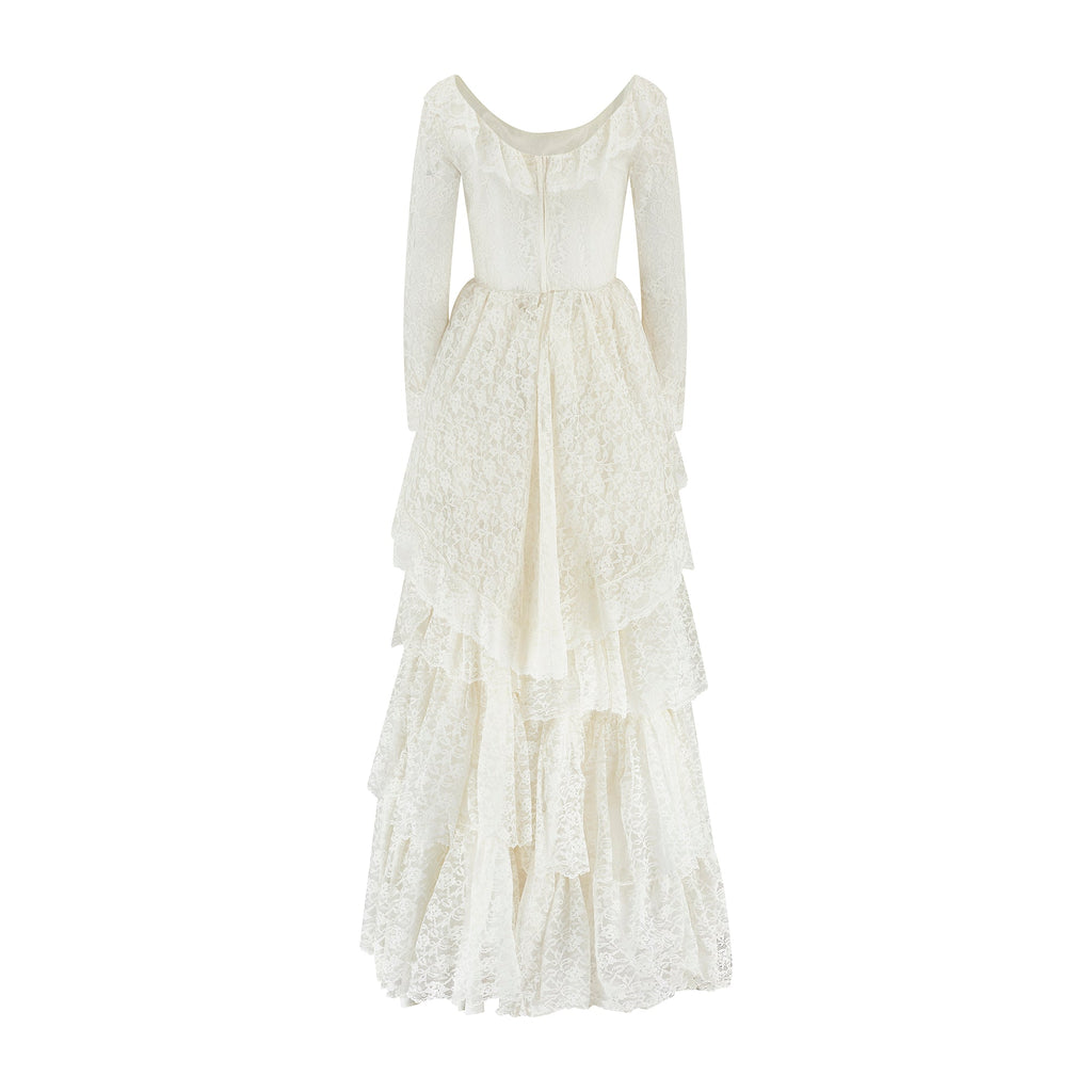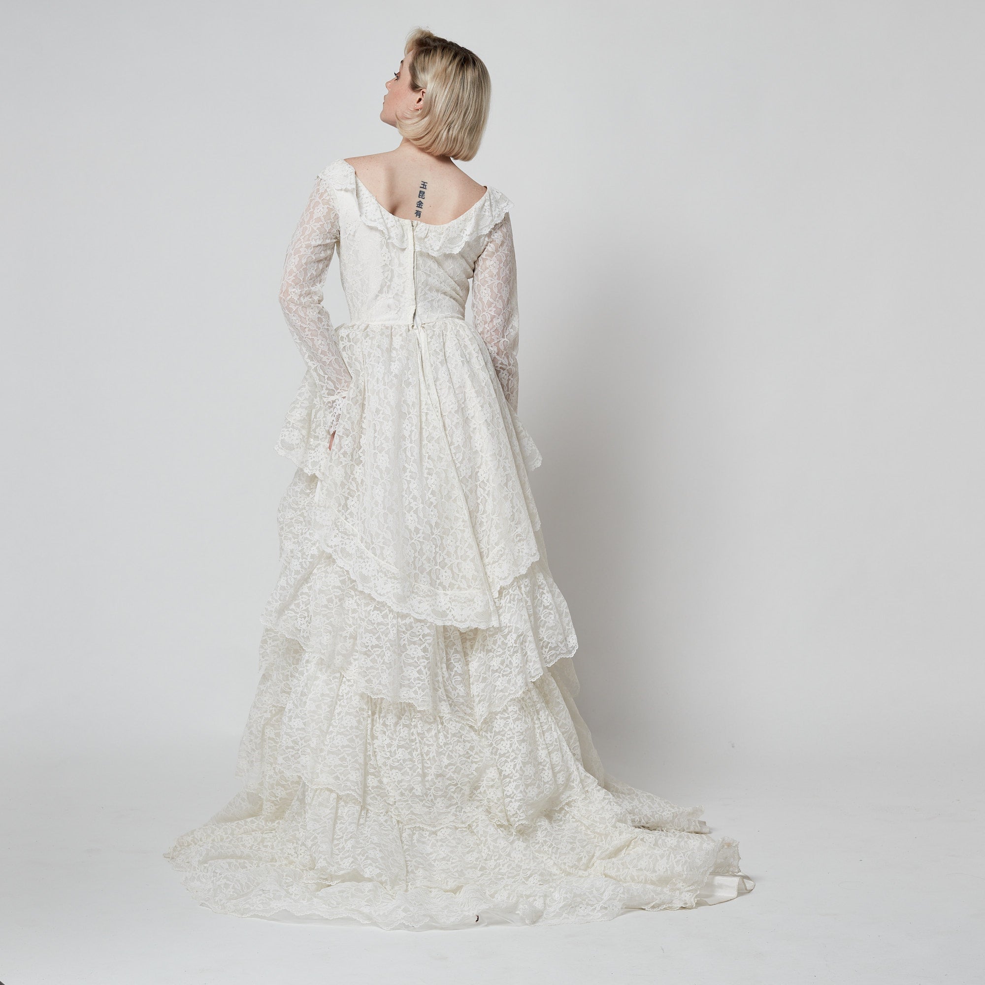 1970s Five Tier Lace Wedding Dress with Wide Neckline
