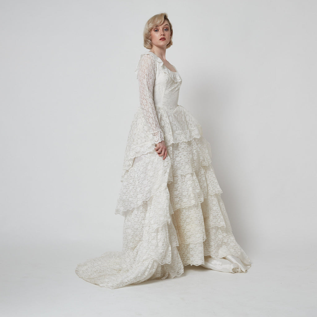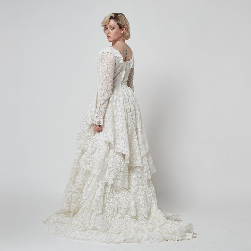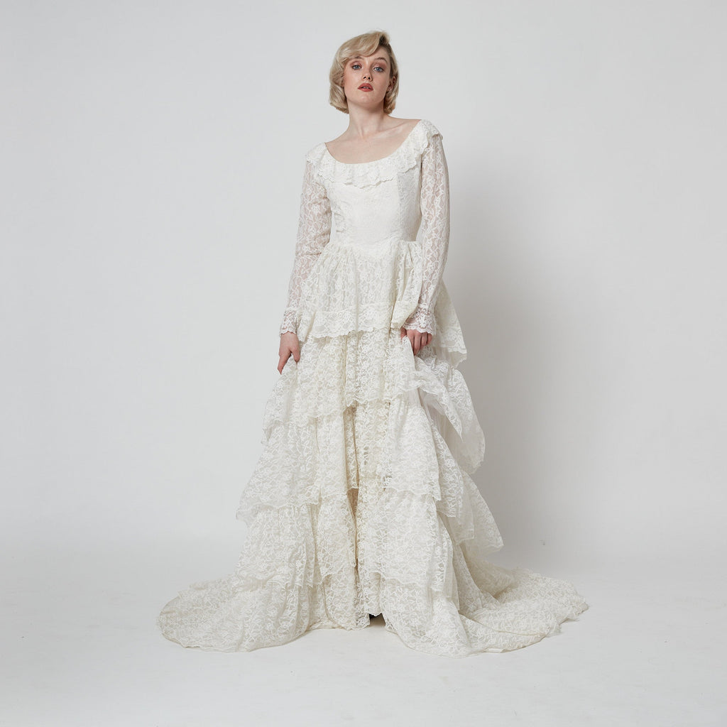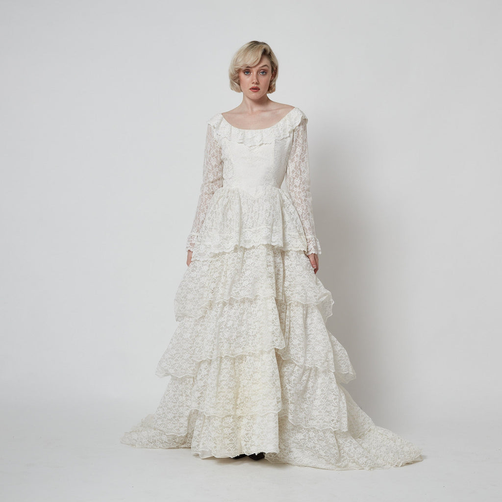 1970s Five Tier Lace Wedding Dress with Wide Neckline
