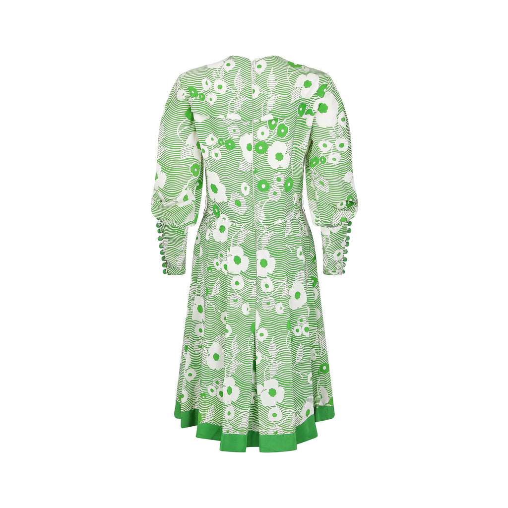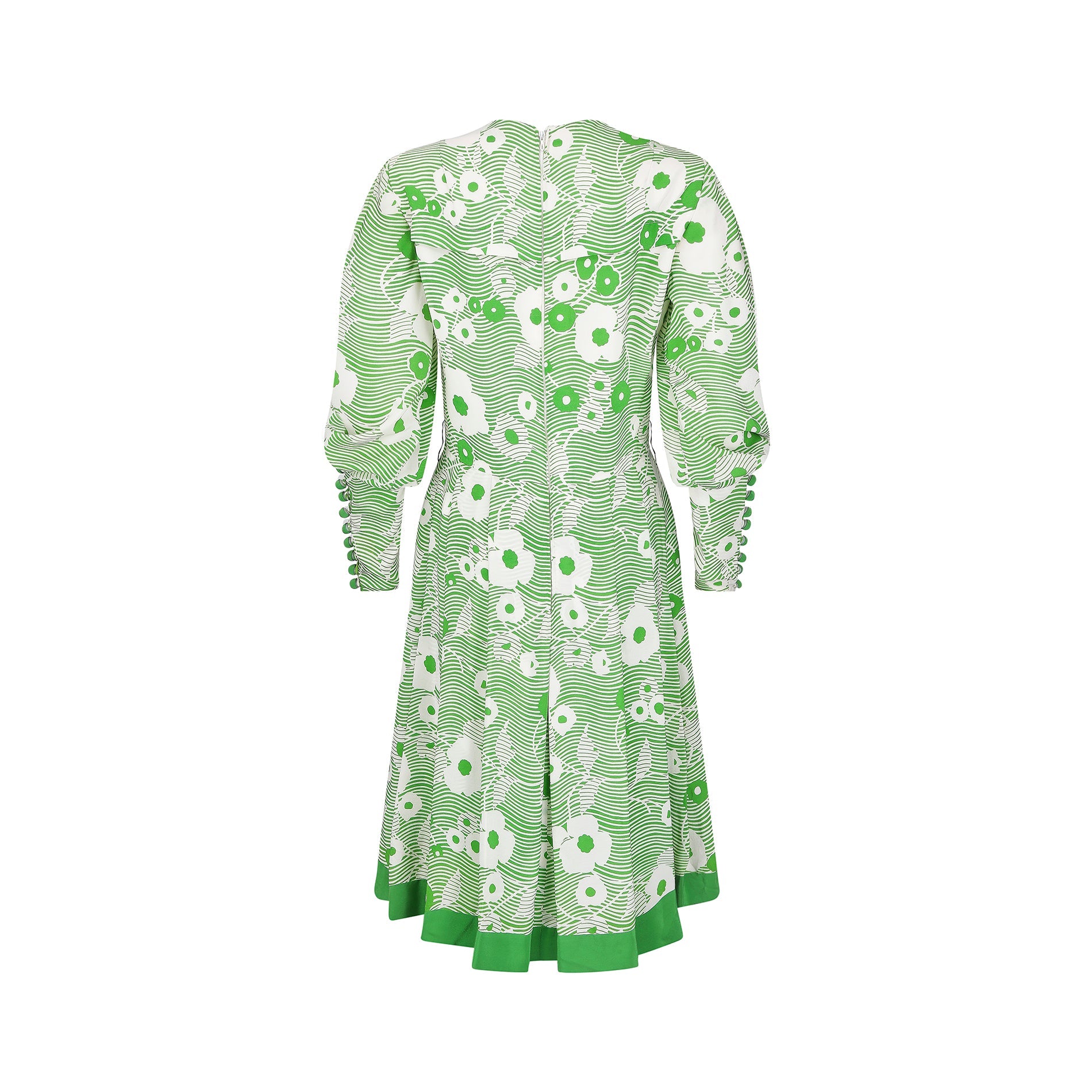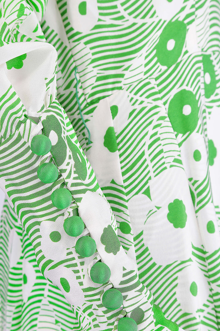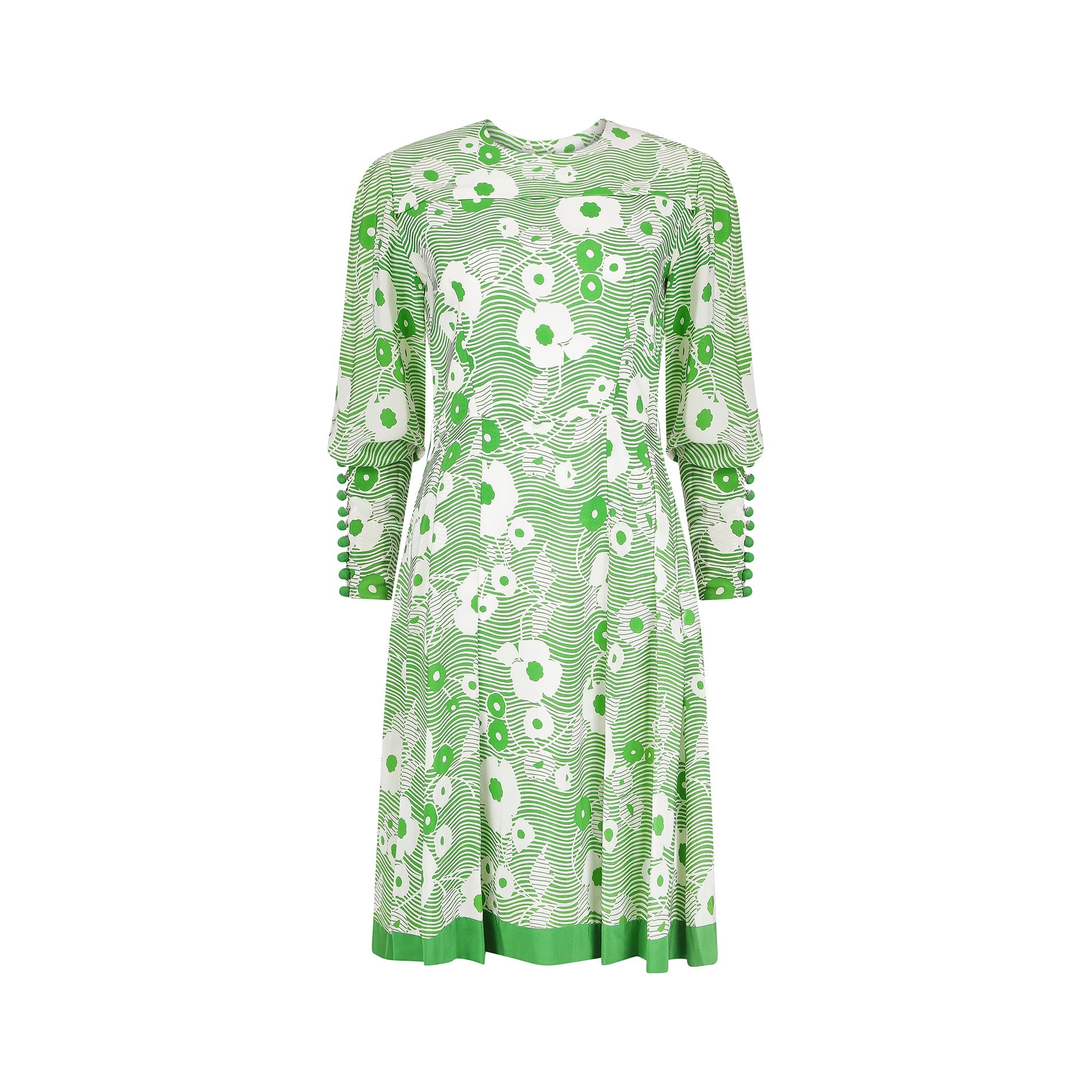 This 1970s French couture green and white dress in silk crepe features a striking floral fabric design. It has a softly rounded neckline and fastens down the back with an original white couture zip, complete with hook and eye fastening. The print consists of a pattern of abstract, wave like lines, interspersed with green and white flowers. The sleeves are long and loose to the elbow, and then narrow along the forearm, fastening with a row of green fabric buttons on each cuff. From the waist the skirt flows beautifully down to around knee length, and is finished with a contrasting green silk trim all the way around the hem. The skirt itself is pleated on the left and right sides of both front and back, which excites movement and gives the dress a floaty appearance. The skirt portion of the dress is lined in a quality white acetate.