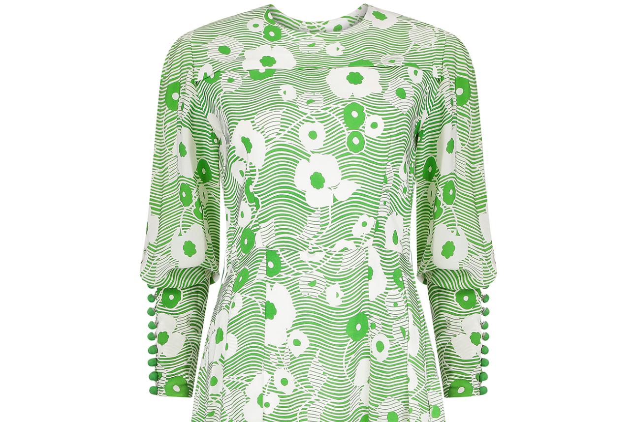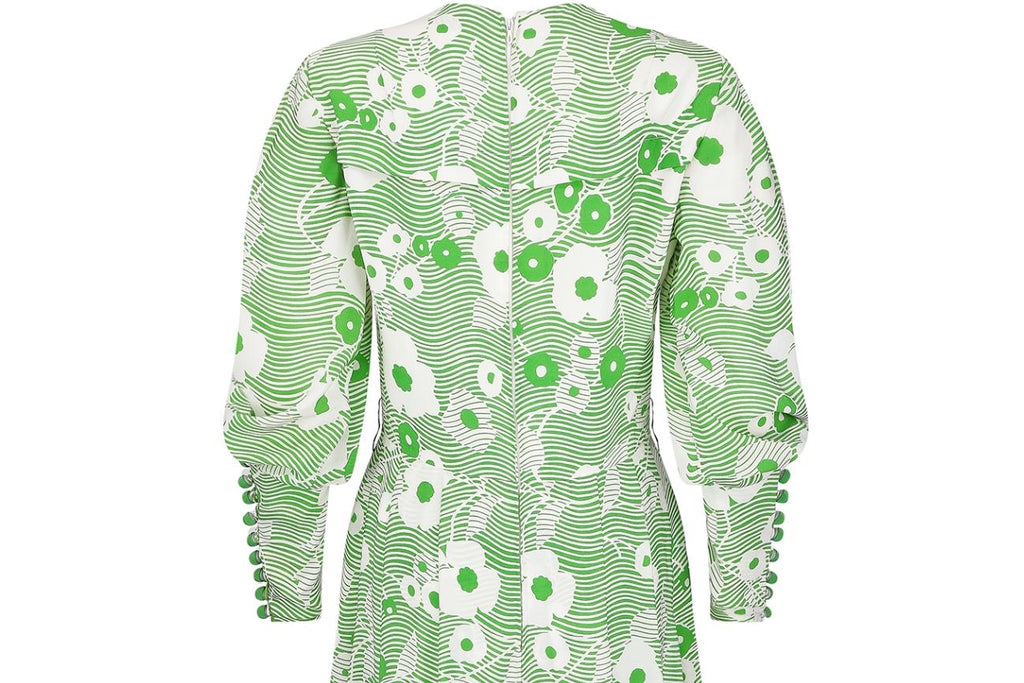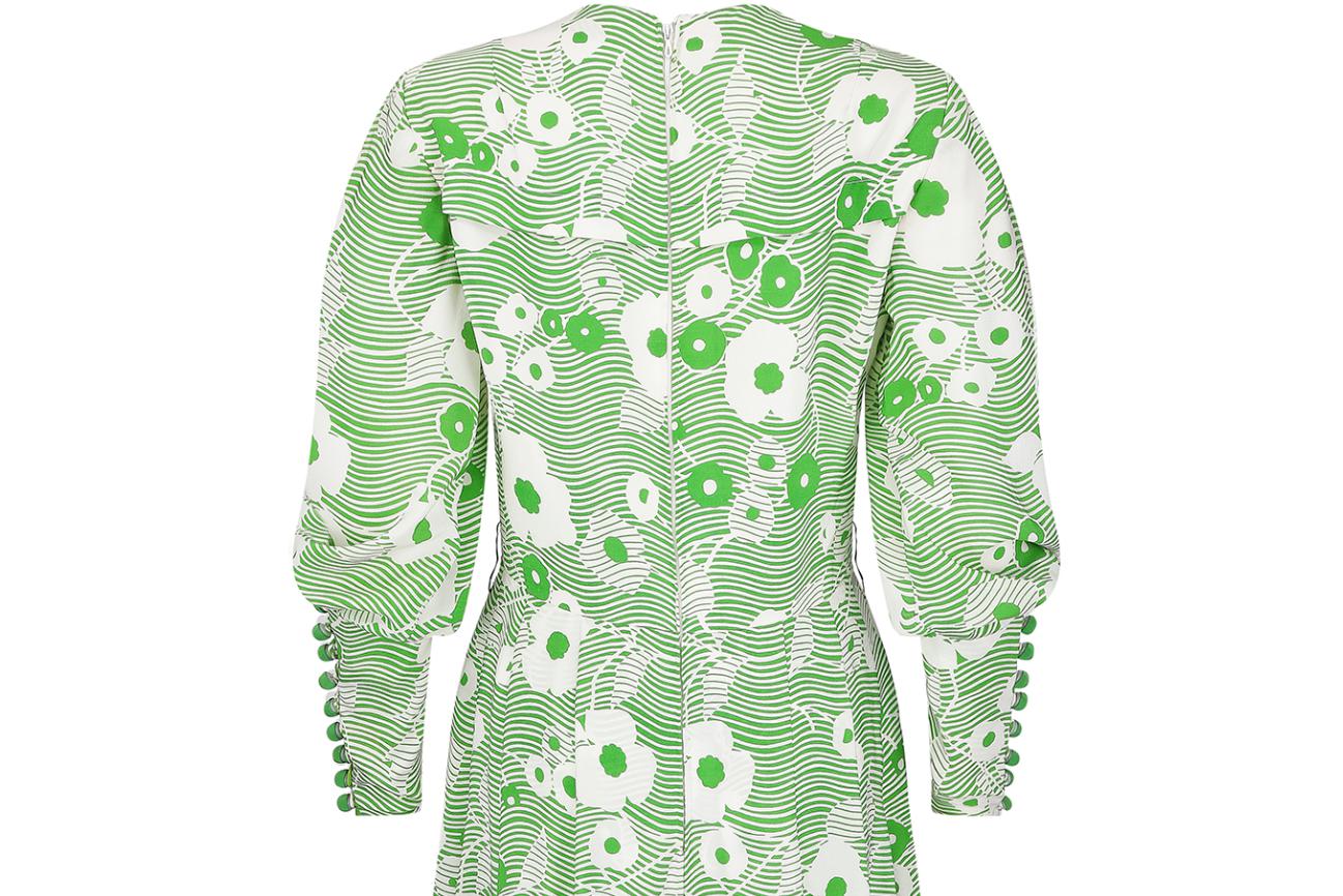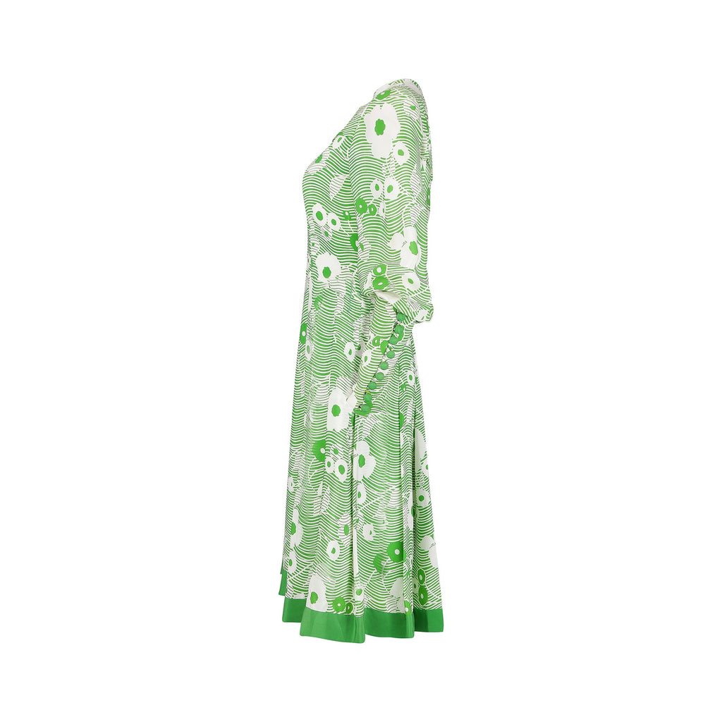 This 1970s French couture green and white dress in silk crepe features a striking floral fabric design. It has a softly rounded neckline and fastens down the back with an original white couture zip, complete with hook and eye fastening. The print consists of a pattern of abstract, wave like lines, interspersed with green and white flowers. The sleeves are long and loose to the elbow, and then narrow along the forearm, fastening with a row of green fabric buttons on each cuff. From the waist the skirt flows beautifully down to around knee length, and is finished with a contrasting green silk trim all the way around the hem. The skirt itself is pleated on the left and right sides of both front and back, which excites movement and gives the dress a floaty appearance. The skirt portion of the dress is lined in a quality white acetate.