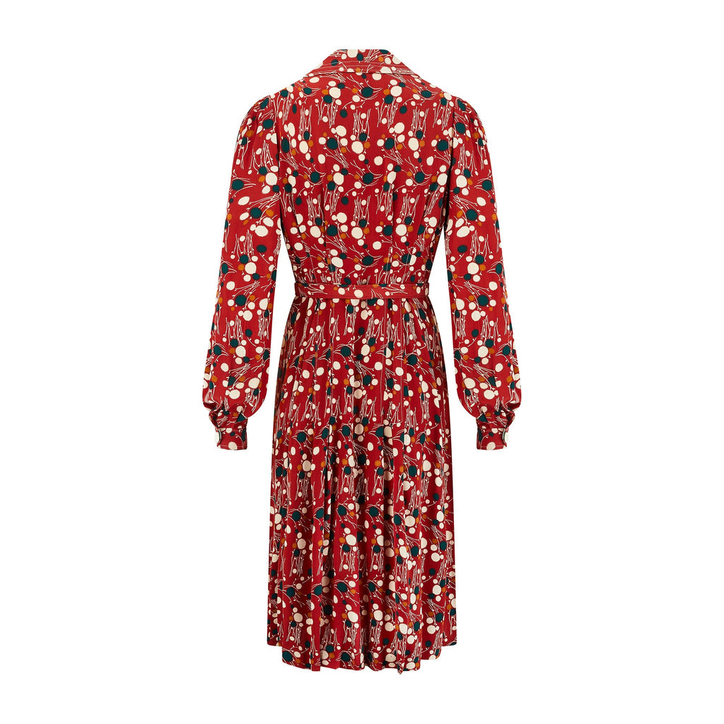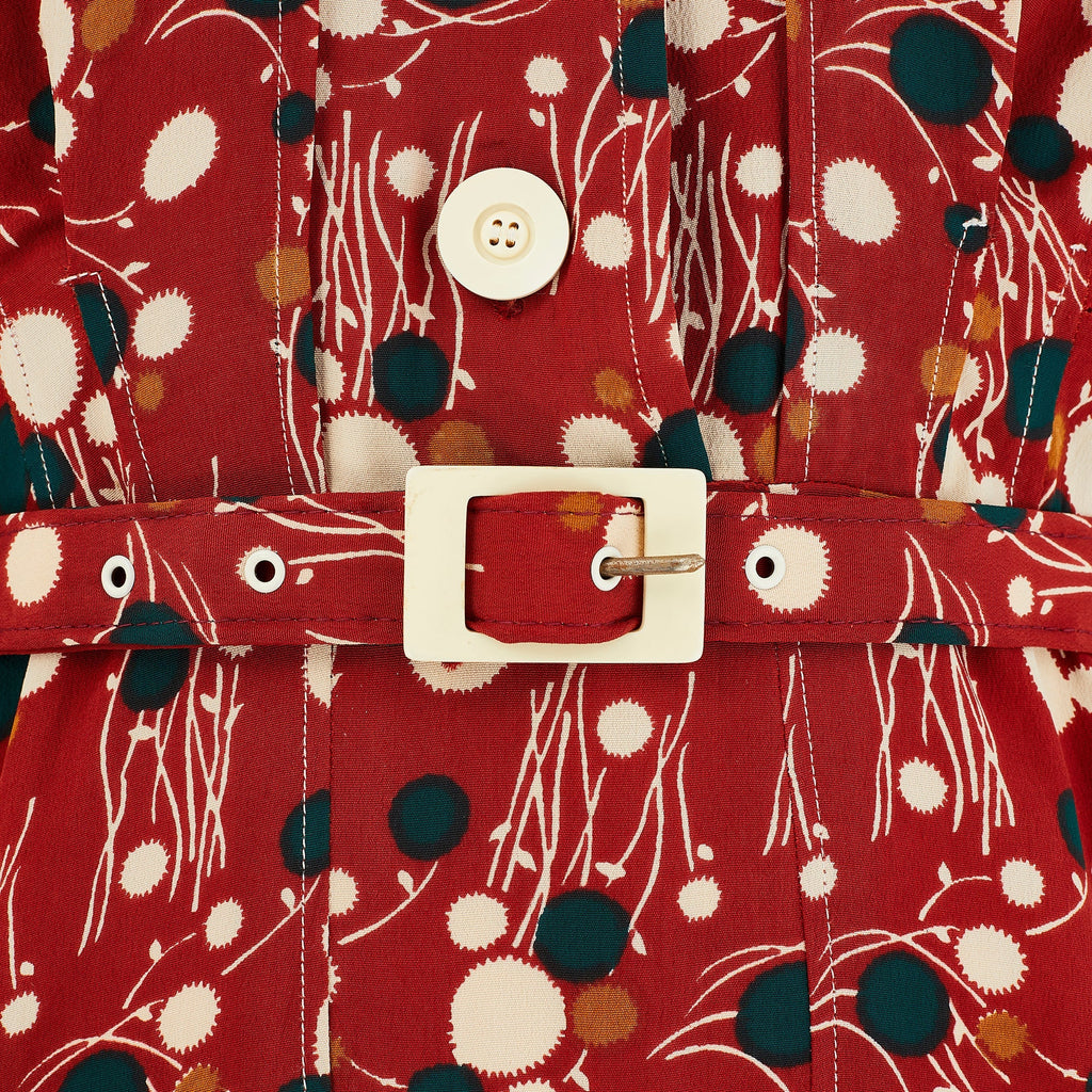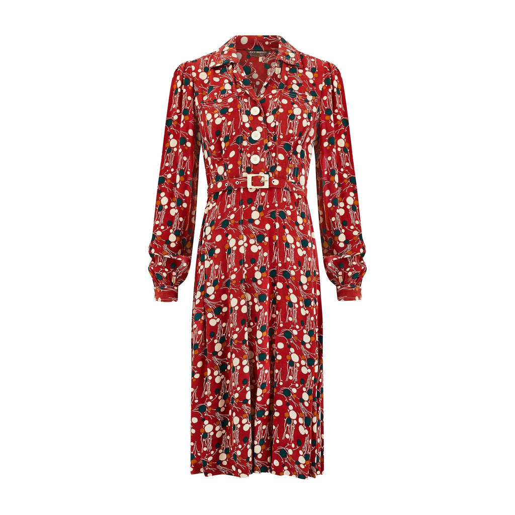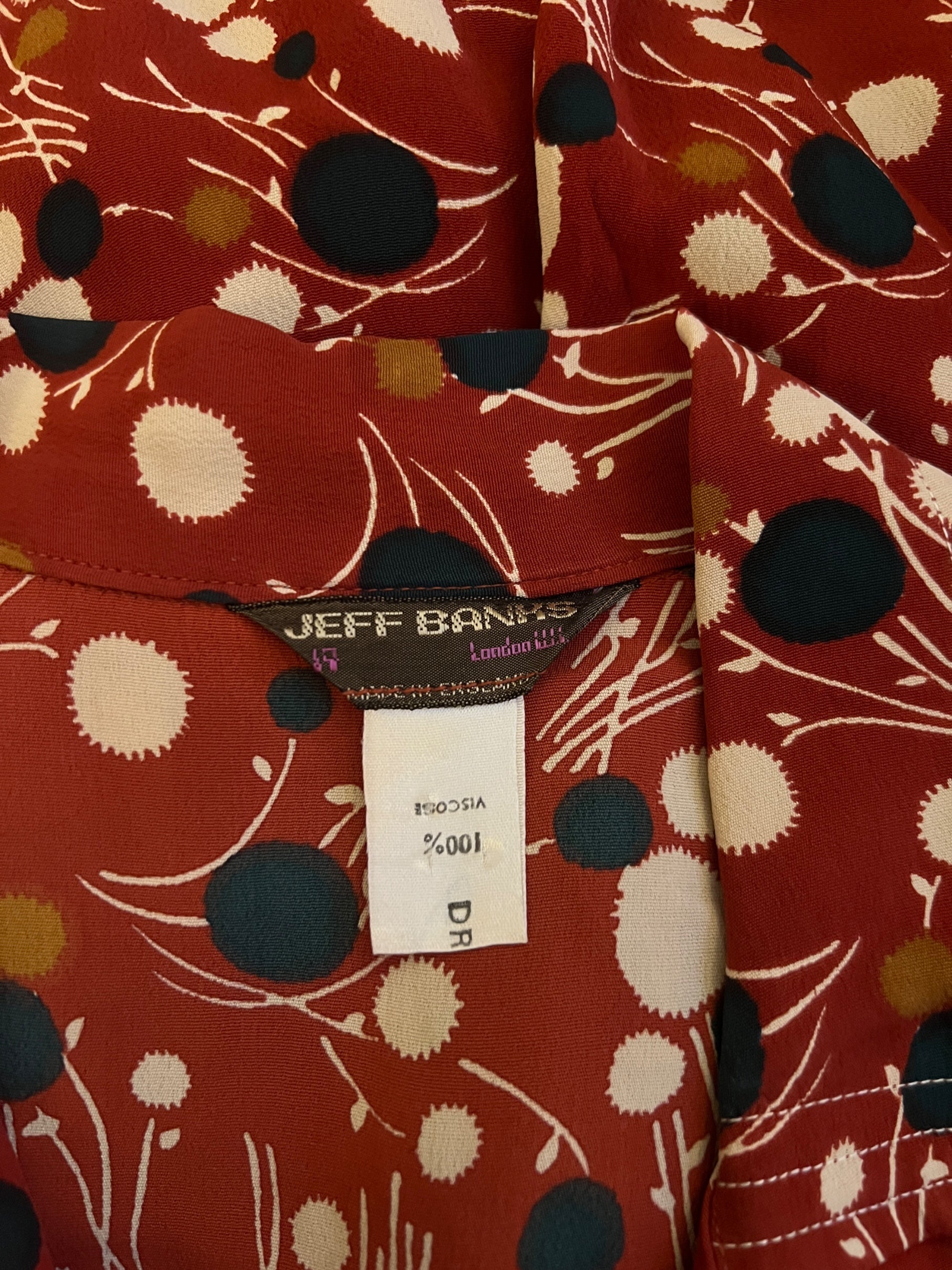 Celebrated British designer Jeff Banks designed this playful, russet toned printed dress in the mid 1970s. Tailored to a shirt-dress silhouette, this piece is both smart and feminine, with slightly ruched shoulders and subtle bishop style sleeves. Celebrated for his captivating prints, this dress is decorated with an abstract take on florals that "wallpaper" the russet background in dark green, cream and mustard. The wide lapels are a signature of the designer and the prevailing trend at the time; this example is finished with three rows of bold white running stitch. Three large plastic buttons in pale cream secure the front of the dress below a V-shape neckline. The dress has two patch pockets at the chest and a coordinating belt with a large cream plastic rectangular buckle. The dress is unlined. Notes on Designer: Jeff Banks was a pivotal member of the swinging 60s London fashion scene when he cofounded 'Clobber' in Blackheath Village, London, in 1964. The boutique carried both his own designs and the work of other designers and attracted celebrities such as Terence Stamp and Jean Shrimpton, Twiggy and some of the Beatles. It proved such a success that in 1969, he launched his own fashion label, opening the first standalone Jeff Banks shop, as well as retail outlets in twenty-two department stores including Harrods and Harvey Nichols.