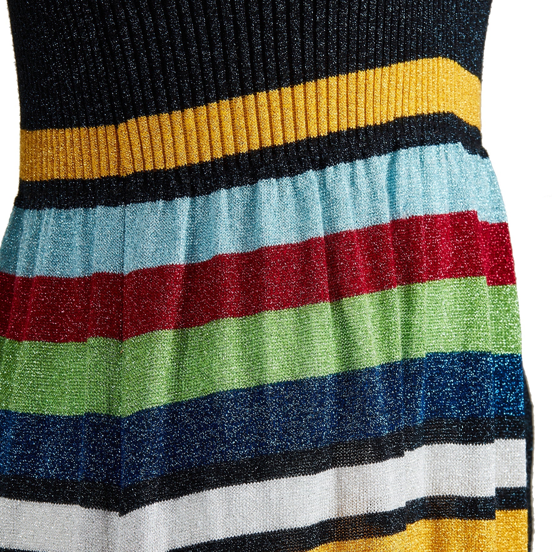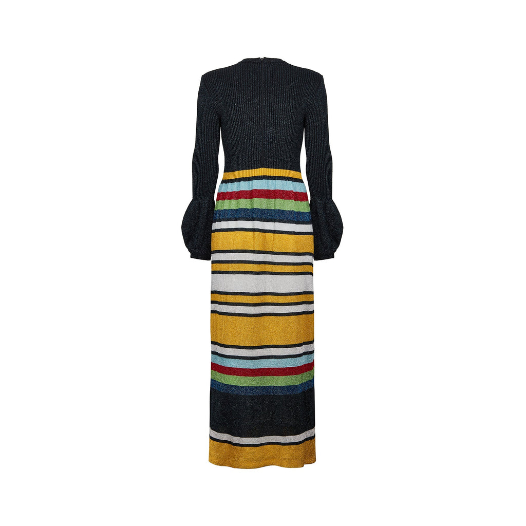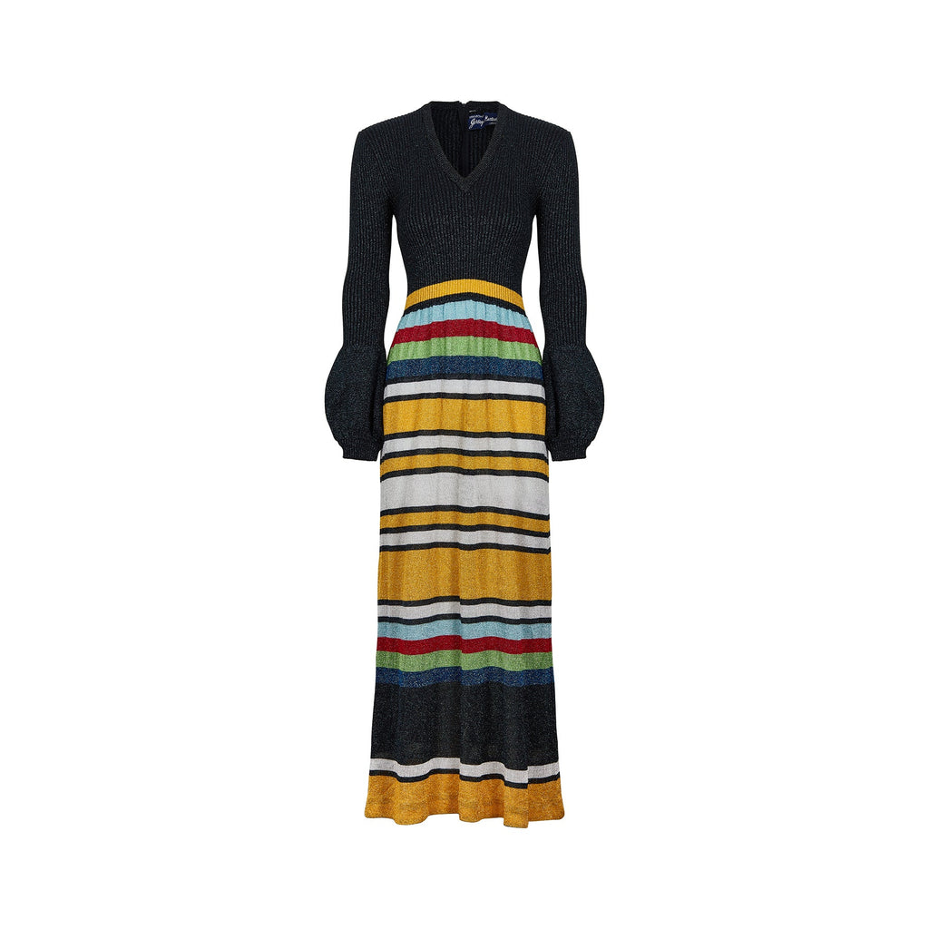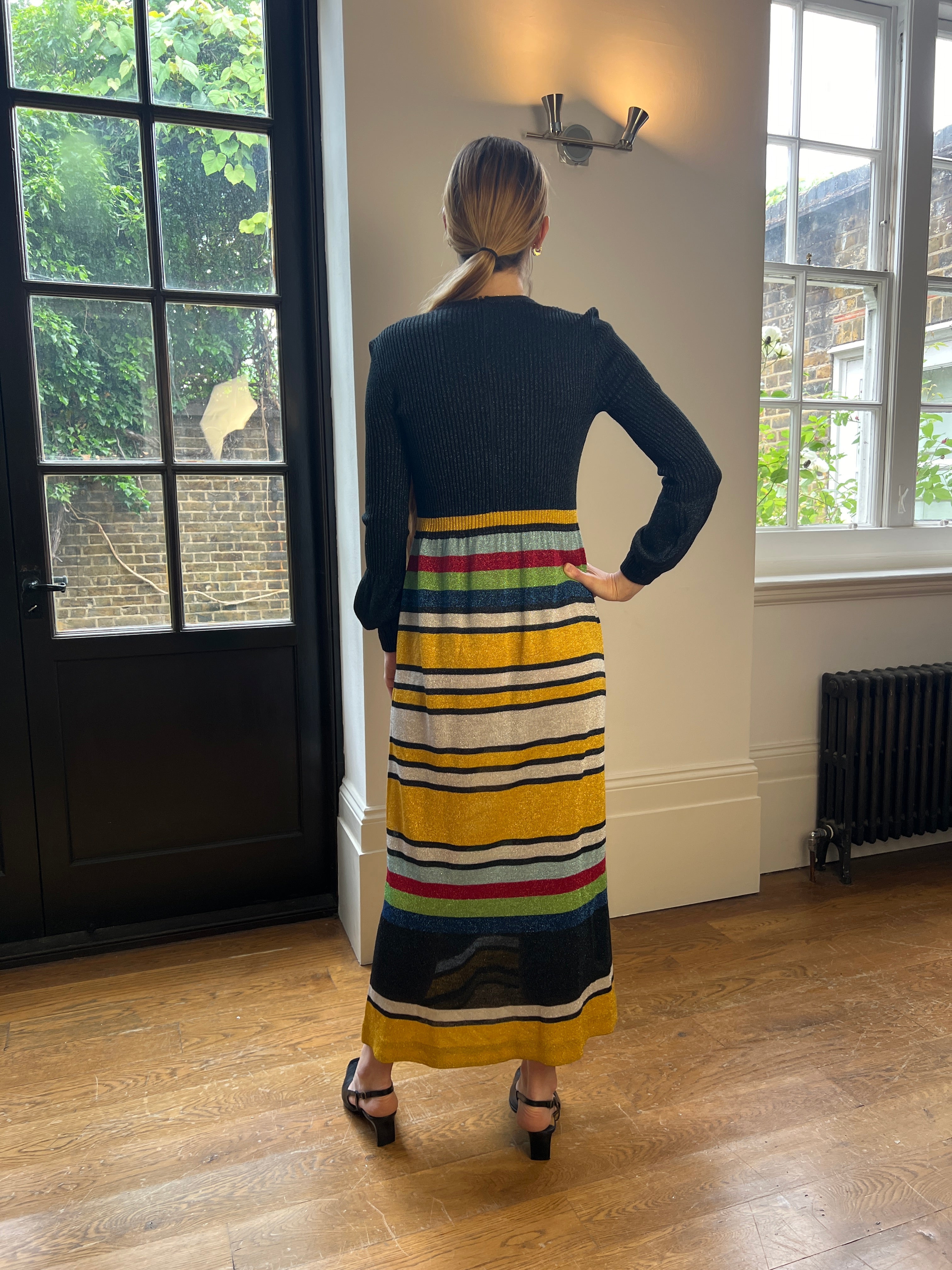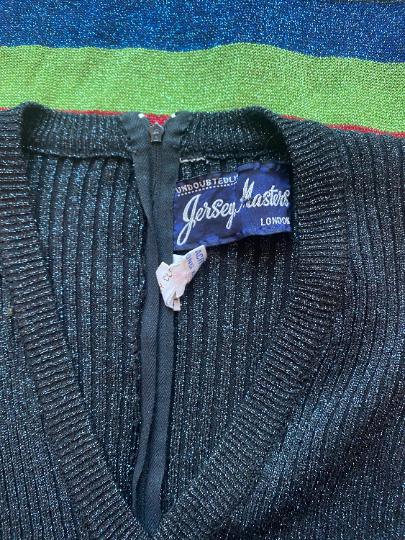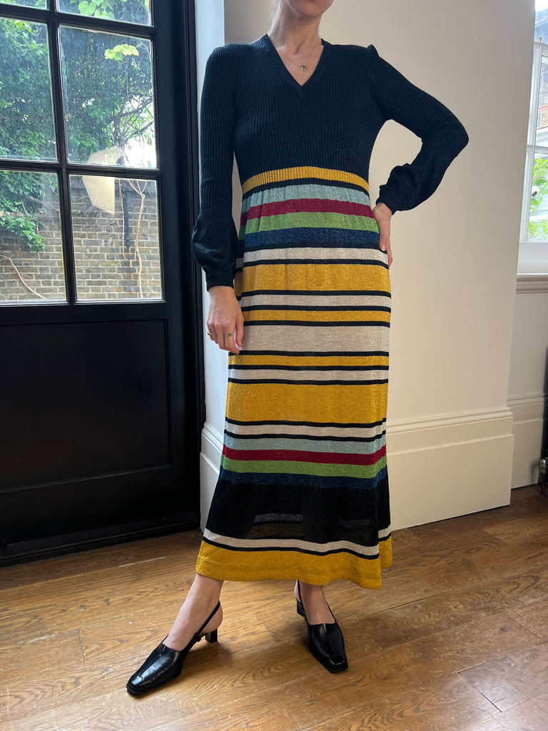 This is a really striking dress from around the late 60s, early 70s and is labelled "Lurex Acrylic, Made in the British Colony of Hong Kong". It has a tight, black metallic ribbed body and the sleeves have the most incredible balloon shape finished off with a ribbed cuff. It has a deep V neck and a gold ribbed band that sits around the waistline. The skirt is gently flared and floor length that has differing sized horizontal bands of multi-coloured knits.
