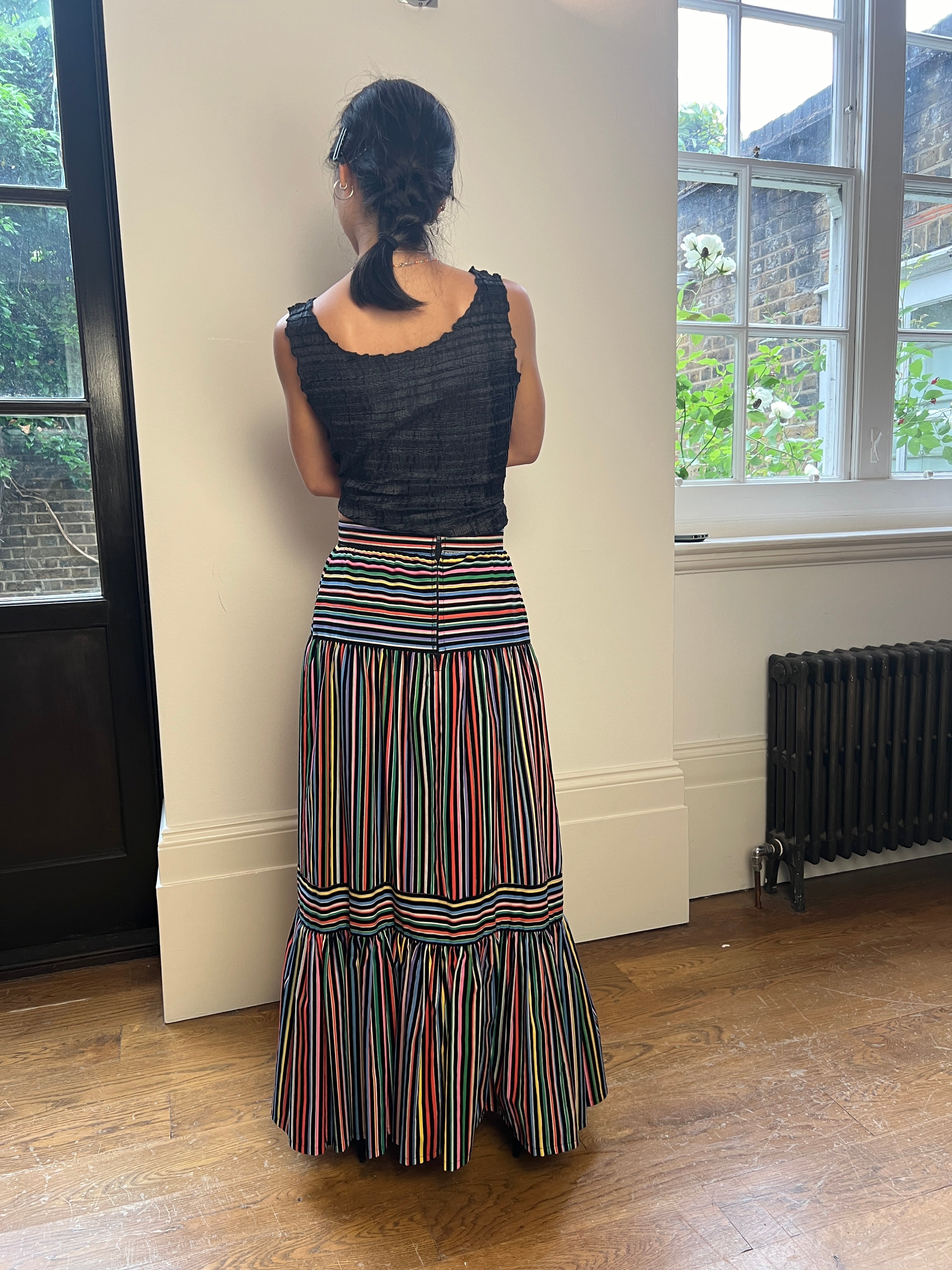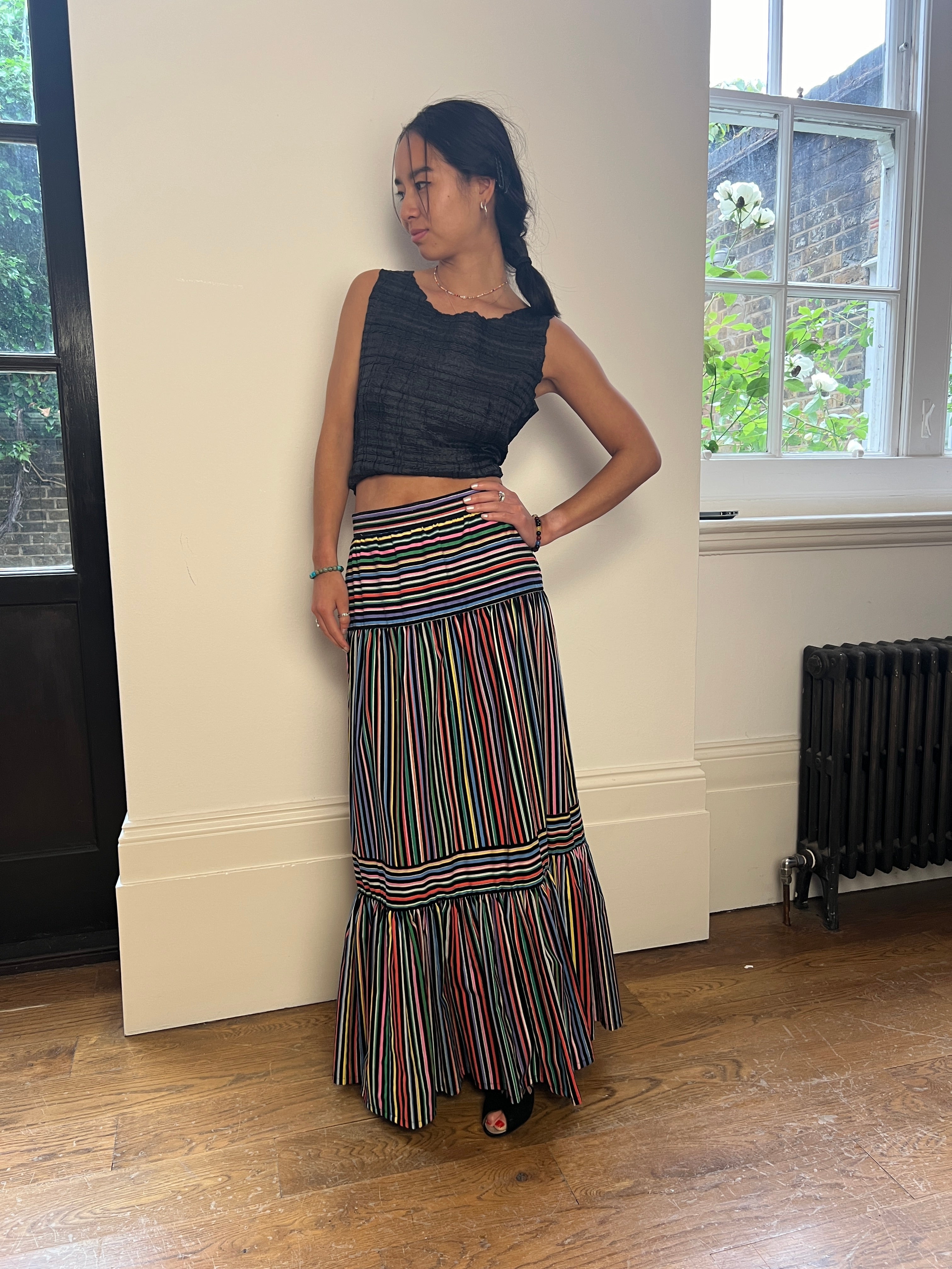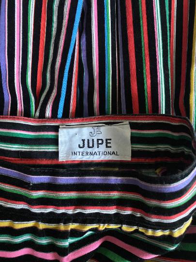 This is such a great piece of 1970s original vintage. A candy stripe cotton is embellished with black velvet bands to give this fun skirt extra oomph. The stripes alternate from horizontal to vertical from the waistband to the hem. A well positioned horizontal striped panel sits across the hips with a slimming vertical band leading down to below the knee point. Here the skirt has a band of horizontal stripes that lend the dress a super flattering silhouette. The knee seam then feeds into a puckered vertical long hem with a lovely deep flounce. The stripes are in all shades from red to pink, blue to green, yellow to white. The label reads Jupe International - jupe is French for skirt! There is no other label information but this is a quality made piece in cotton fabric with velvet embossing. It is unlined and fastens to the rear with a new zip replaced by us. This piece is in excellent vintage condition with no faults and looks virtually unworn - very Vampire's Wife! We think it will best fit a UK 8-10, US 4-6. Our model (5ft 4in / 163cm) is a UK 6-8 and this skirt was slightly roomy on her.