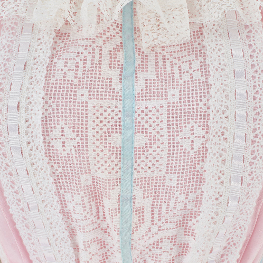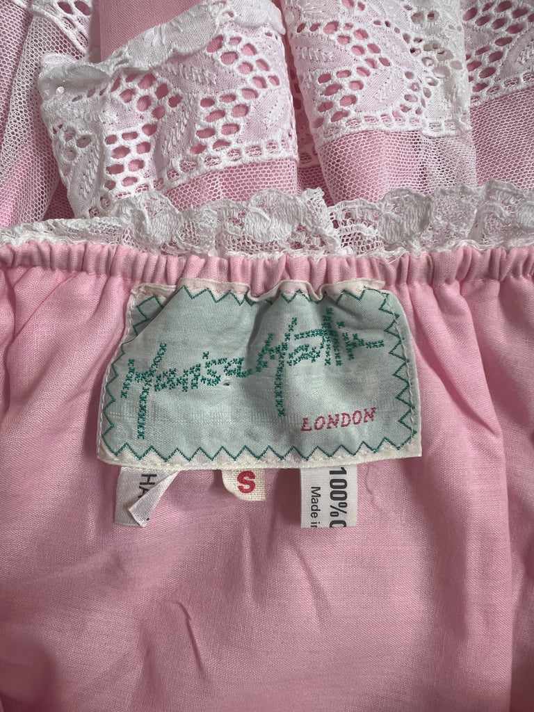 This elaborate top was designed in the 1970s by London boutique Marisa Martin. The brand was known for high-end garments made using a patchwork of fabrics and embellishments. Crafted in a bohemian luxe peasant style, it has an elasticated neckline which can be worn rounded or stretched to an off-shoulder fit. The neckline is trimmed with lace and net ruffles in white. It has large frothy bell-sleeves crafted from sheer white cotton and detailed with strips of white lace and ribbon. The cuffs are gathered and elasticated, detailed with peach satin over the seam. The cuffs themselves are made from ruffled white lace. The body of this decadent top is crafted from gauzy white cotton and adorned with panels of white lace, white ribbon, baby blue ribbon and white crochet. It has an elasticated waistband and a ruffled peplum waist layered with lace. The top is lined in bright candy-pink cotton which can be seen through the sheer cotton top layer, rendering it pale pink.