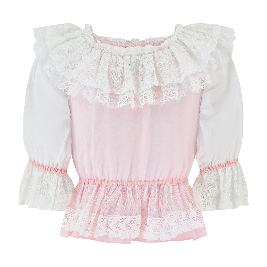 1970s Marisa Martin Pink and White Lace Ruffle Blouse